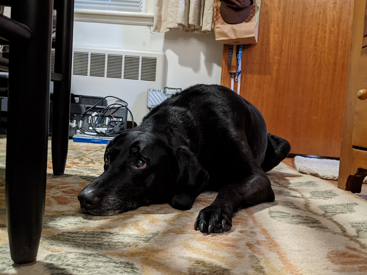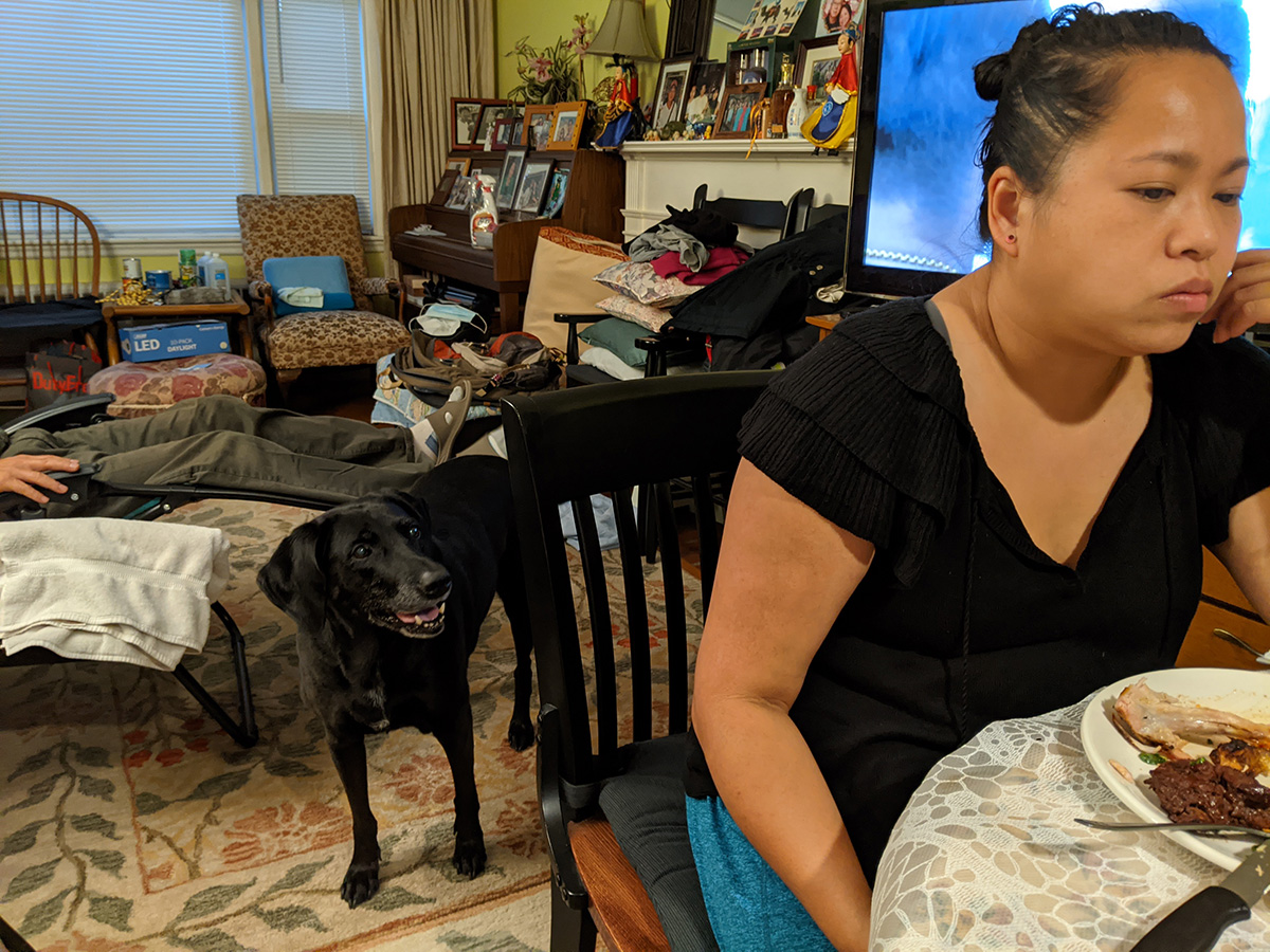 i had this sweet chili sauce that i put on half of the drumsticks (it was exactly like your typical thai sweet chili sauce), it made them taste so much better as the drumsticks themselves didn't have much flavor other than the brine my mother soaked them in overnight. my sister also was home, she cooked some sweet bourbon steak tips afterwards. so also brought some curry drumsticks she'd marinated, but i prefer my sweet chili chicken. we ate while watching hailey go around the table, trying to see if she could get some sympathy scraps.