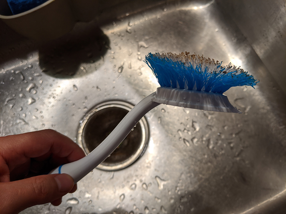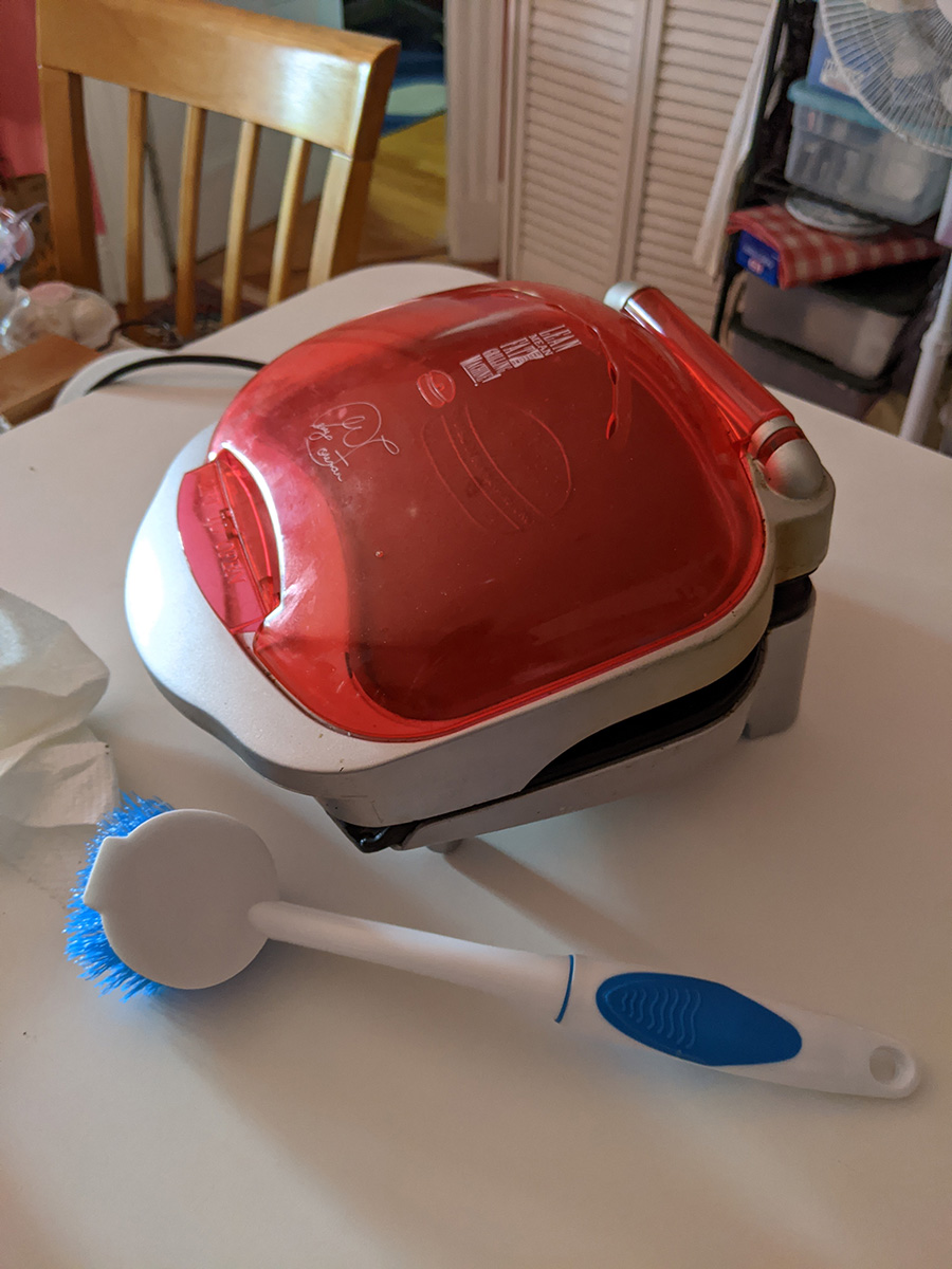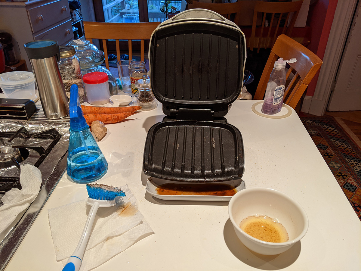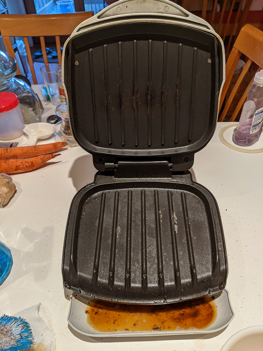 i tried to clean my old foreman grill. i went to the dollar tree this morning to get a scrubbing brush. i then let the grill preheat before spritzing it with water. after the steam treatment, i sprayed again and used the brush to scrap off the remaining residue. i then repeated this treatment several times. it was a real mess, water and oil splattering everything, i nearly burned myself a few times from the steam. i also killed the brush because the cheap plastic bristles wasn't designed to handle the heat so they deformed. i managed to remove a decent amount of residue, but it revealed parts of the grill plates where the non-stick coating has come off. i definitely need to upgrade my grill game.