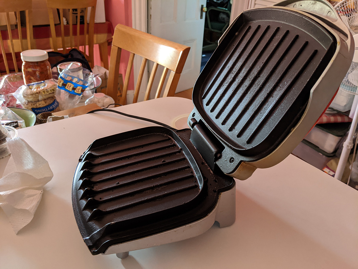 last night i went online looking for a foreman grill replacement, something that has removable plates for easier cleaning. the one that i currently have looks like an imac and has a red plastic bun warmer on the top. it was a groomsman present from manny from june 2003 so i've had it for 17+ years. i wasn't even sure if the company still existed, but they're still making grills, just that george foreman doesn't seem to be their celebrity endorser anymore even though his name is still on the product. i went to their website and something caught my eye: the contact smokeless digital grill. it looked like a foreman grill from the future, like a chonky short flatbed scanner. for one thing, it wasn't sloped; fat drippings go down holes on the cooking plates which are removable. but how can it be smokeless? i looked at some of their ads, it said it's 85% less smoke. so yeah, you can't grill something without smoke, but i'll take anything that promises to be less smoky. i even saw a video comparing a regular foreman grill with a smokeless grill and there was definitely less smoke. it also had a digital touchscreen to set the temperature and the timer, something i never had with my old foreman with the plastic bun warmers.