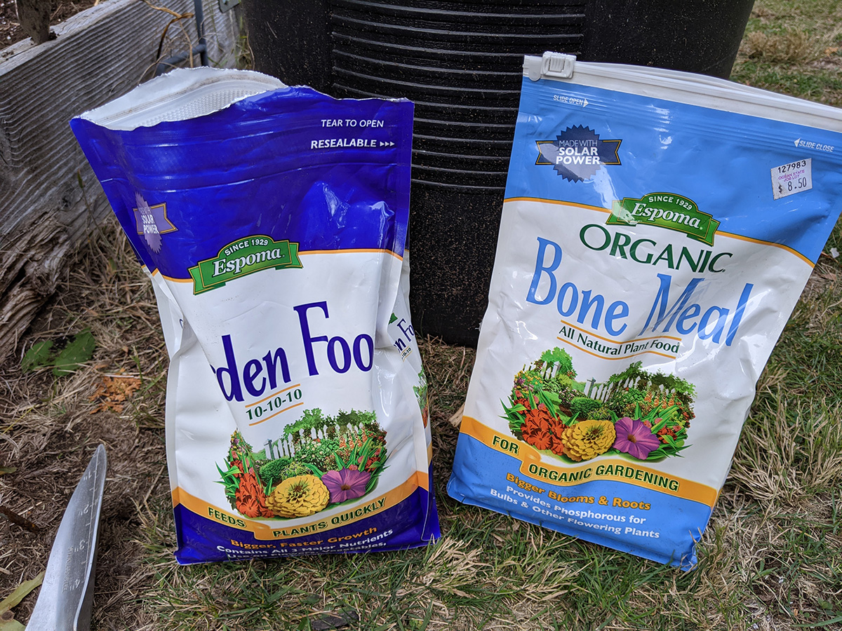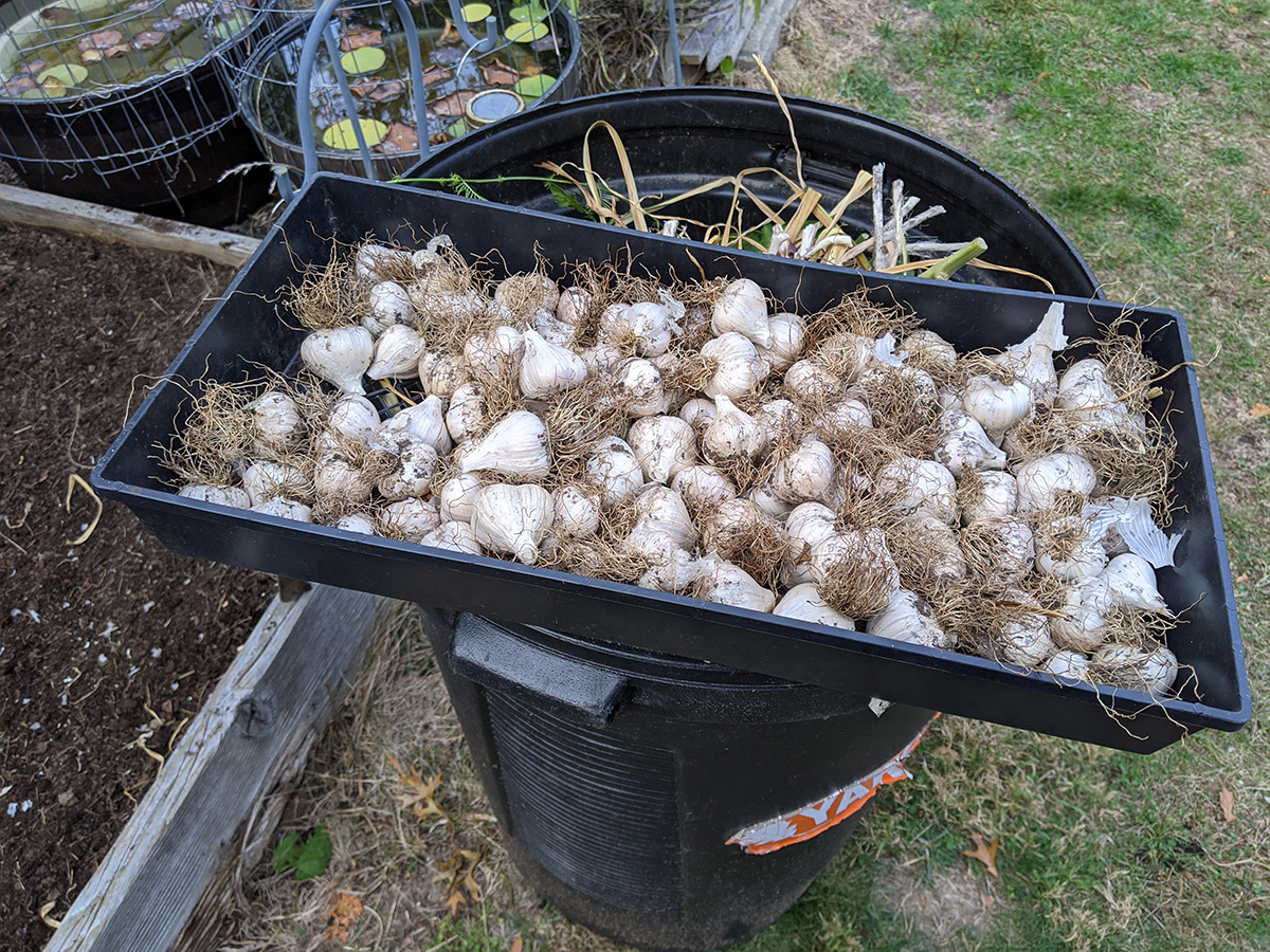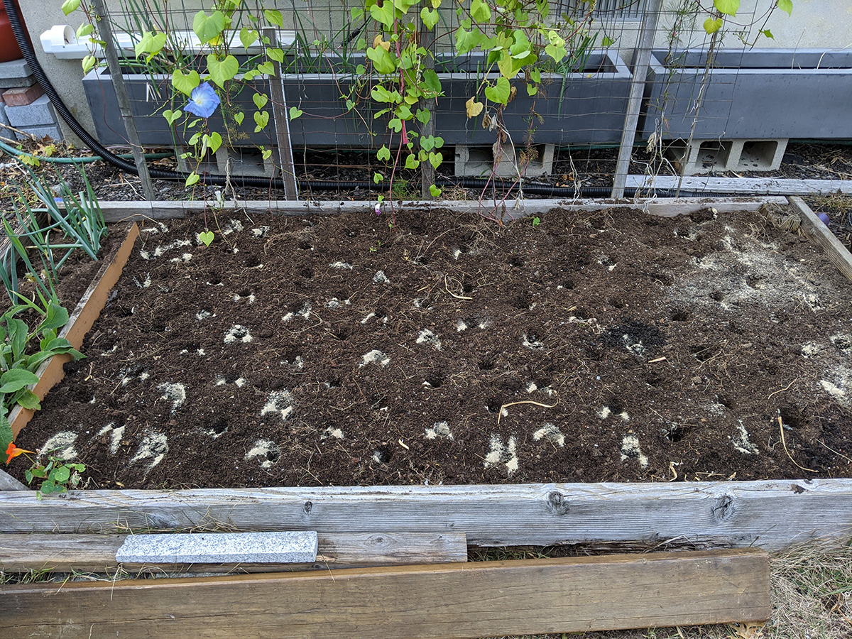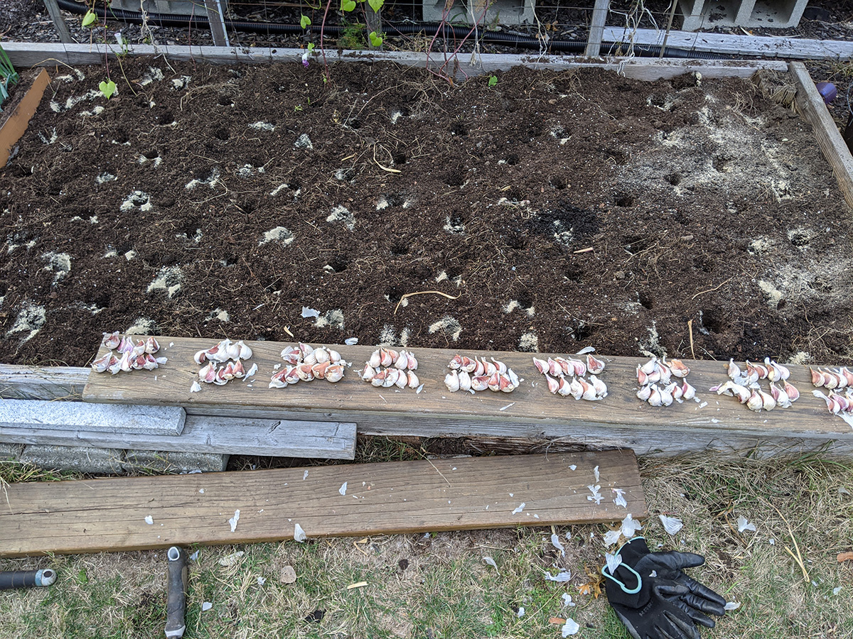 after the game was over i came back outside and sprinkled some espoma garden food (10-10-10) into the garlic bed before raking it into the soil. using the handle of a trowel, i made about 100 holes in the raised bed, each 3" deep and 6" apart. i then snipped off the garlic stems (curing since early july) and collected the largest garlics for growing. though these garlics were small, some of the individual cloves were large, so there still may be hope that i could get some big garlics next season. into each hole i added some bone meal before planting the cloves. so hopefully by next july i might expect to see some garlics. this is my third planting; if they're still not doing well i'm going to give up on growing garlics.
