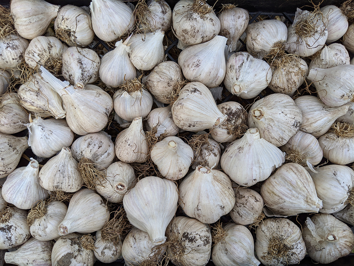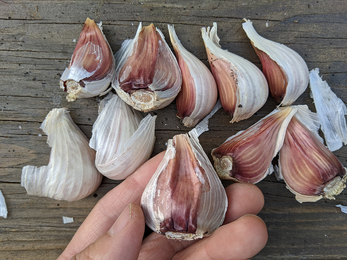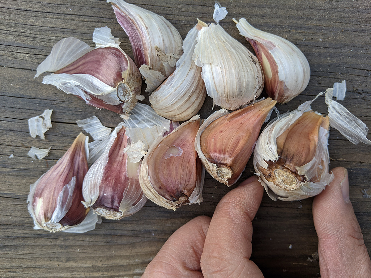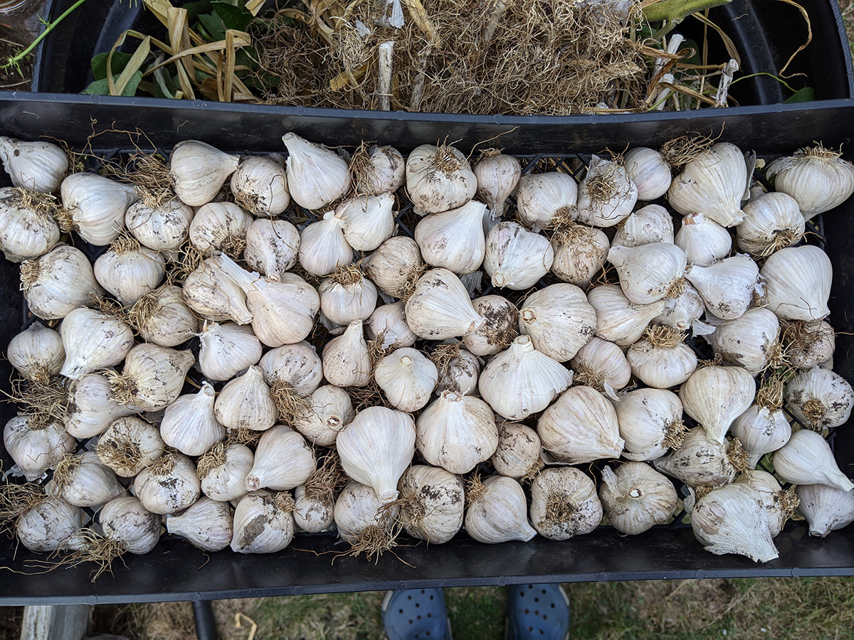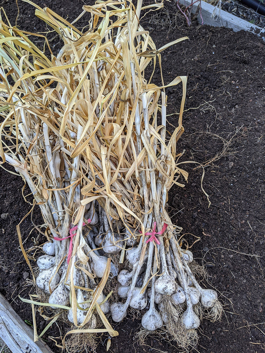 after the game was over i came back outside and sprinkled some espoma garden food (10-10-10) into the garlic bed before raking it into the soil. using the handle of a trowel, i made about 100 holes in the raised bed, each 3" deep and 6" apart. i then snipped off the garlic stems (curing since early july) and collected the largest garlics for growing. though these garlics were small, some of the individual cloves were large, so there still may be hope that i could get some big garlics next season. into each hole i added some bone meal before planting the cloves. so hopefully by next july i might expect to see some garlics. this is my third planting; if they're still not doing well i'm going to give up on growing garlics.