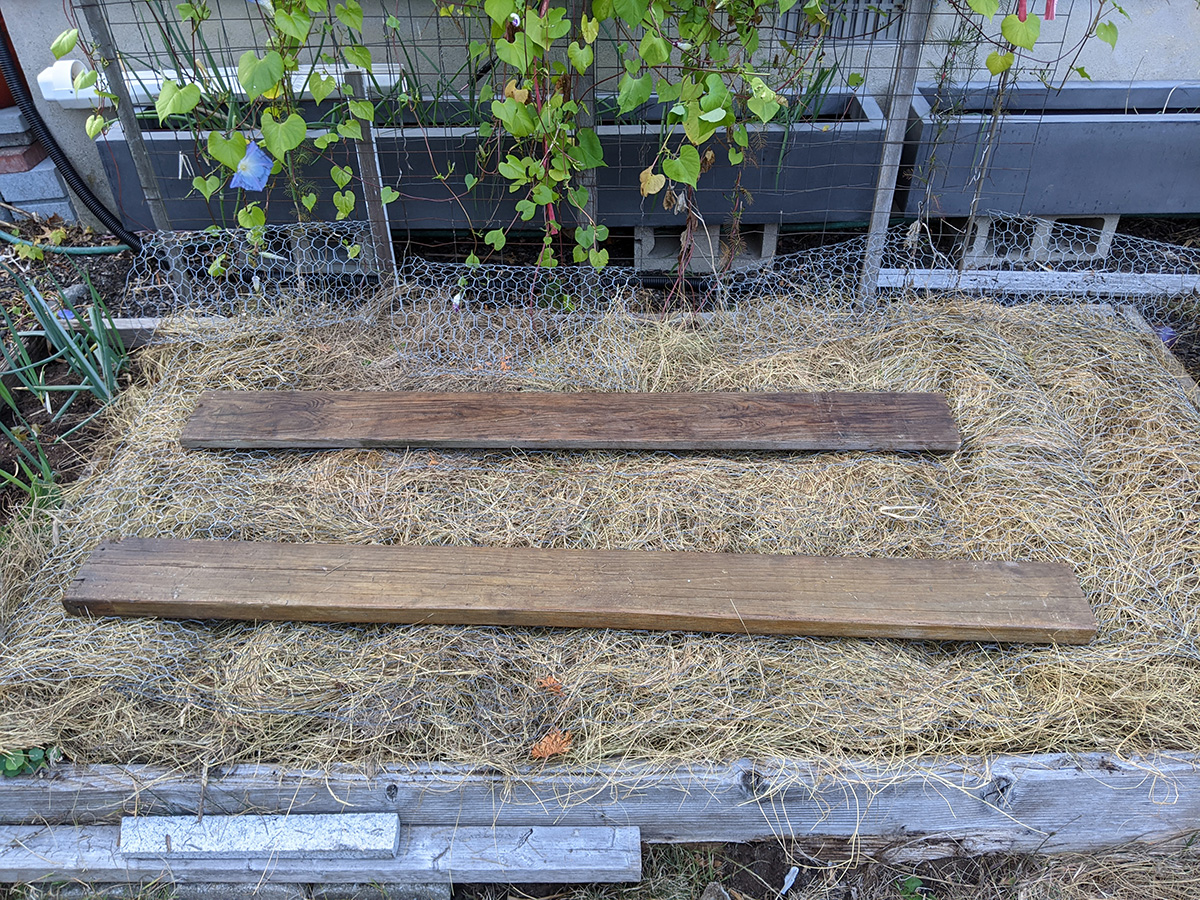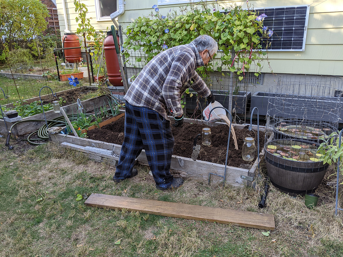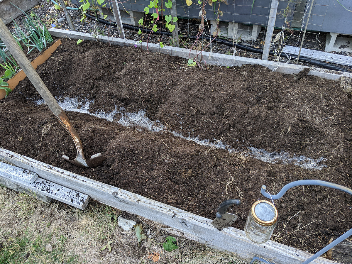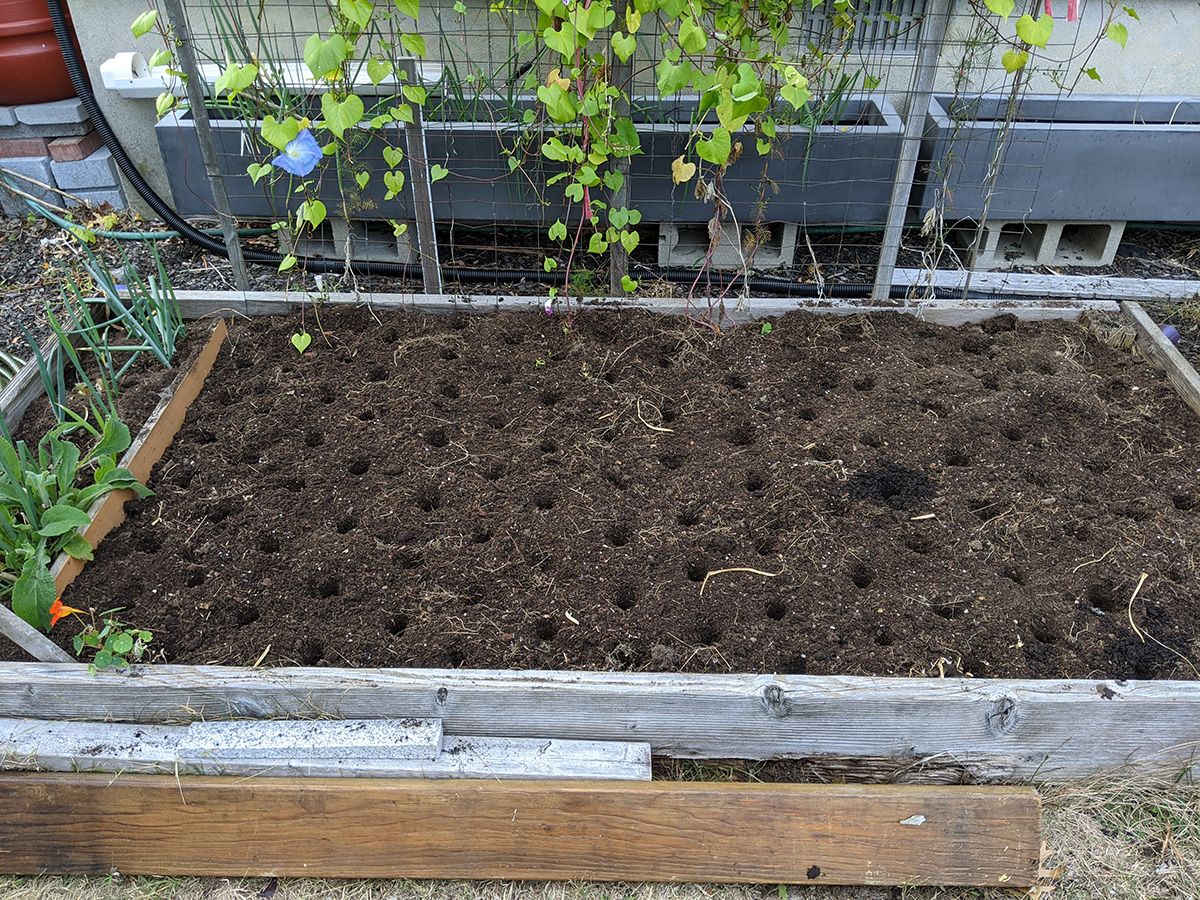 during halftime i was out in the backyard with my father tilling raised bed 2 and preparing it to be a garlic bed. after pulling up all the plants, we added two bags of garden soil, two containers of compost, and my father drizzled some fermented soy bean mush which smelled like a chinese public toilet.
