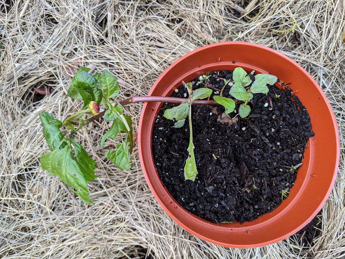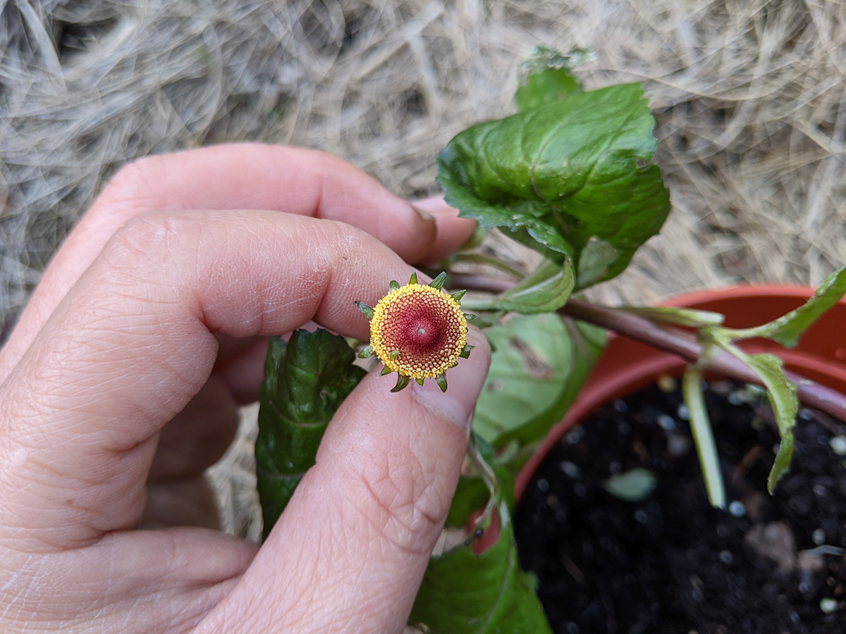 after cleaning RB4, i noticed a plant in the pot where i tried to germinate some toothache plant seeds maureen had sent me a few months ago. they never germinated after 2 months so i gave up. imagine my surprise when i saw the toothache plant and one telltale flower! i'll try to keep it alive indoors over the winter.