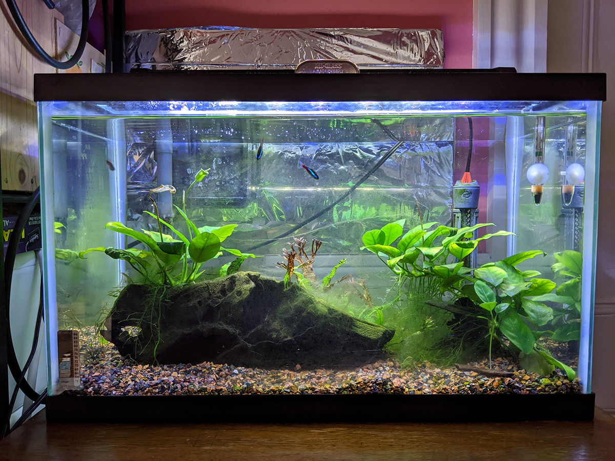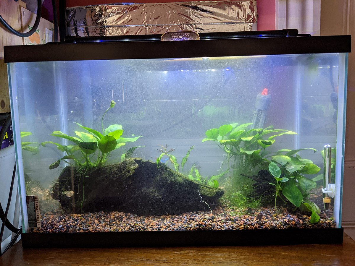 i cleaned my aquarium today: pulled out all the hair algae, scrubbed off the glass algae with a magic sponge, changed out the activated carbon, used the aquarium water to feed my houseplants. i really ought to clean it more often, like once a week, but i can never get around to it. i don't remember the last time i cleaned, but according to my blog, it could've been as long as july.
