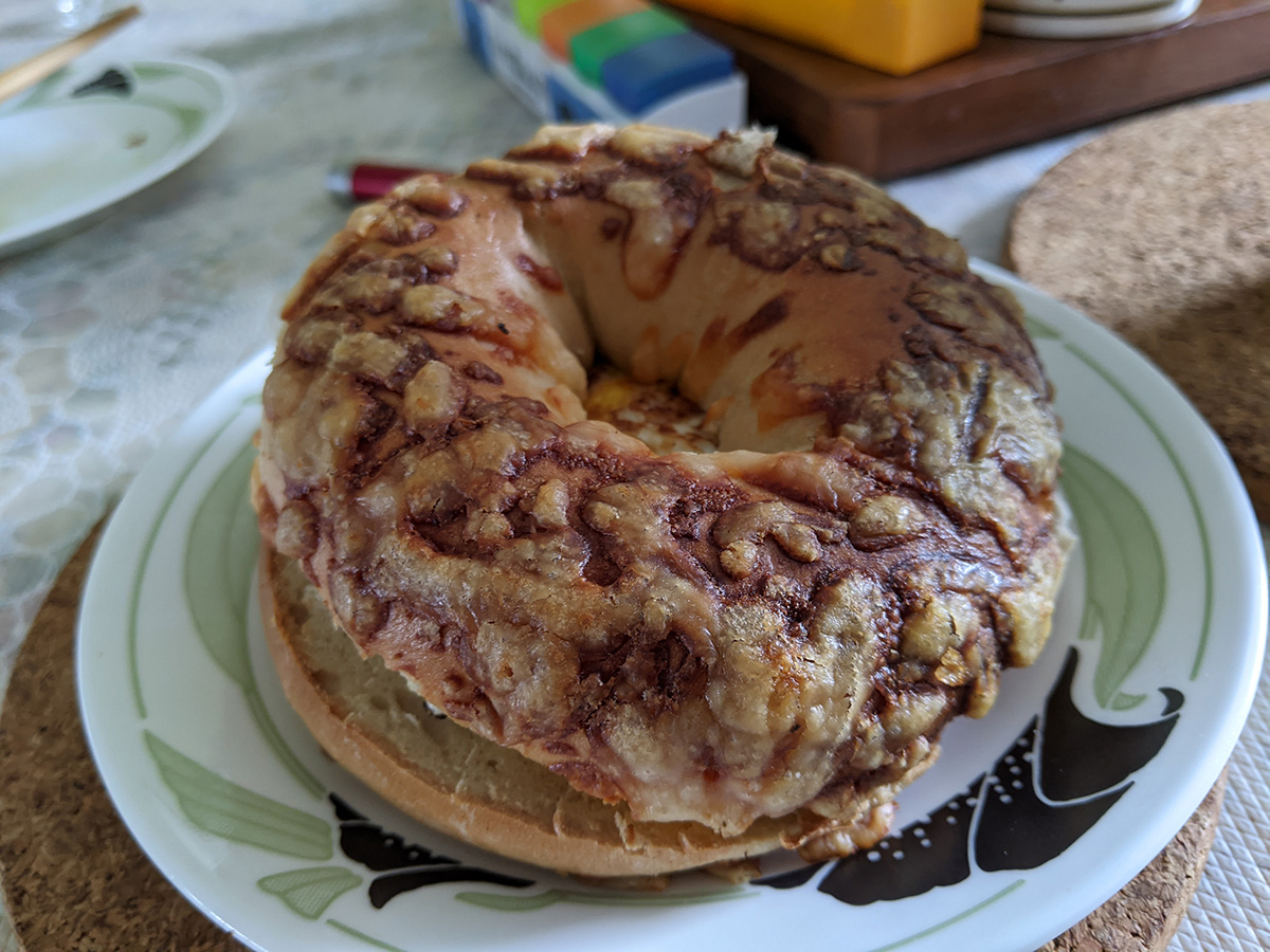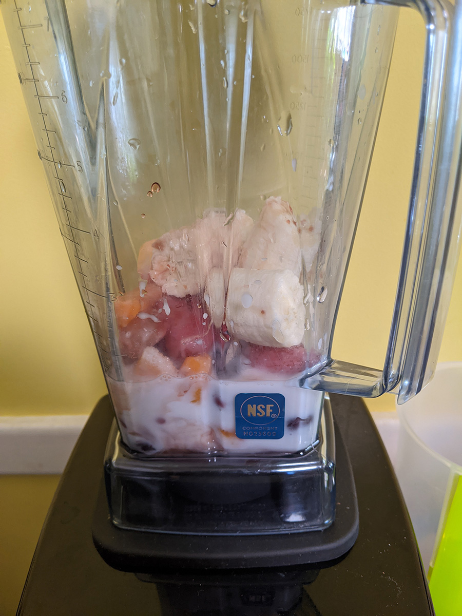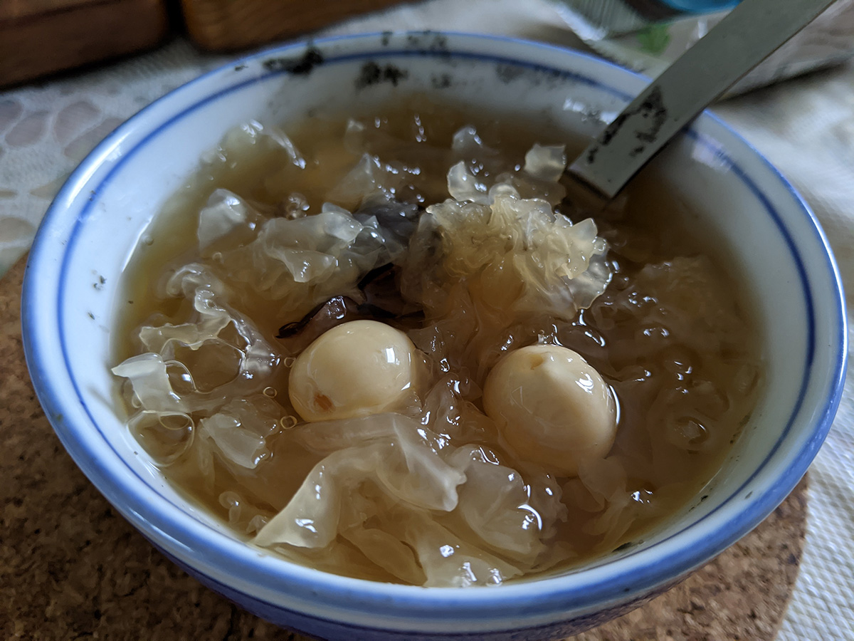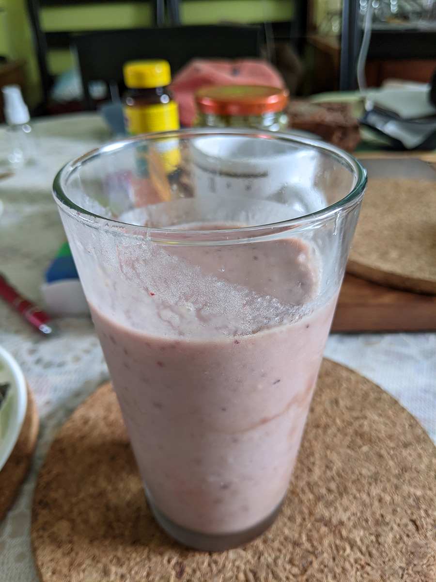 i had a cheese bagel with a fried egg for lunch, along with a smoothie that was blended in the vitamix with the newly repaired blade assembly. the smoothie included almond milk, a banana, some frozen fruit, a slice of ginger, and a bit of black cherry juice. even though most of those ingredients are usually what i put into my own smoothies, they tasted somehow better coming out of the vitamix blender. later i had some white jelly fungus for dessert.