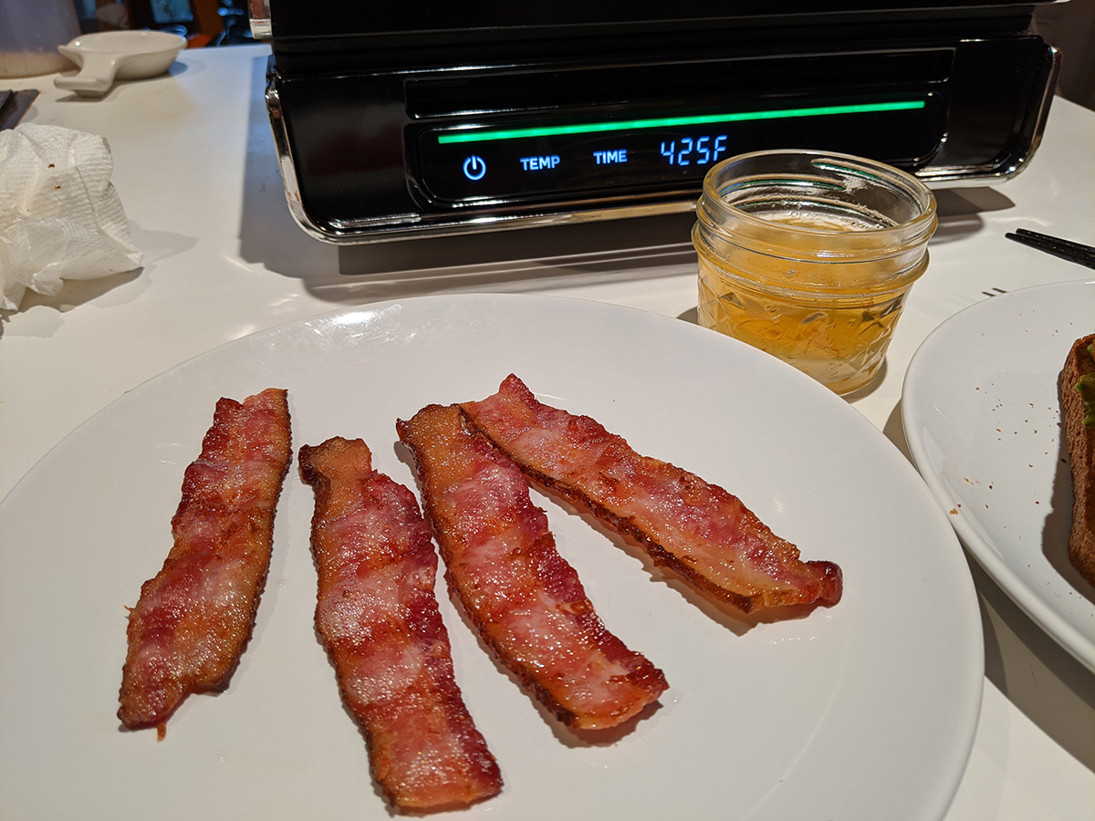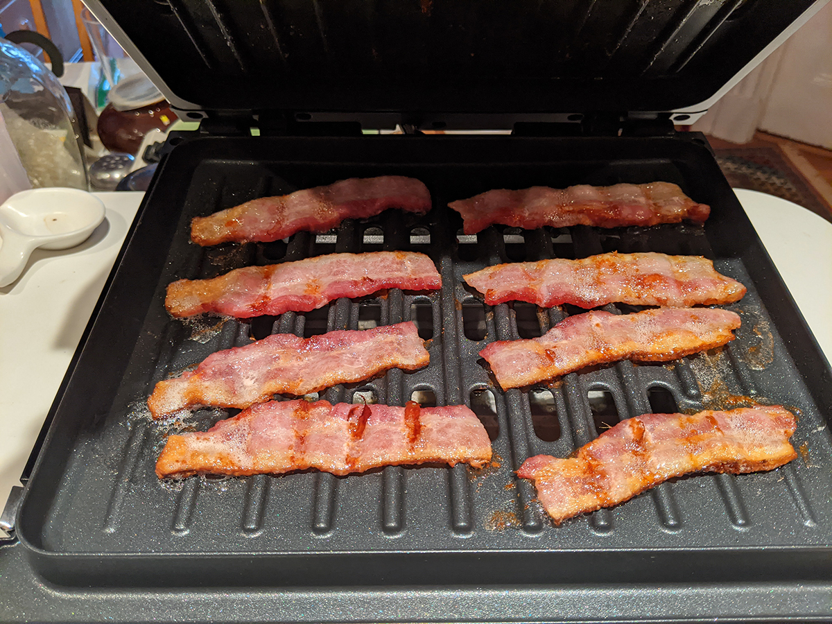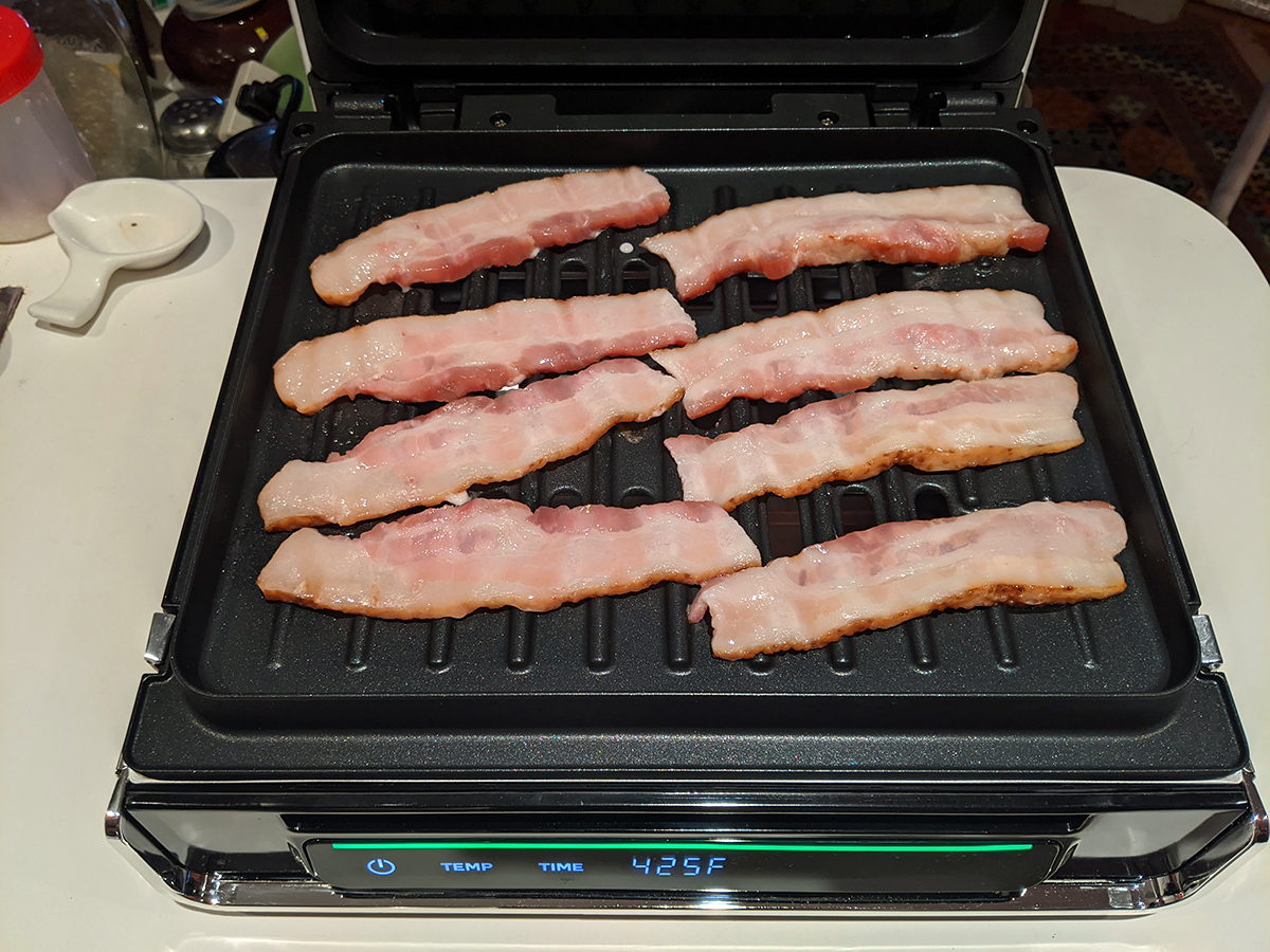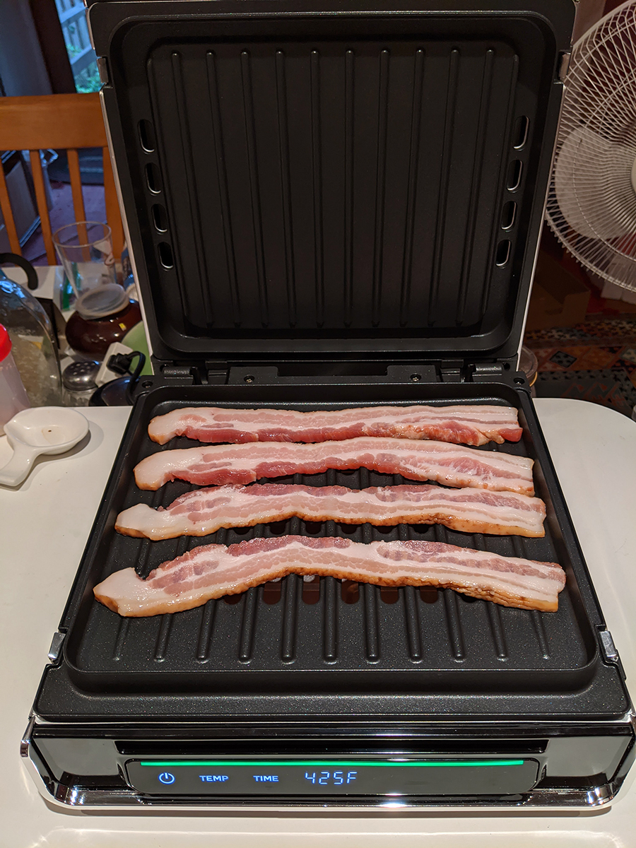 the smokeless grill works surprisingly well for bacon. i don't know i never attempted to cook bacon using my old foreman grill. i think it's because it was too small and i'd have to cook in multiple batches since i typically like to cook all my bacon at the same time so they can only stink up the house once. with the bigger cooking surprise on the smokeless grill, i can cook 6 long strips of bacon at the same time. and because the top and bottom are covered, i don't have to worry about splatter, just the smoke, which i can blow out using fans. finally cooking bacon can be accessible! i cooked 4 strips of bacon this time, 2 for the sandwich, 2 for later. i ended up cutting them in half so i had 8 smaller pieces of bacon to cook. i basically set the bacon in the grill, used the fans to blow out the smoke, and went to go watch tv while they cooked, couldn't be easier.