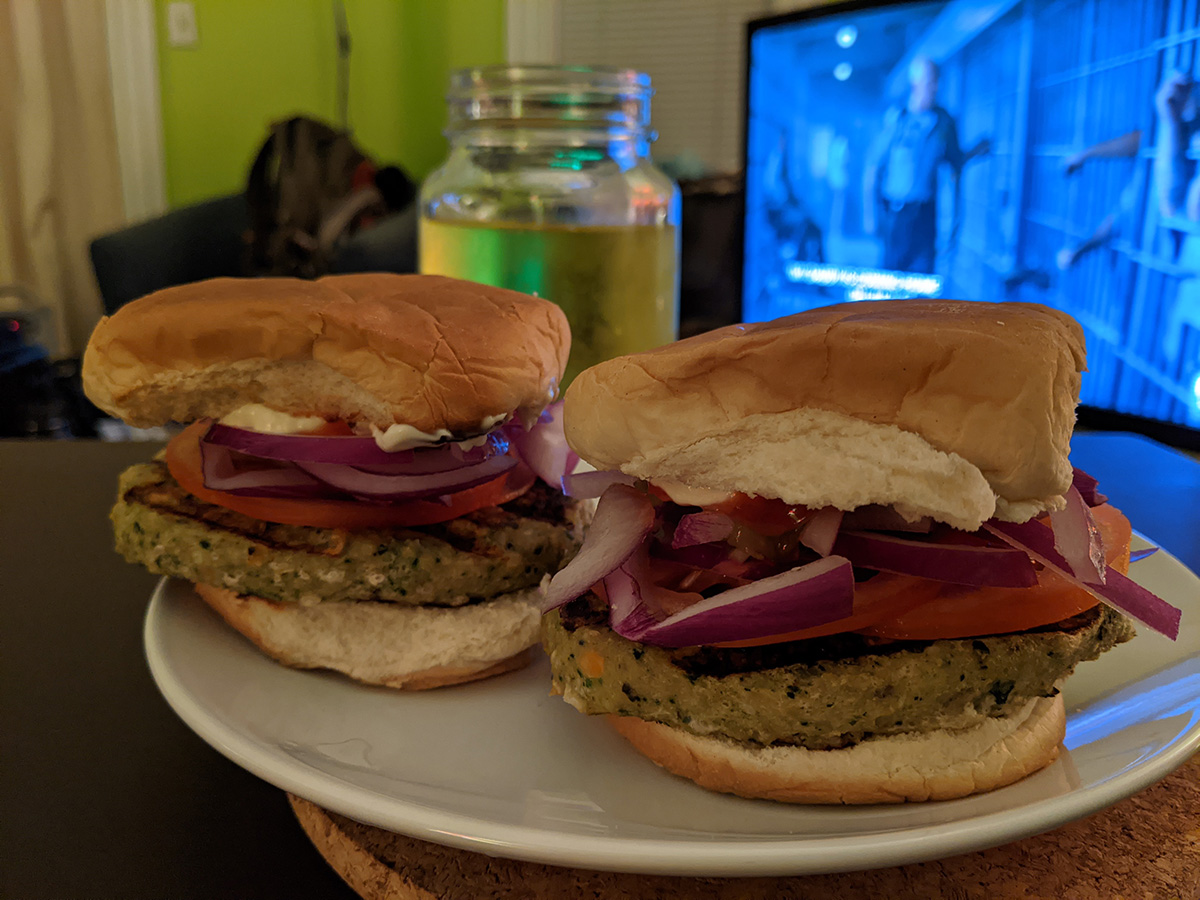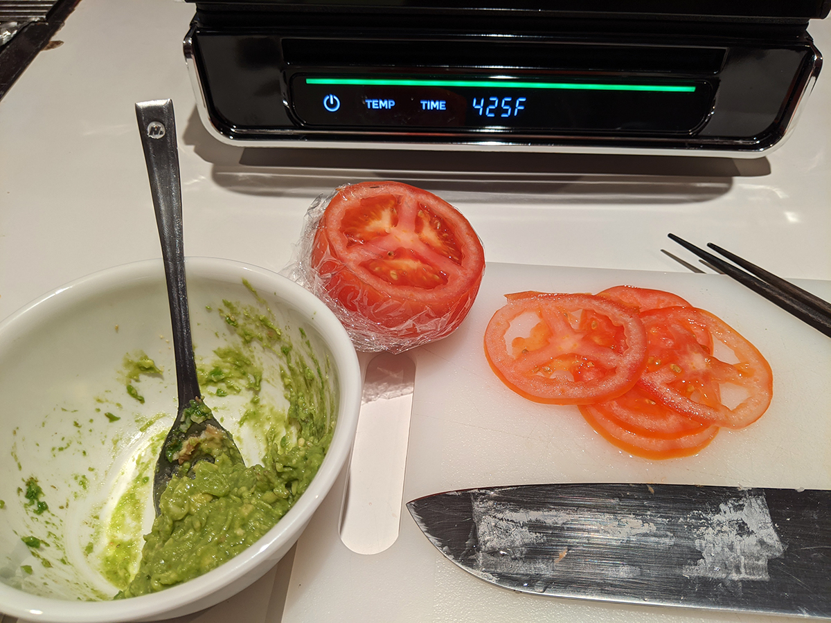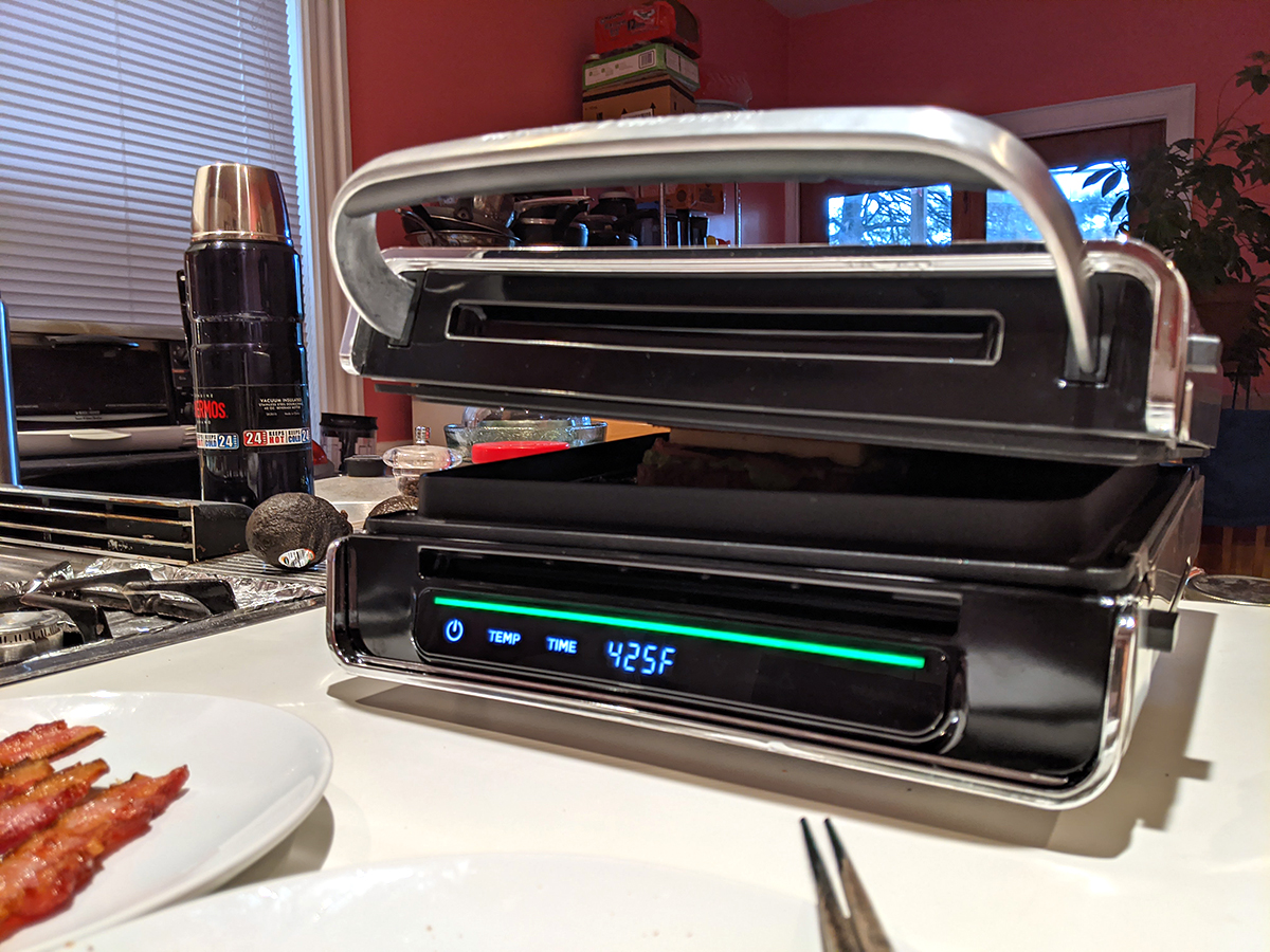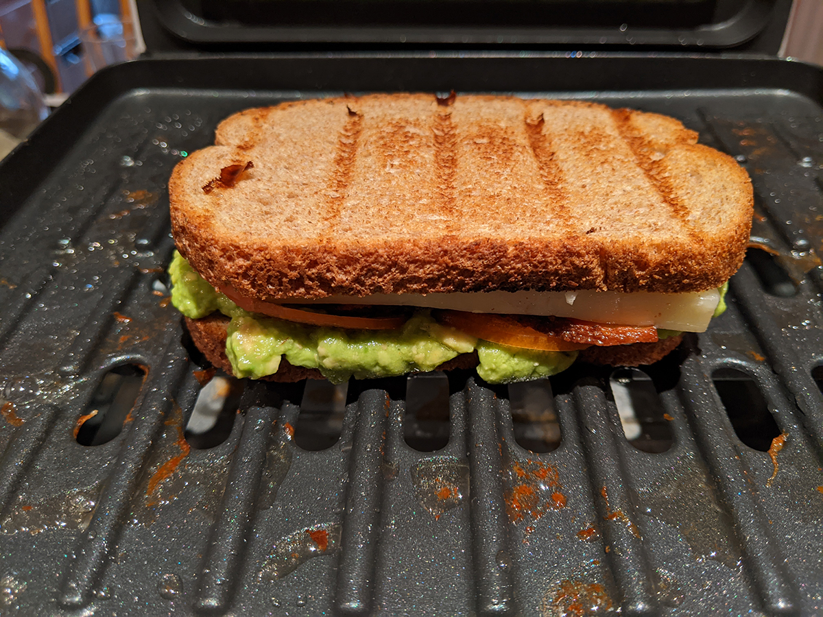 the smokeless grill works surprisingly well for bacon. i don't know i never attempted to cook bacon using my old foreman grill. i think it's because it was too small and i'd have to cook in multiple batches since i typically like to cook all my bacon at the same time so they can only stink up the house once. with the bigger cooking surprise on the smokeless grill, i can cook 6 long strips of bacon at the same time. and because the top and bottom are covered, i don't have to worry about splatter, just the smoke, which i can blow out using fans. finally cooking bacon can be accessible! i cooked 4 strips of bacon this time, 2 for the sandwich, 2 for later. i ended up cutting them in half so i had 8 smaller pieces of bacon to cook. i basically set the bacon in the grill, used the fans to blow out the smoke, and went to go watch tv while they cooked, couldn't be easier.