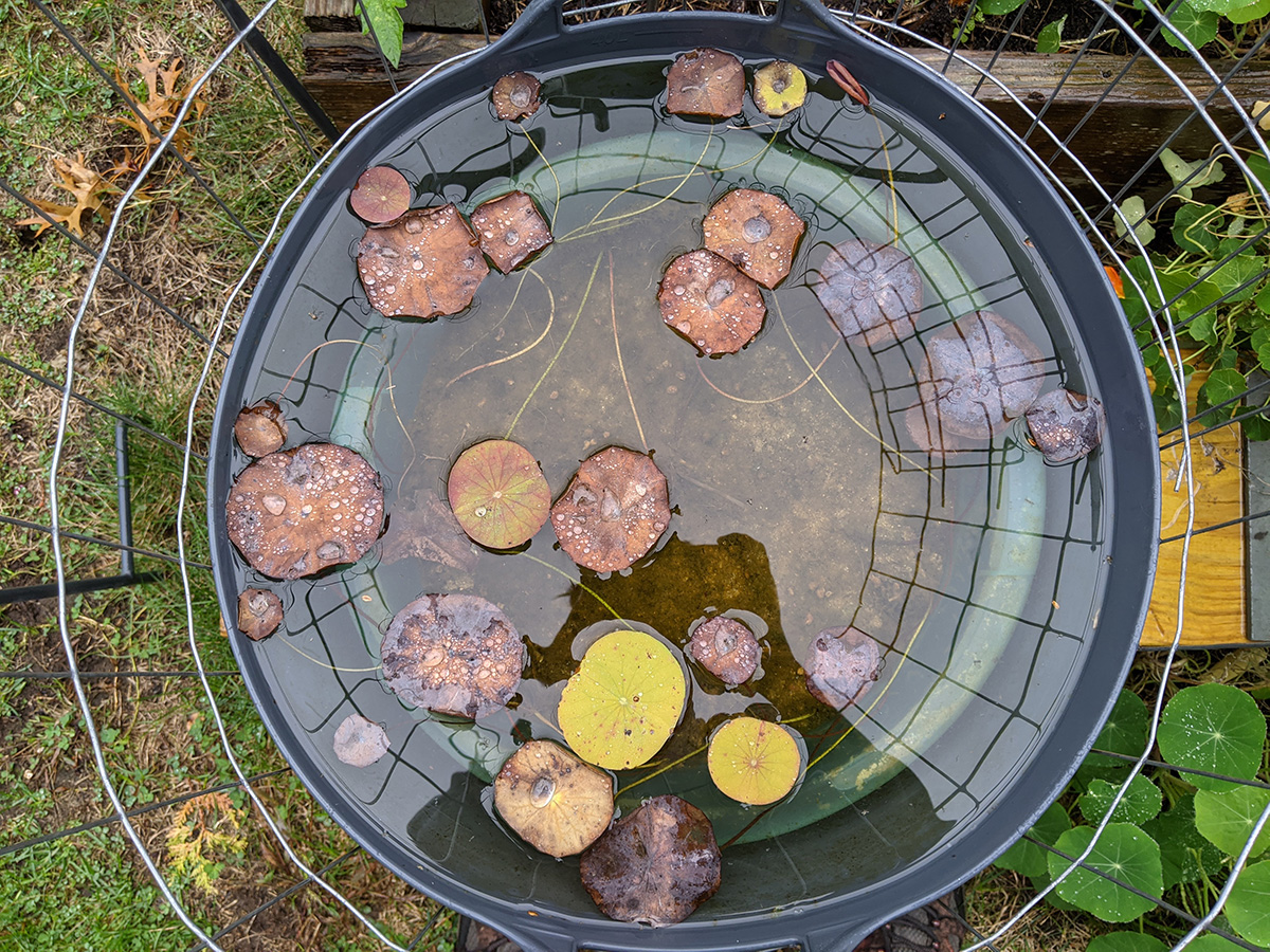 i still need to dig up my lotus plants. i read not to dig them up before all the leaves have turned brown and shriveled. i figured by this weekend that will happen. unfortunately there doesn't seem to be very many warm days left anymore, and working in wet conditions in the cold is no fun. after that we need to take apart our rain barrels, figure out a place to store them all, whether in the garage or somewhere outside.