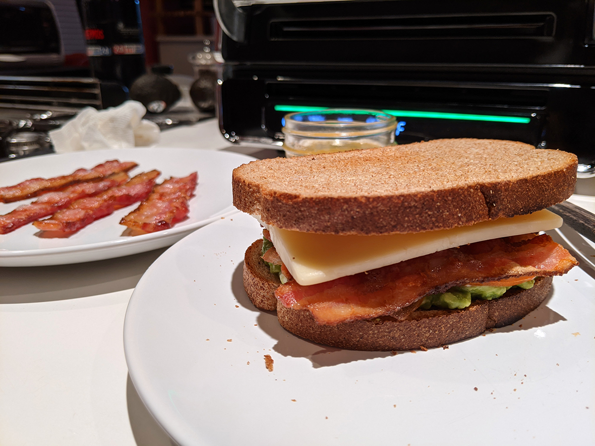 i cooked more bacon for lunch, made another bacon-avocado sandwich. i toasted the bread separately this time, but still put it in the smokeless grill just to make the bread crispier and to melt the cheese. pretoasting the bread prevents it from getting as smooshed compared to when i used fresh (soft) bread. i've discovered that adding a bit of salt to avocado makes it taste so much better. it reminds me of those chilean sandwiches from chacarero, one of the best part was the tasty guacamole, and i think their secret was just adding salt as well.
