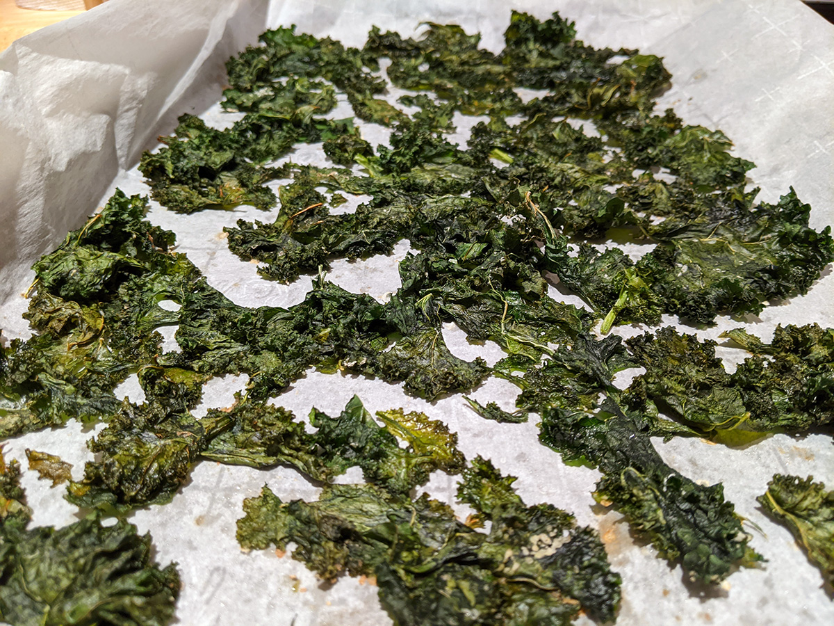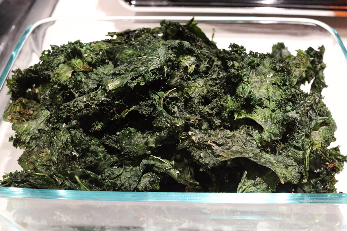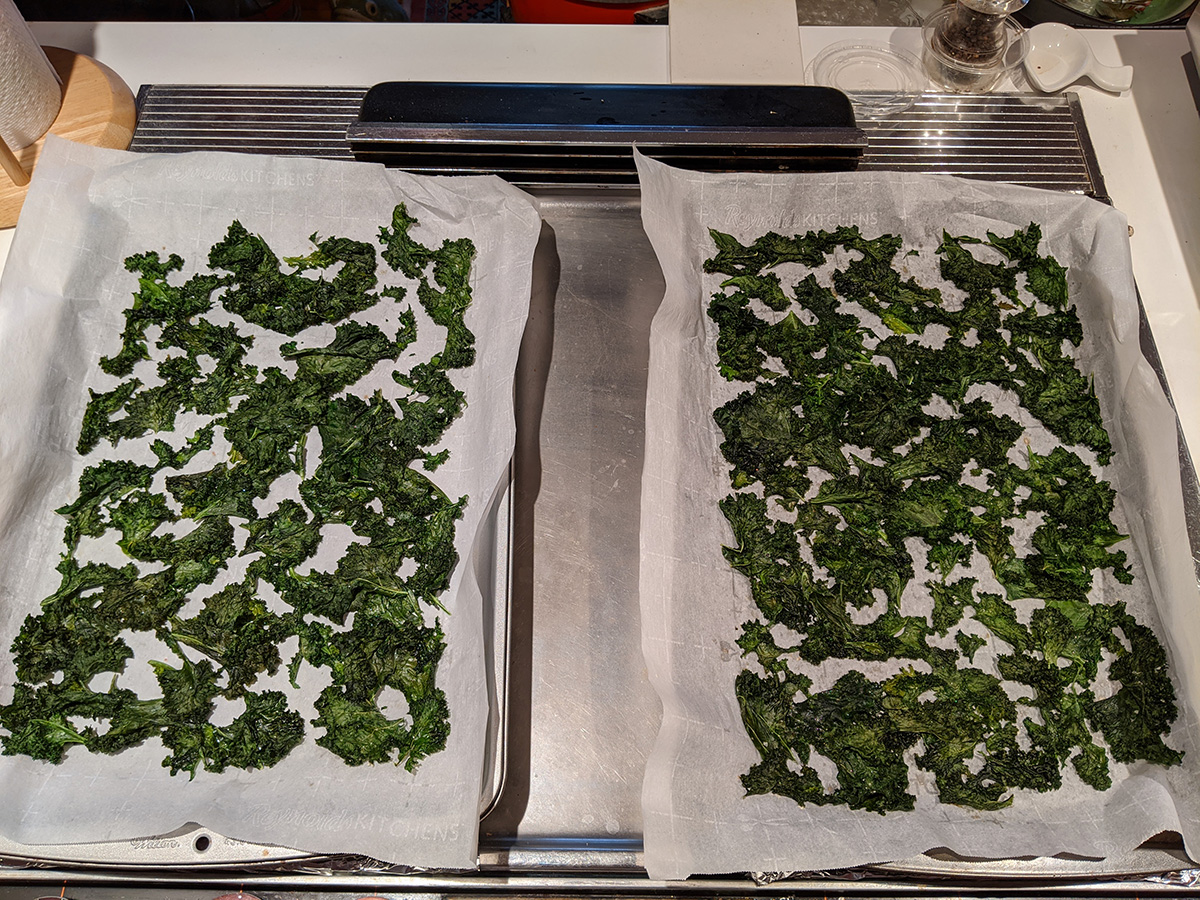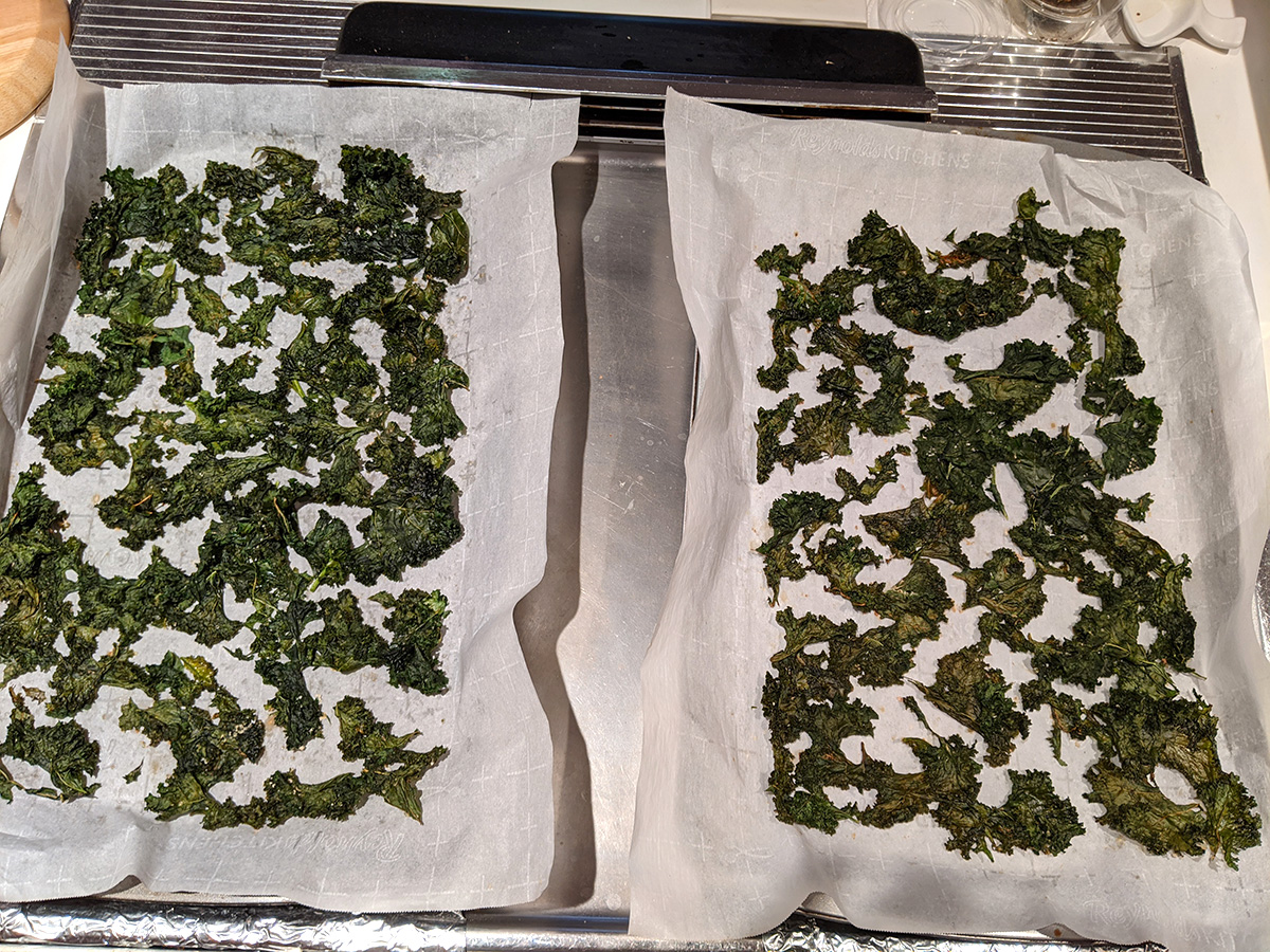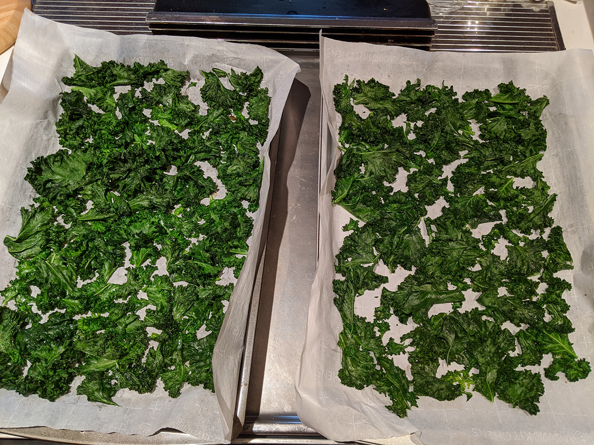 i bought some kale and made kale chips for a snack. i removed the leaves (from the stems), soaked them in water, then dried them in batches using the salad spinner. i was impatient and couldn't wait for the leaves to dry completely, and started tossing them with a bit of olive oil (1 tsp) and pink himalayan sea salt (1 tsp). i then put them on two trays and heated them in the oven at 300°F. 12 minutes, then switched the trays for another 12 minutes. when i took them out they were still soggy (because the leaves weren't dry enough) so i put them back into the oven for another 10 minutes before they were finally ready. the final kale chips i finished off in a single sitting.
