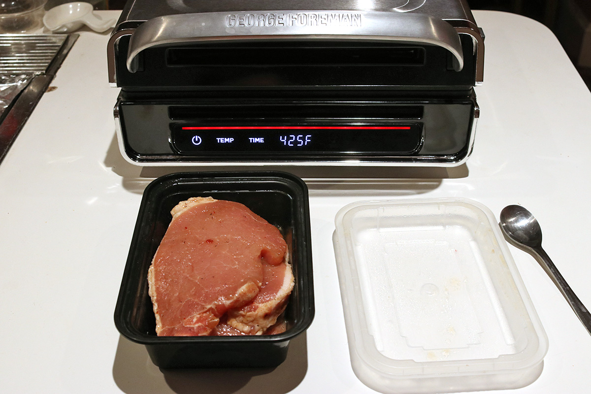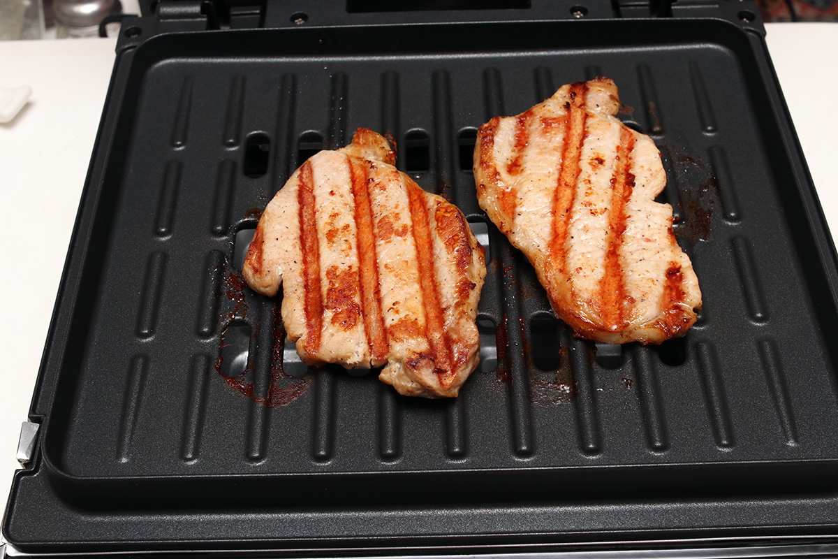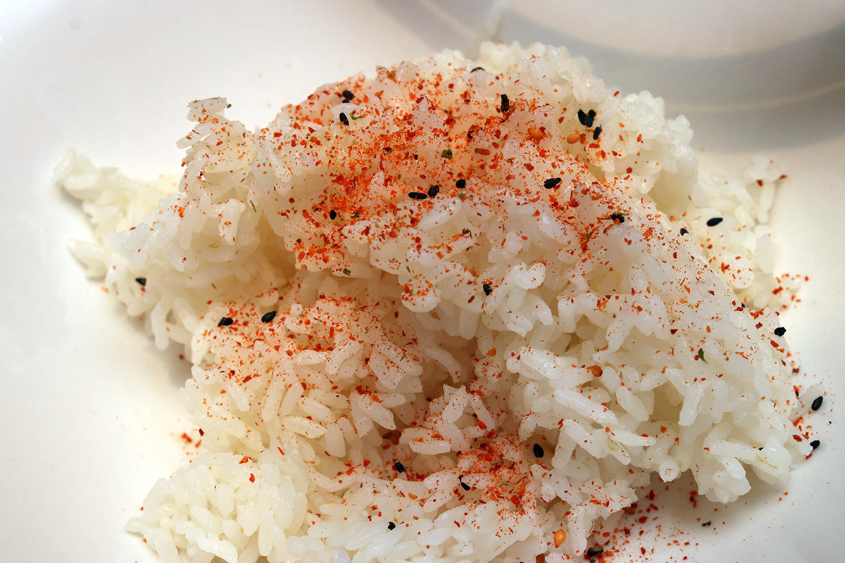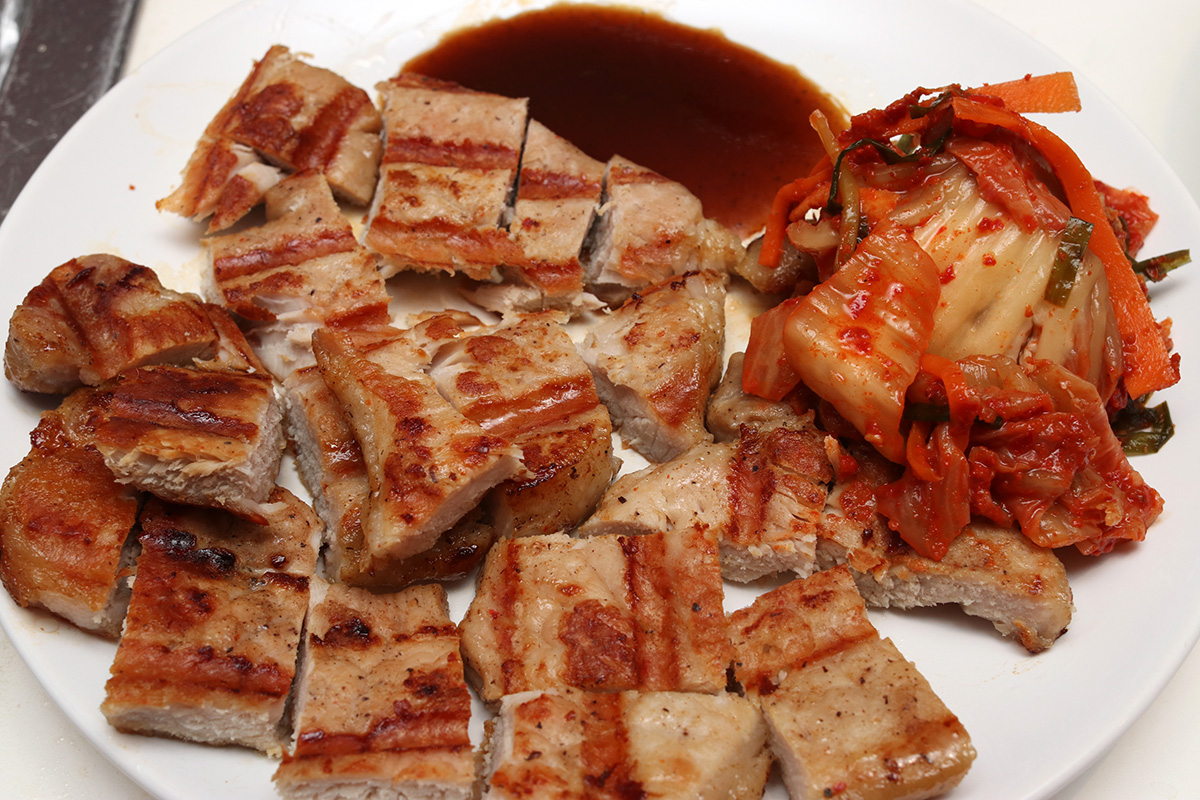my mother packed me some raw marinated boneless pork chops yesterday. i steamed a cup of jasmine rice in the cooker and prepared 2 pork chops using the smokeless grill. i didn't even bother opening a window to ventilate, the pork chops were fairly lean and any smoke wouldn't be of the greasy variety (unless bacon). i left them to cook for 10 minutes which was probably too long because the pork chops can't out a little dry (well done). next time i won't grill them as long. i sprinkled some shichimi togarashi chili pepper spice on the rice and paired it with some homemade kimchi. i had the pork chops with some tonkatsu sauce.