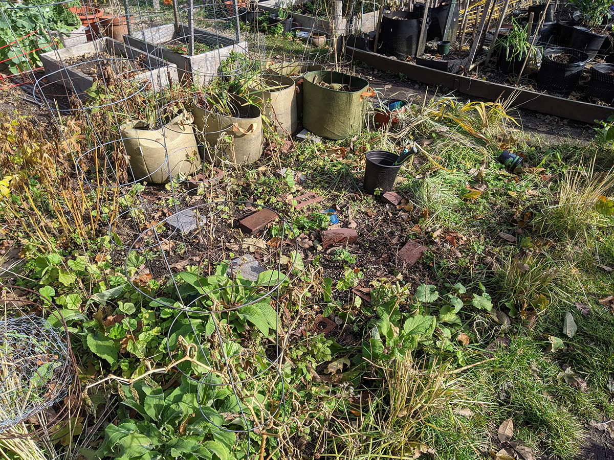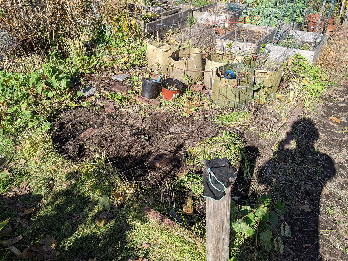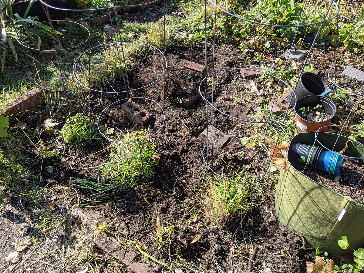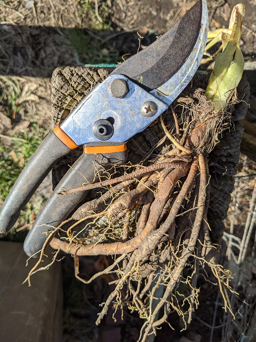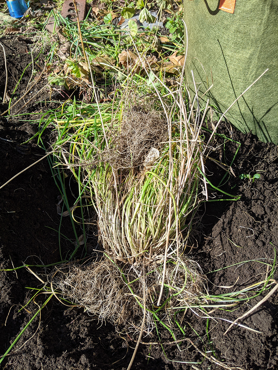 at 10am i went to my community garden to dig up the chives and redistribute them. i also got rid of the lemon balms: i have no use for them and they spread something fierce, taking up valuable growing real estate. i worked for my than an hour, covered in dirt, salty sweat running down my face and into my mask. i was the only person in the garden, though a group of construction guys working on the house next door noisily kept me company. i dug up some daylilies and reburied them in the back of my plot. i also uncovered a batch of crocus bulbs, separated out the smaller corms.