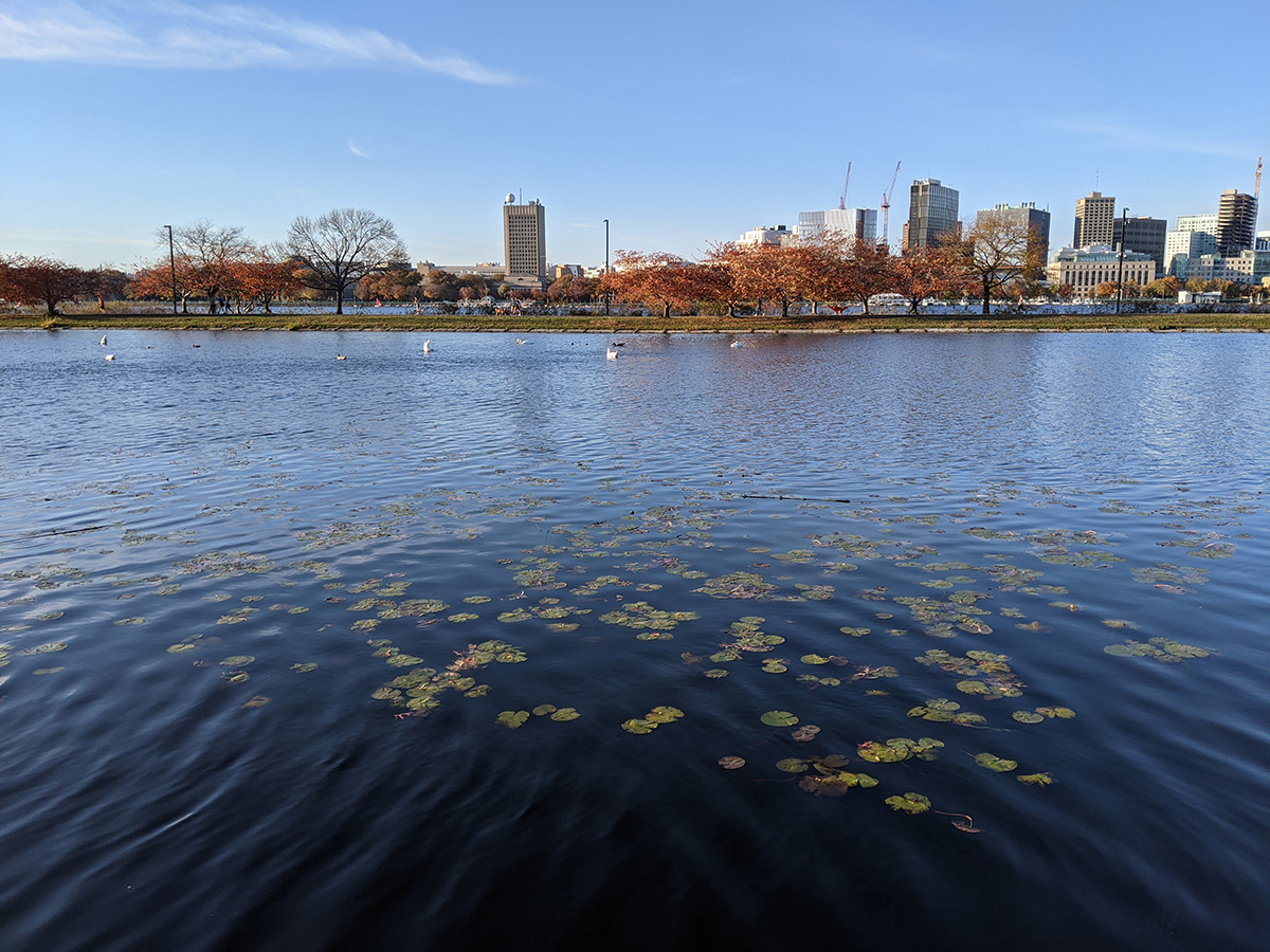 i left ming's market by 3pm. it took me 45 minutes to ride home because i stopped a few times to take photos. a window had broken on one of the new tall buildings on stuart street and a section of the street had to be closed off to traffic because of potential crashing debris. i saw a pretty scene at the boston public garden and had to stop to take a snapshot. riding all the charles river i stopped again to capture the lagoon with the river but the nice autumn scenery.