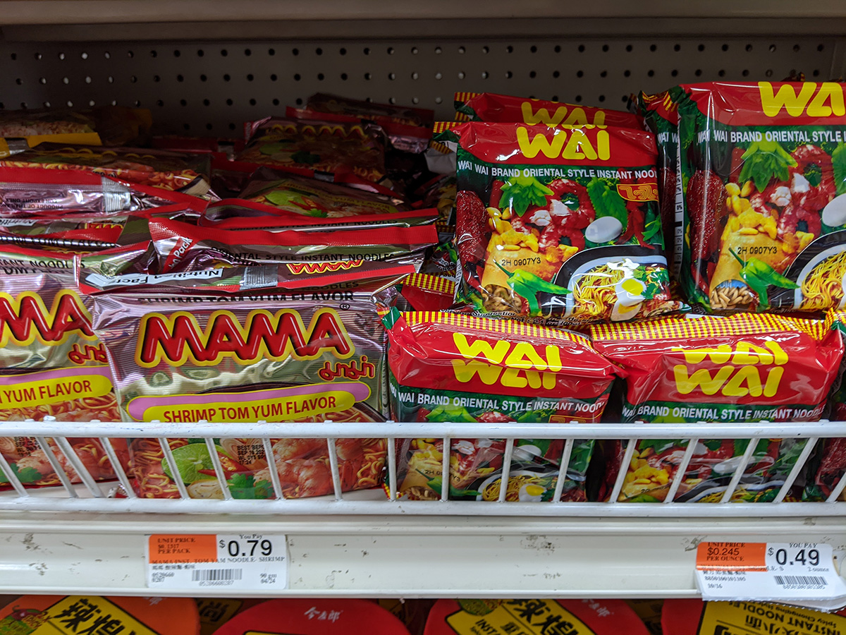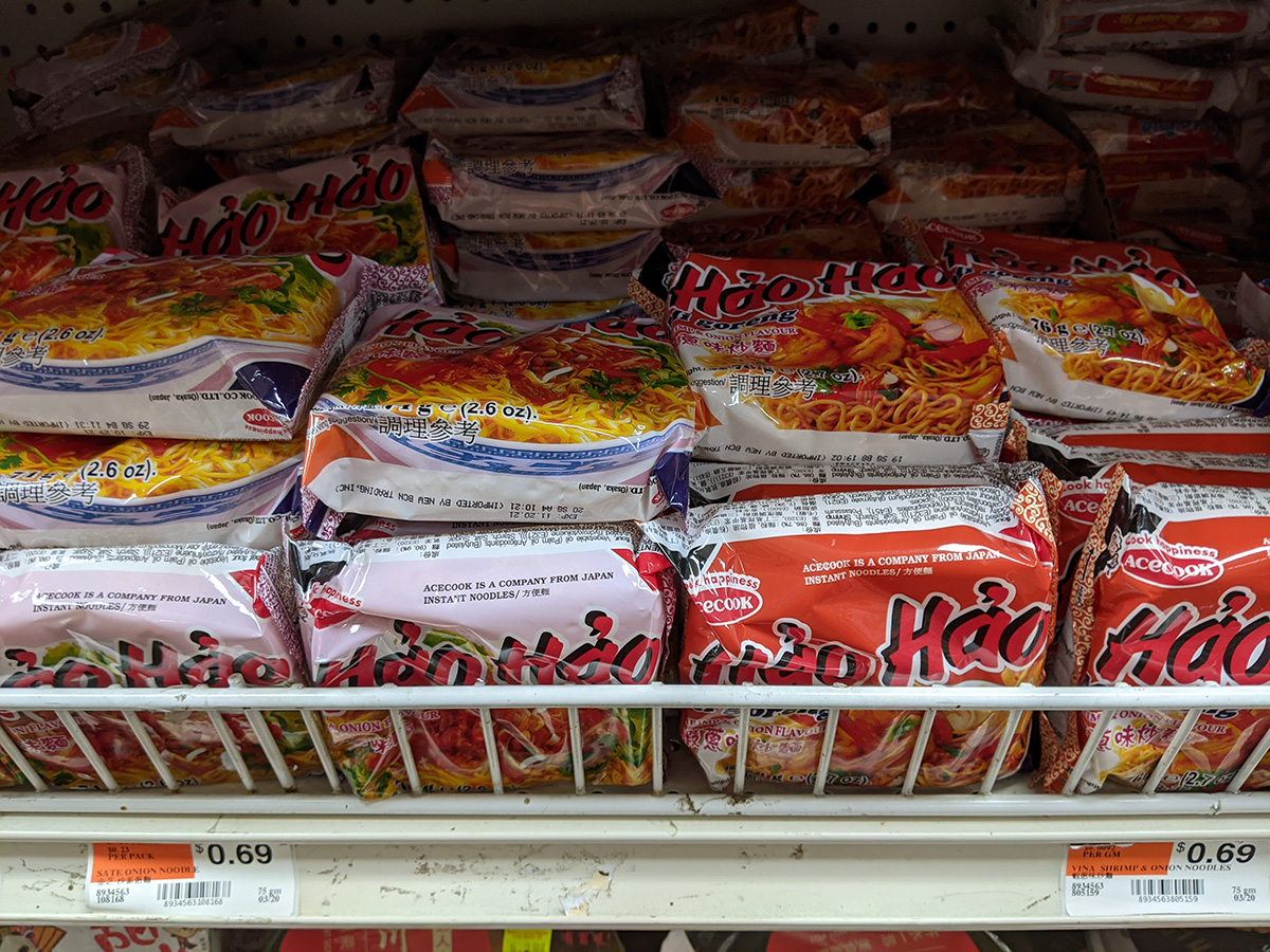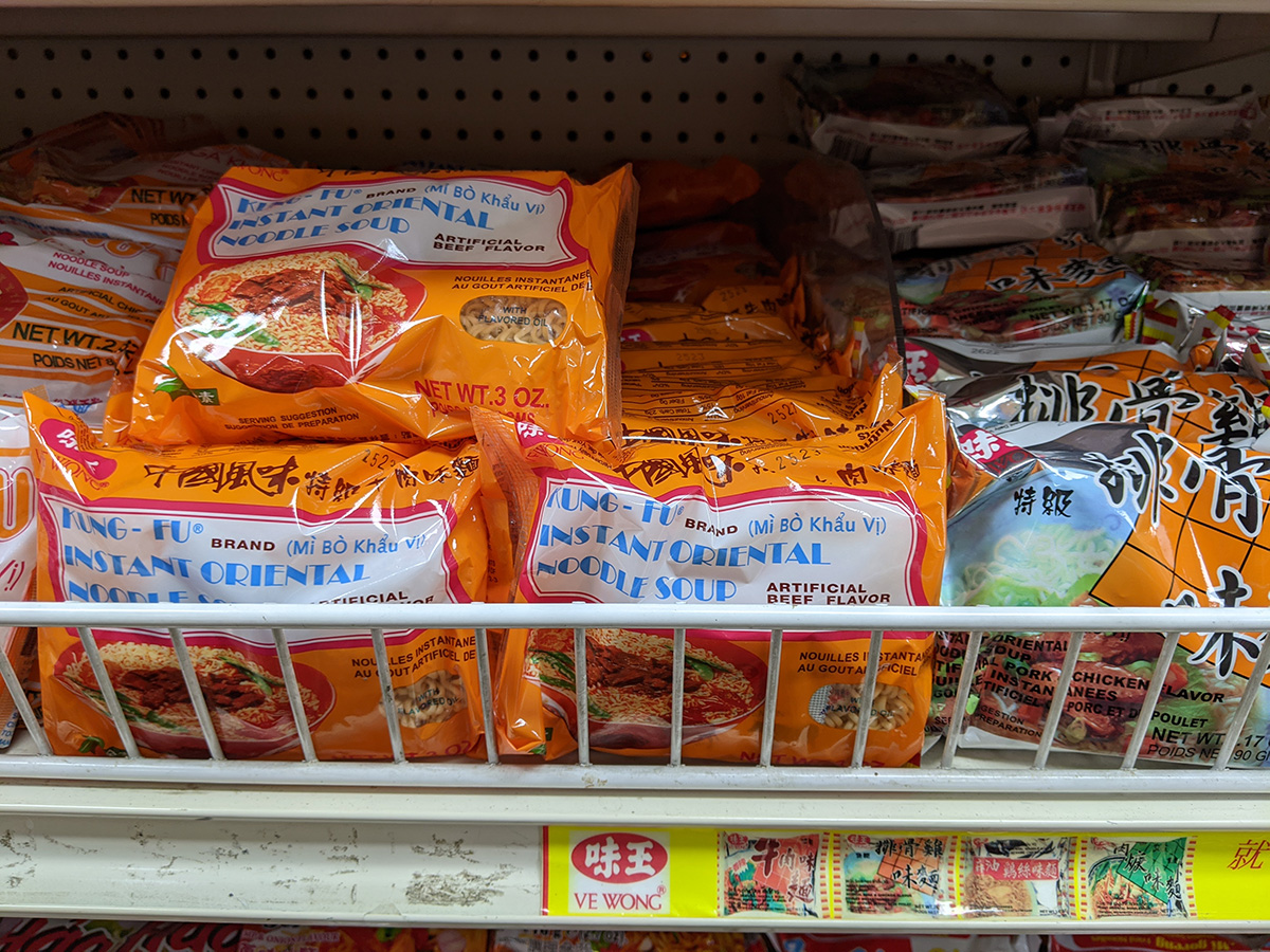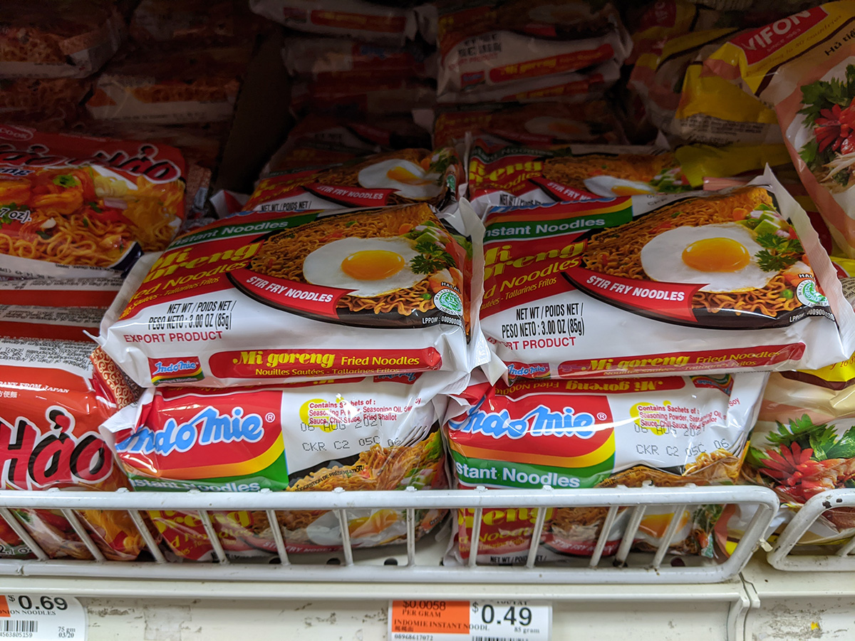 it was such a nice day, i changed into a pair of shorts before i left, that's how warm it was. i arrived at ming's market at 2:30pm. i didn't really need anything, figured i'd stock up on some snacks. they were completely out of the sea salt sunflower seeds, it's for the best, my mother and i have been eating them for months, it probably single-handedly spiked my sodium level. i searched for some flavored ginger but they didn't have that either. they also seemed to be out of candied tamarinds until i found some by the southeast asian spice shelves of all places. another thing i wanted to find was indomie instant noodles, after hearing good things about it from maureen. i don't remember ever seeing it before so i wasn't hopeful i'd find it, but sure enough they had it. they only carried one flavor, mi goreng, but apparently that's the classic. these are dry noodles and aren't supposed to be eaten in a broth. they're also spicy, as many indonesian foods are according to maureen. at just 49¢ a package, i could afford to stock up (i got half a dozen). later when i sent maureen a photo of what i found, she said it was much cheaper in boston. finally, i was trying to find some kikkoman tonkatsu sauce but they didn't seem to have any.