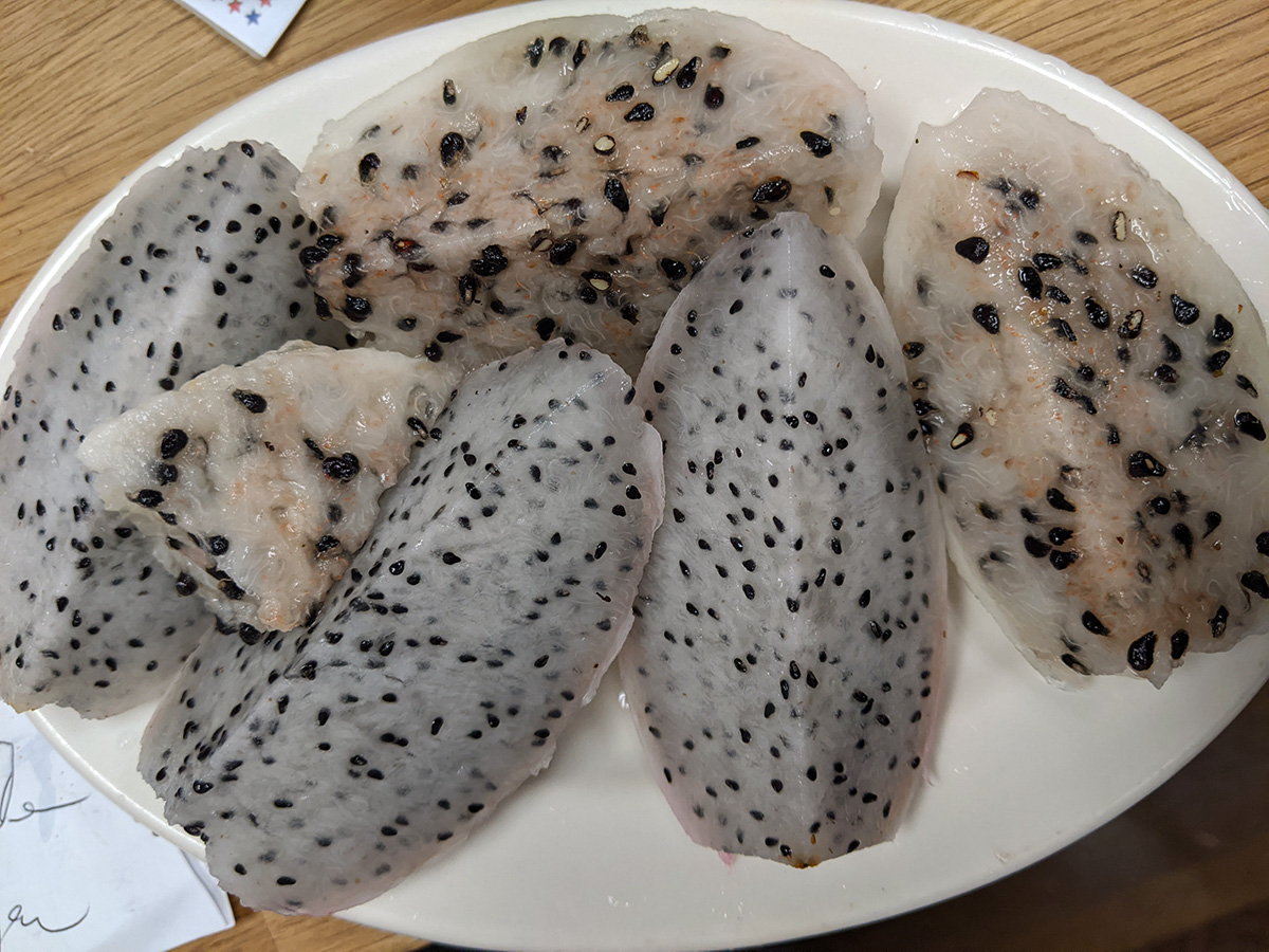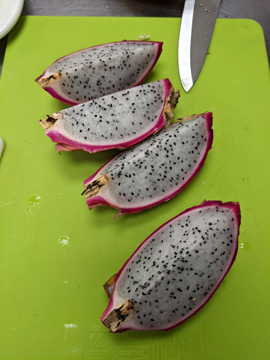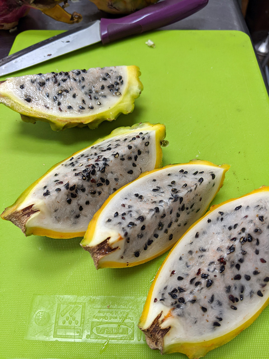 i left chinatown by 2:30pm. i checked the weather, there was a slight chance of rain around 4pm. instead of going home, i biked the 6.4 miles to the cafe to drop off the supplies. we tried the dragon fruits (2 yellow, 1 red): the yellows were amazingly sweet, the red was meh at best.