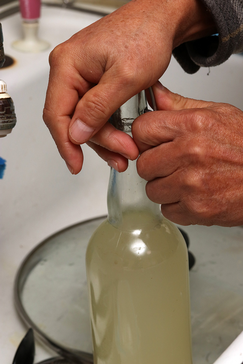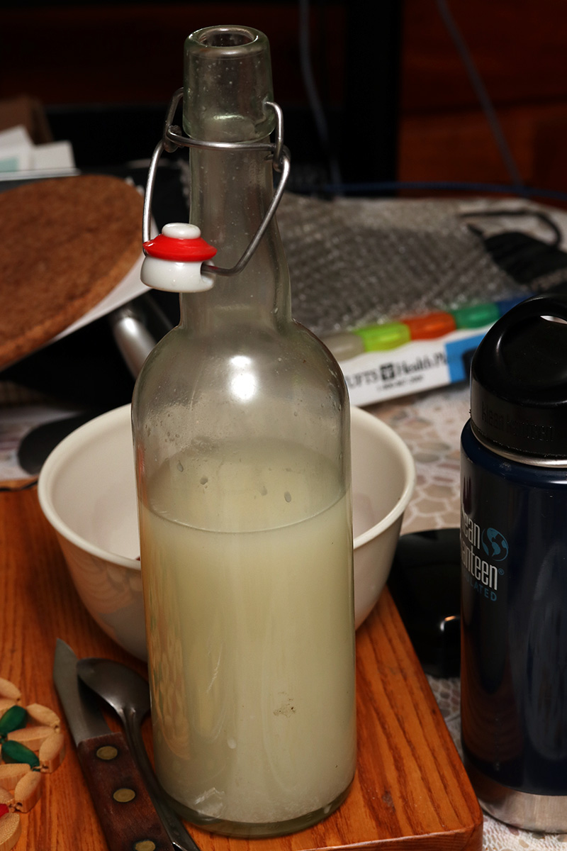 using the cheesecloth i got him, my father managed to drain out the liquids from his fermenting glutinous rice. this was rice that my godmother's son jack brought so my father could make jiu niang. but something went wrong - either too many yeast balls, or my father believes an incompatible type of glutinous rice - and instead of converting the starch into sugar, the yeast went directly into alcohol production. not wanting it to go to waste, the liquid could still be saved as rice wine, which my father ended up bottling. but instead of refrigerating, he left it outside to ferment some more, and the wine started to carbonate. when my father went to open up the bottle to sample the wine tonight, it exploded out, nearly emptying half the bottle. as for the wine itself, it seemed to have a high alcohol content (similar to wine at least, 10-14%), and had a sweetness that wasn't there before, kind of like a fizzy milky alcoholic glutinous rice drink. because of the carbonation and the sweetness, it'd be easy to accidentally drink too much and become drunk.