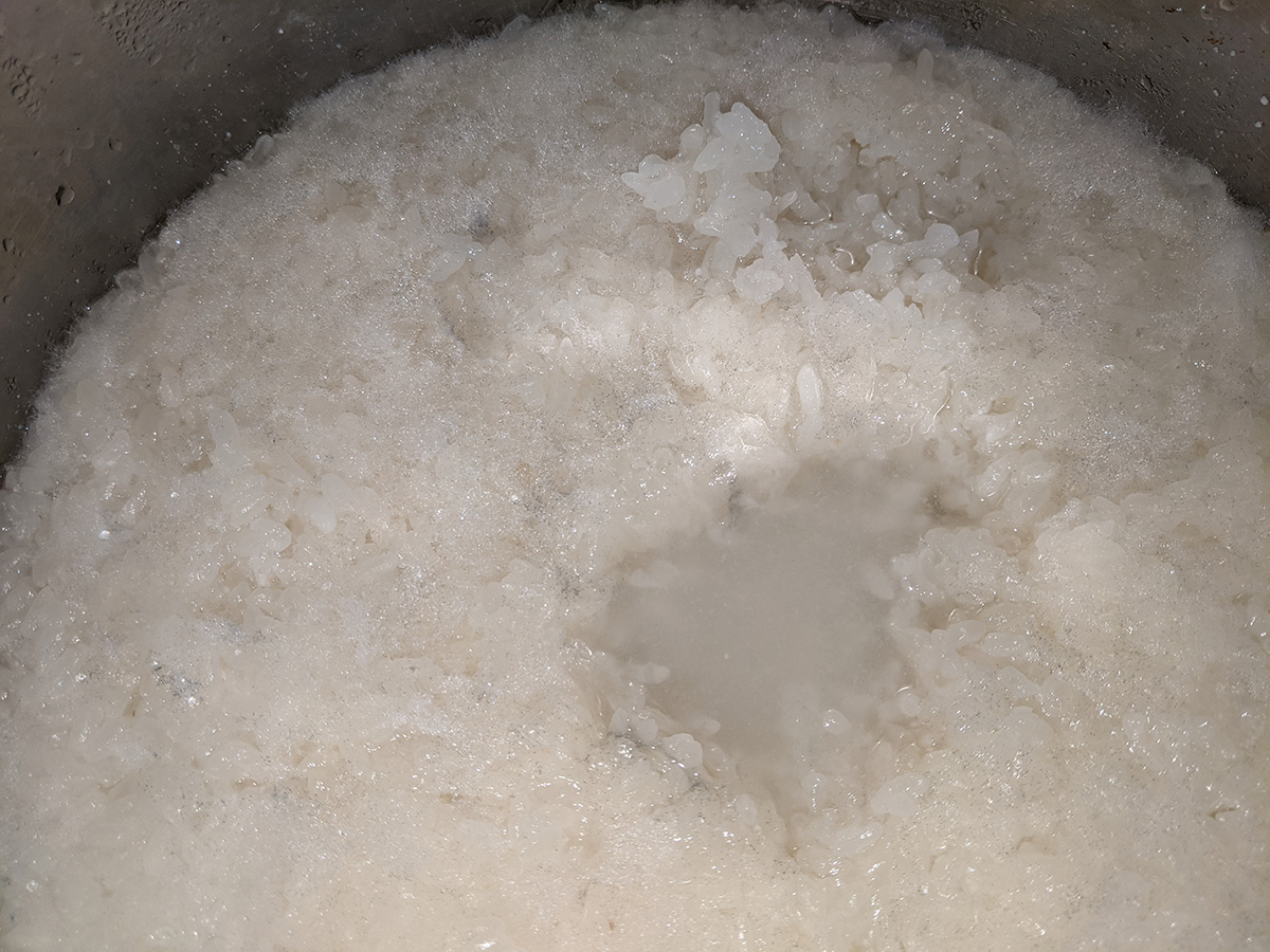 woke up this morning to check on my sweet rice fermentation. it'd only been 23 hours, but i wanted to take a peek to see the progress. when i opened up the instant pop, i was not happy with the result. there seemed to be a layer of white and black mold on the surface of the rice. white mold is okay, but black mold means there's a problem. i didn't smell any characteristic jiu niang alcohol aroma,