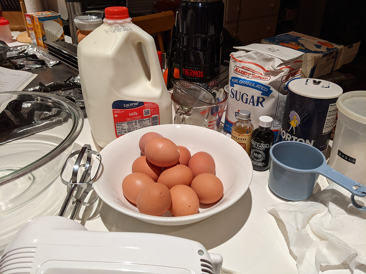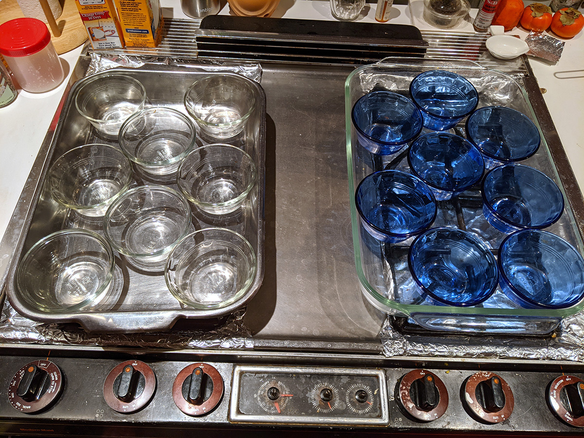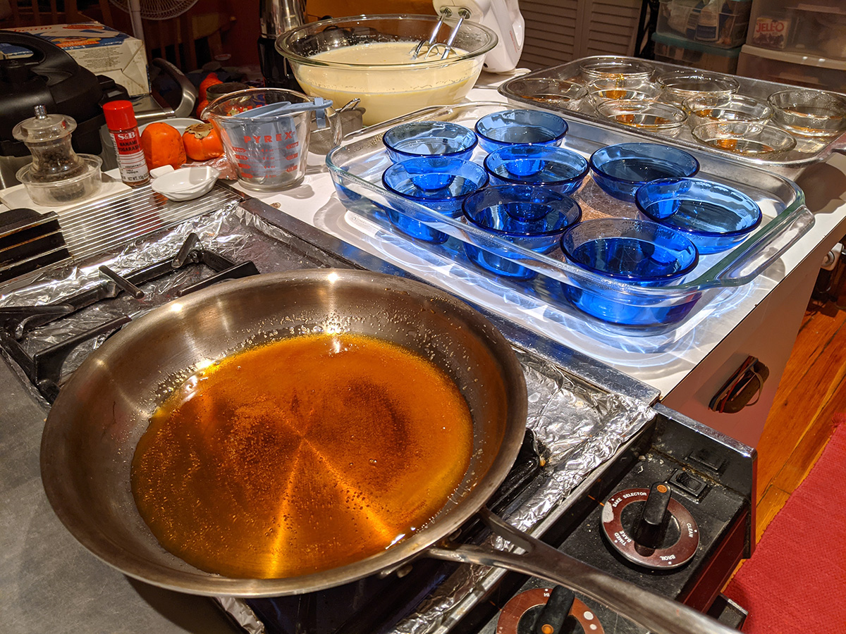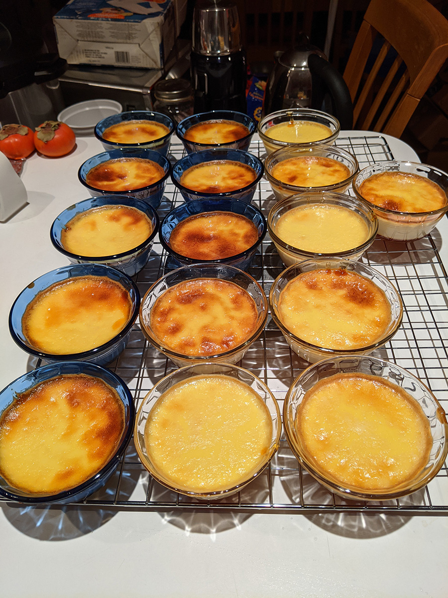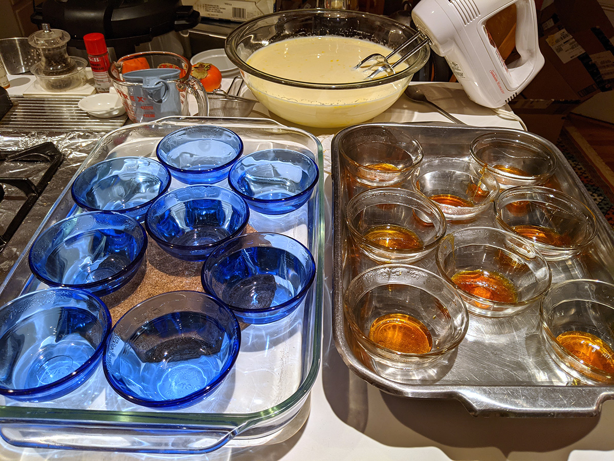i worked while watching an encore broadcast of netflix's gilmore girls: a year in the life on the CW network. there was also a monday night football game between the las angeles rams and tom brady's buccaneers. i was making 16 flan servings, the same as last year. my mother wanted me to make more (20 at least), even though usually she's always telling me to make less. i would've made more but i couldn't find my large size aluminum baking pan (which can hold 12 ramekins), so i had to use a smaller baking pan and my largest glass lasagna dish, each holding 8 ramekins maximum. i brought back all the glass ramekins from my parents' place, where they've been since last thanksgiving.