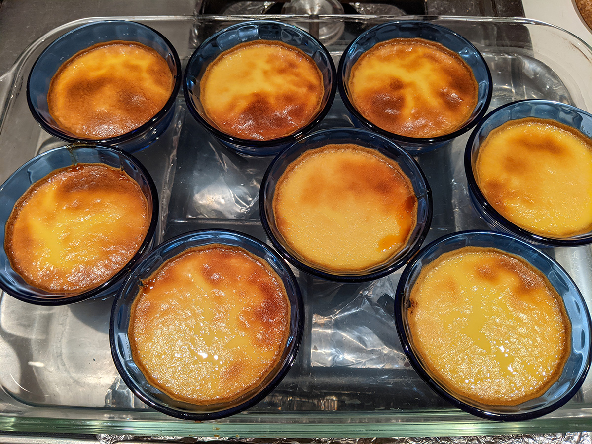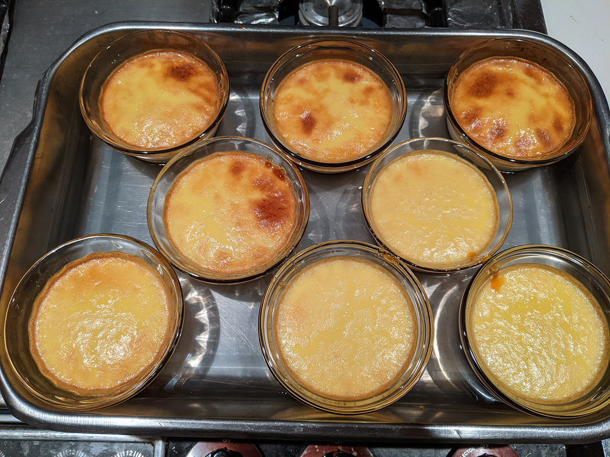 at 12:20am the flan was supposed to be finished, but only the flan on the top rack had turned brown. i took out that tray and left the other tray to bake for 20 minutes minutes to brown it a bit more. browning is an unnecessary step, since it's actually the bottom layer of the flan, but i like to do it anyway just because it looks better.
