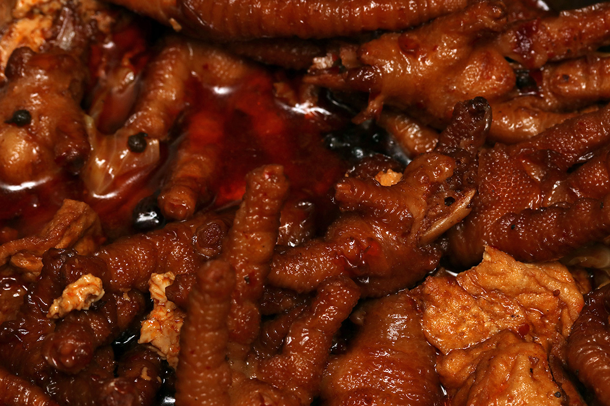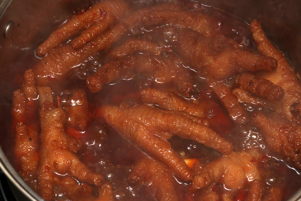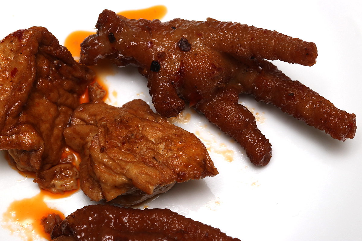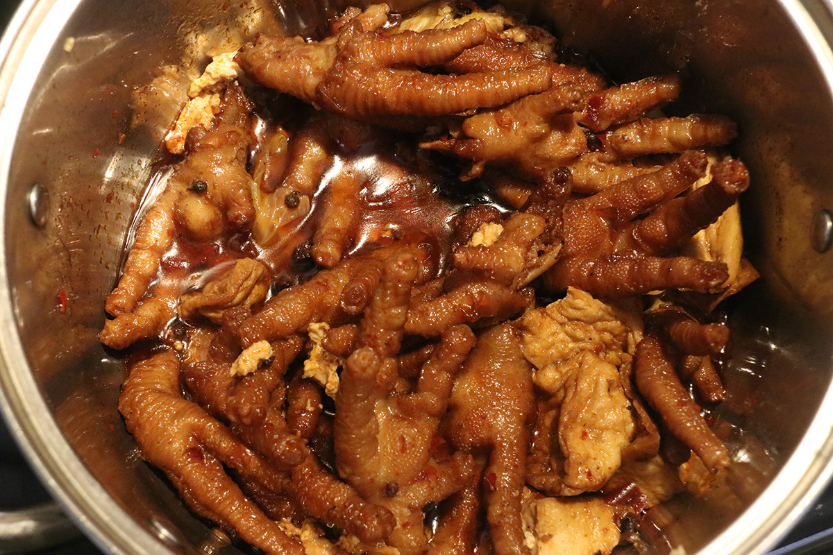 the chicken feet were finally ready to eat. texture wise they were perfect, but i felt the sauce wasn't strong enough, too oily, not enough salt. still, it was a good proof of concept for the next time we want to make chicken feet. my father said the key is to fry them first, because it puffs up the connective tissues and the skin, making them not only more tender but easier to eat.