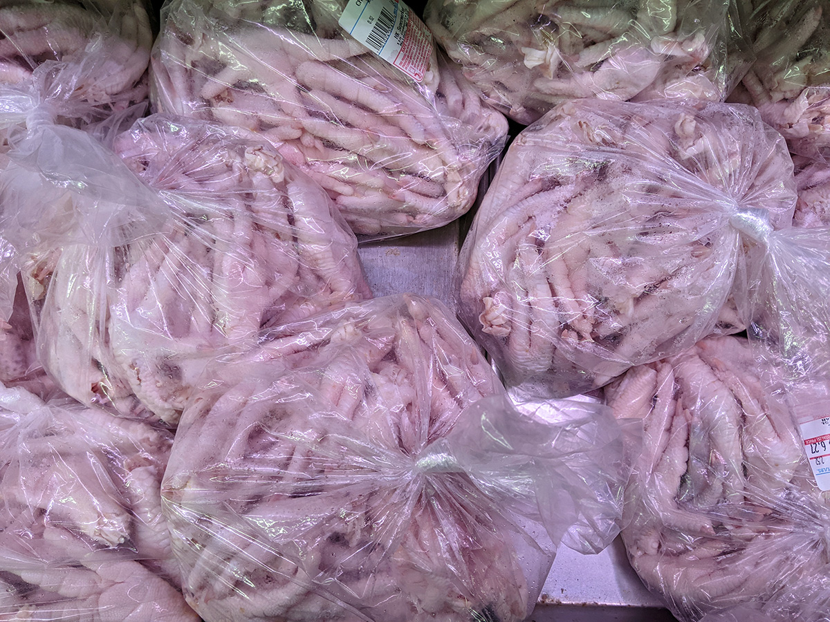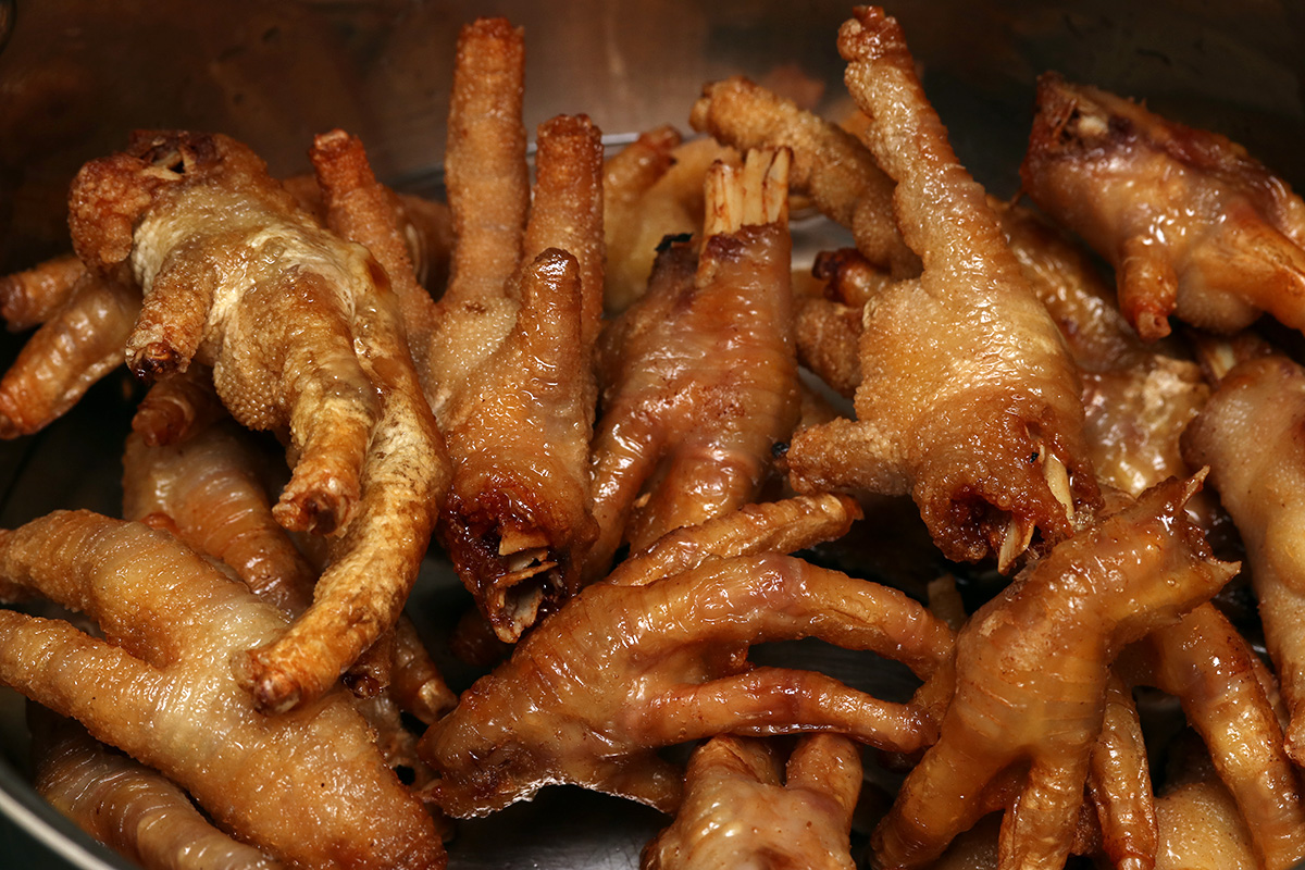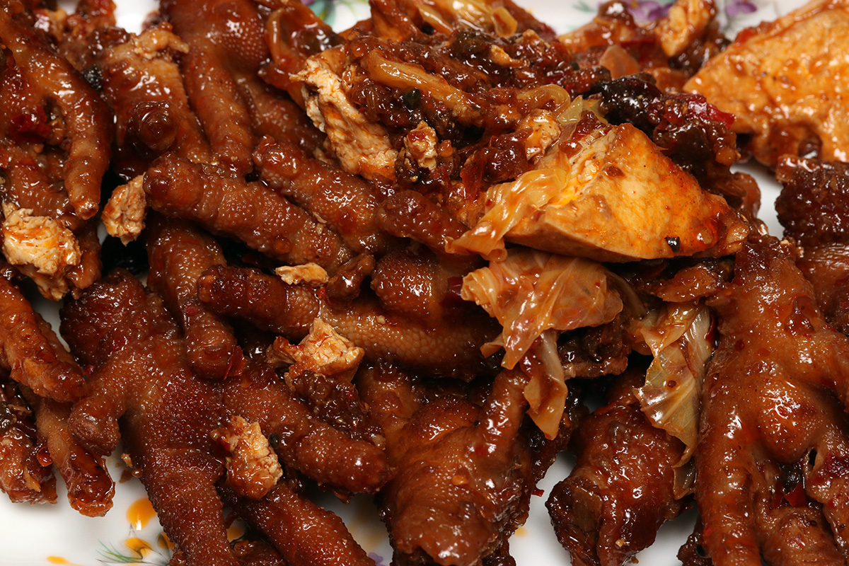 the chicken feet were finally ready to eat. texture wise they were perfect, but i felt the sauce wasn't strong enough, too oily, not enough salt. still, it was a good proof of concept for the next time we want to make chicken feet. my father said the key is to fry them first, because it puffs up the connective tissues and the skin, making them not only more tender but easier to eat.