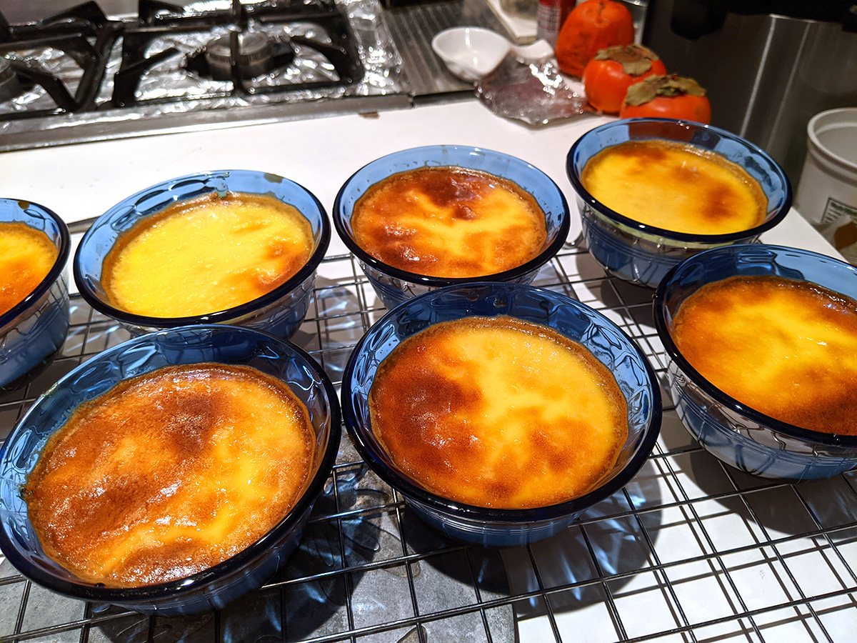 | preheat oven to 350°F. mix eggs with sugar and salt. mix in remaining liquid ingredients. set aside, let bubbles dissipate. boil a kettle of water and pour into lasagna dishes lined with 8 ramekins each. caramelize remaining sugar (melt in small batches, 3/4 cups each), coating ramekin bottoms. pour in flan mixture, using fine mesh strainer to catch any unmixed egg bits. bake for 120 minutes, switching trays after 1 hours to brown evenly. | |