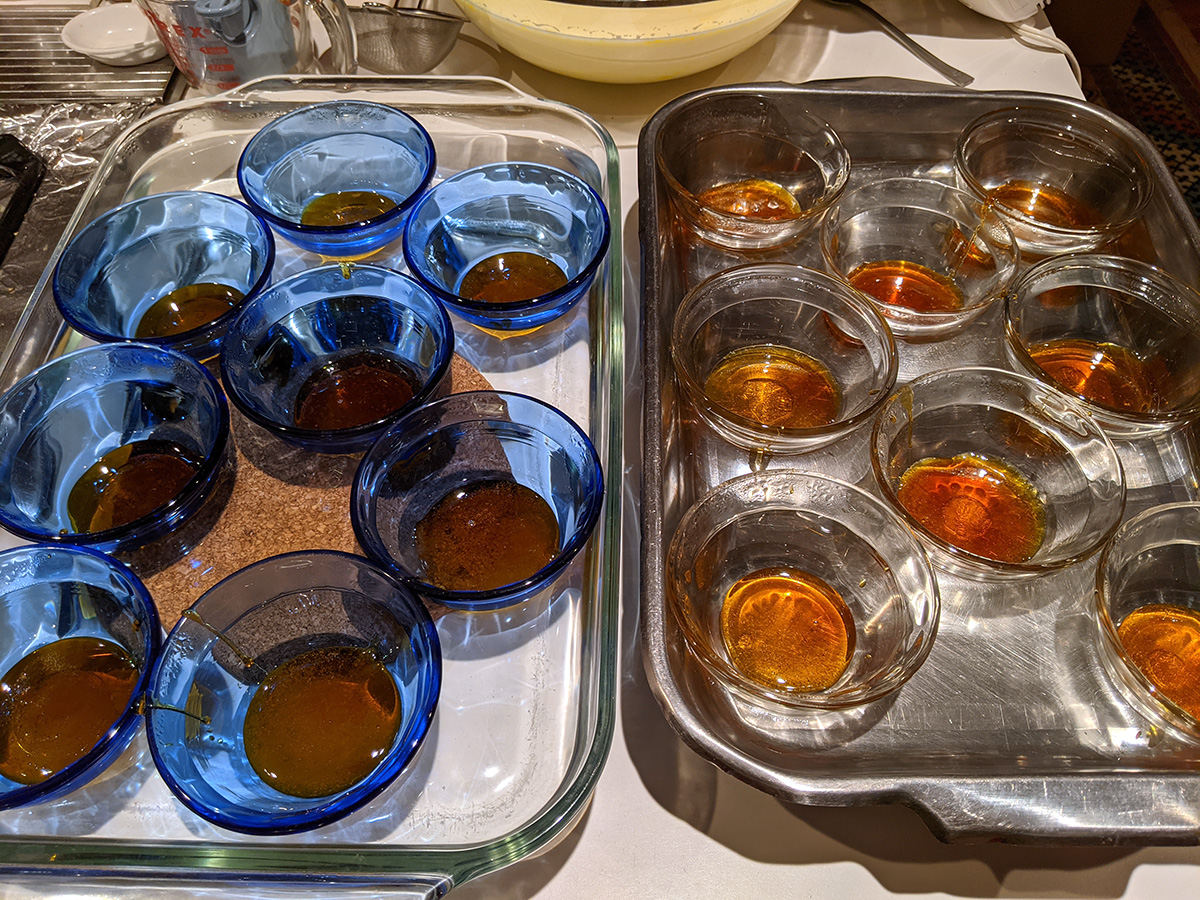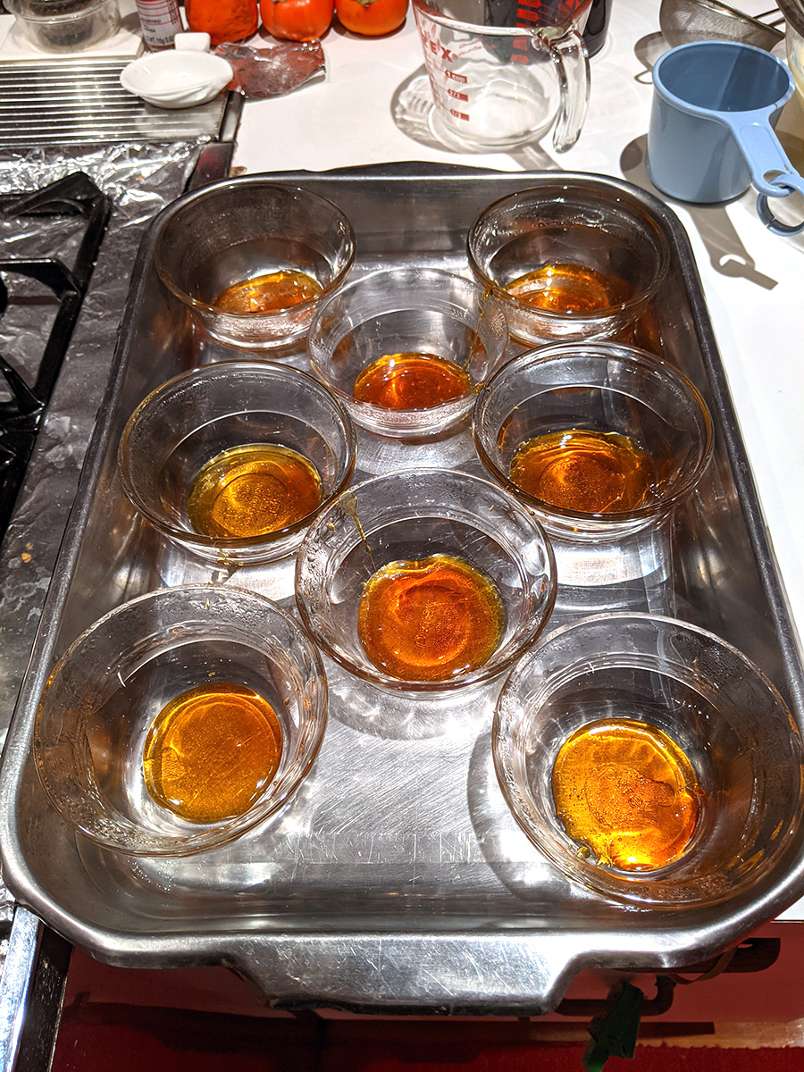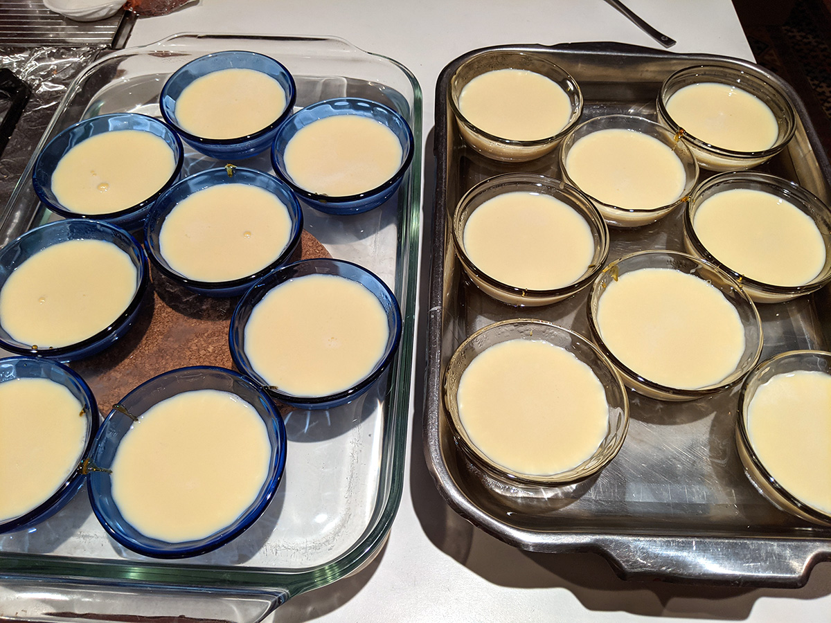 by 10pm i was pouring the caramel layers into the ramekins, already in their hot water bath, and with the oven preheating. it didn't take long for me to pour in the flan mixture, the portions were exact that i didn't have any left over. into the oven went the two trays at 10:20pm, to be baked for 2 hours, with a tray switch at the 1 hour mark.