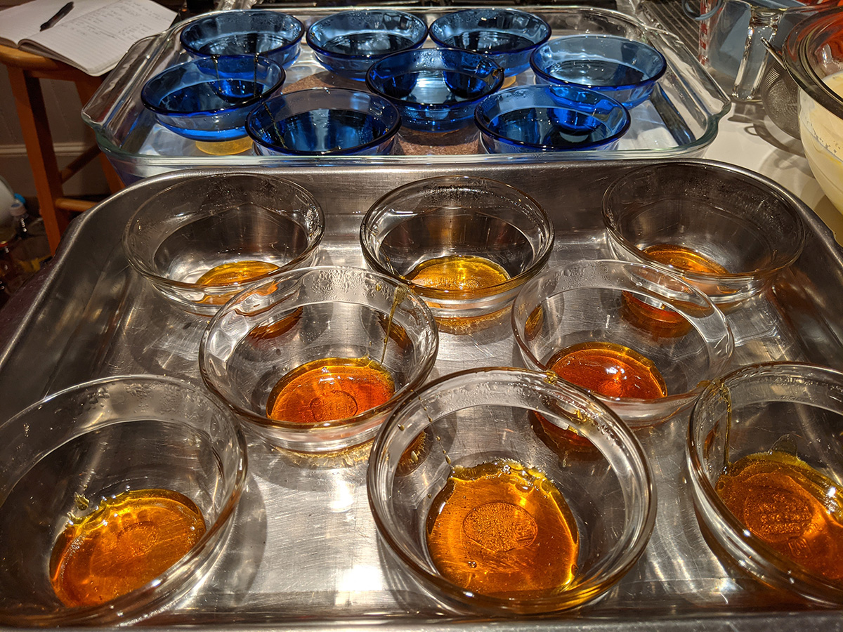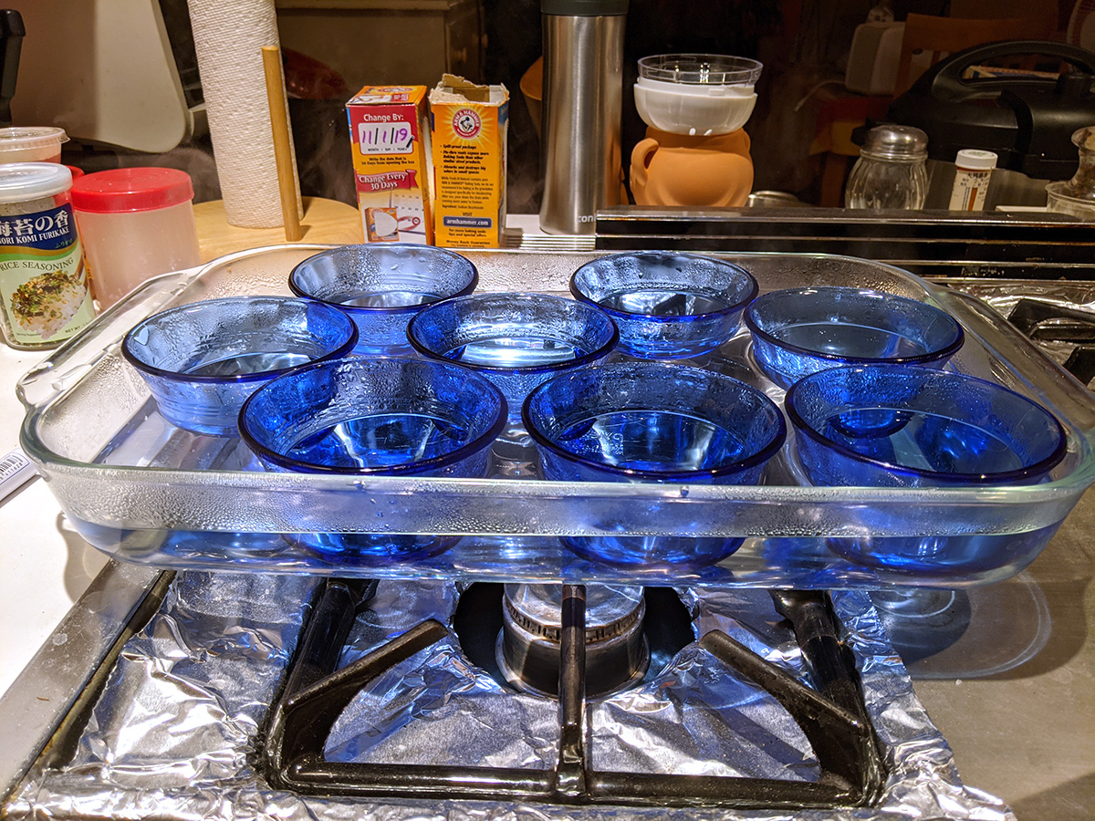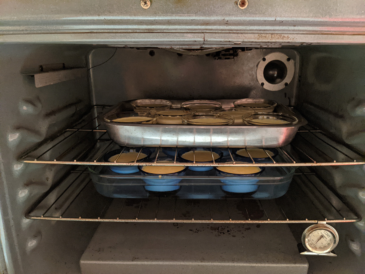 by 10pm i was pouring the caramel layers into the ramekins, already in their hot water bath, and with the oven preheating. it didn't take long for me to pour in the flan mixture, the portions were exact that i didn't have any left over. into the oven went the two trays at 10:20pm, to be baked for 2 hours, with a tray switch at the 1 hour mark.