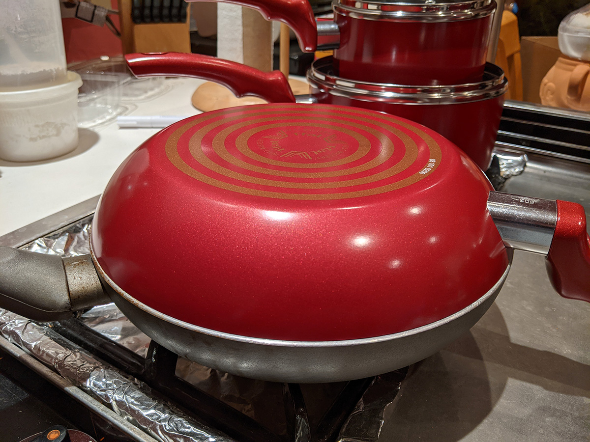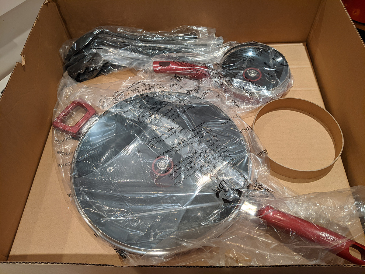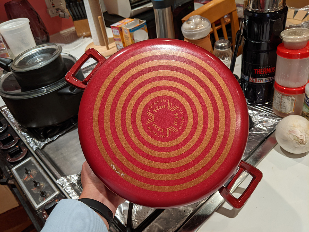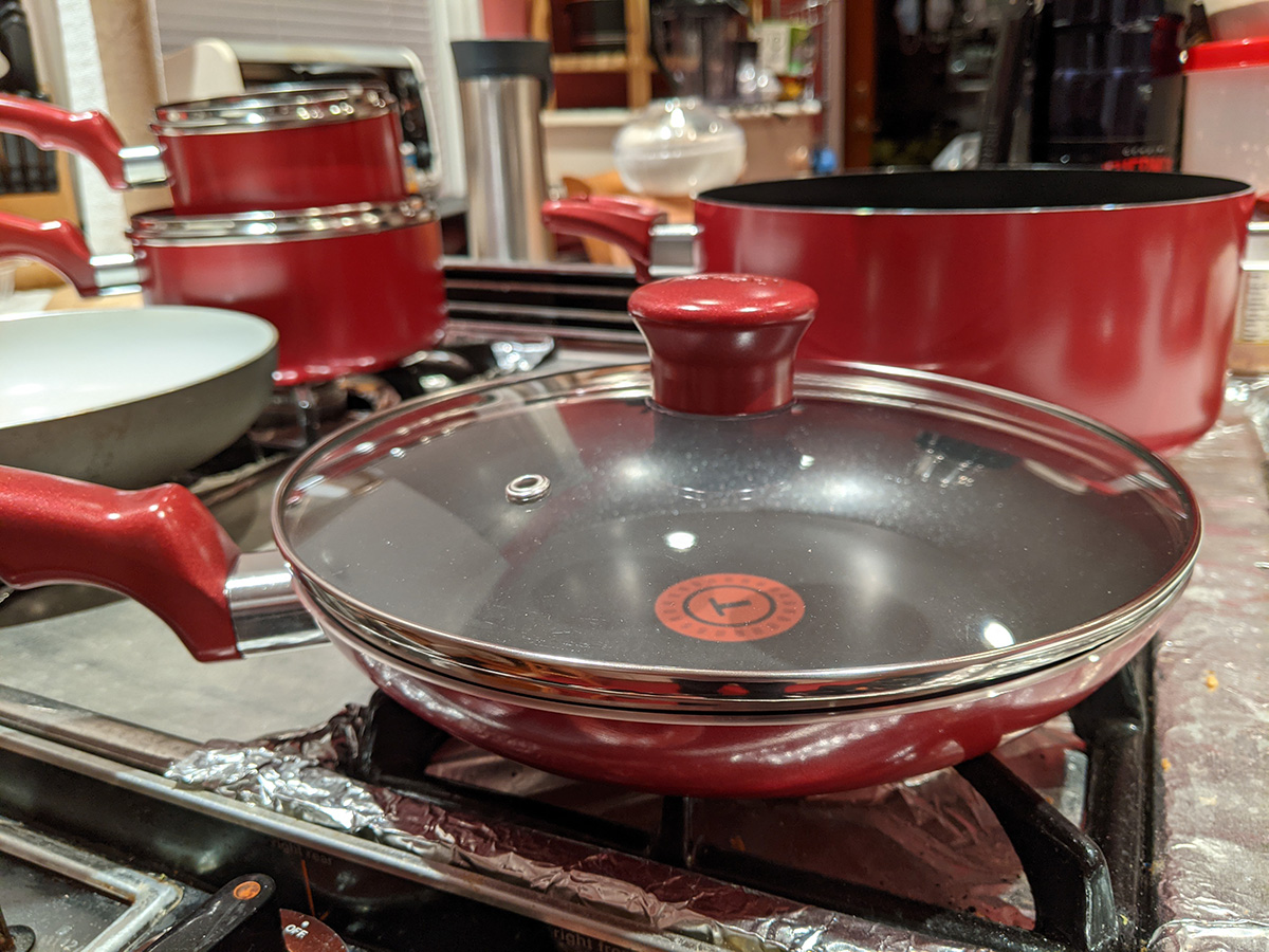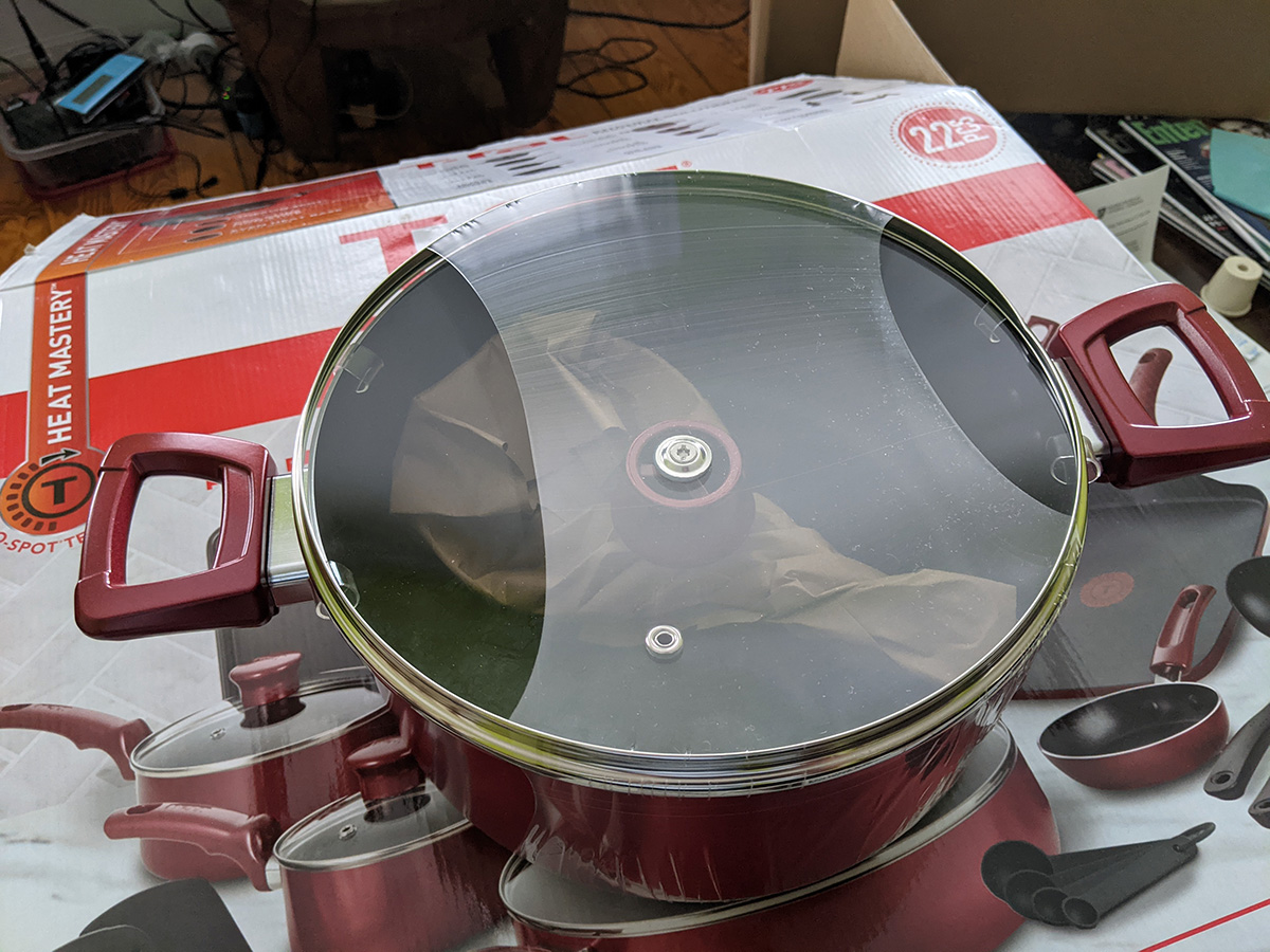 the t-fal cookware set included a tiny egg pan, which almost seems like a novelty item because it's designed to cook a single egg (it's called the "one egg wonder"). i think the 8" frying pan would be better for maling eggs. the lid from the 5qt dutch oven doesn't fully fit on the 9.5" t-fal frying pan; that's because the frying pan is too sloped on the sides, which means a smaller cook volume. i'll probably continue to use my old 9.5" ceramic frying pan. the 5qt "jumbo cooker" has a larger radius but it's not as tall as my 6qt chef pan. because it's so wide, it takes up two cooktops. i think i'll still continue to use my 6qt chef pan, until i can find something better. there's also a pizza pan. i already have a pizza pan, but this one is peppered with little holes, i guess all the better to crisp up the crusts, i'm not familiar with this style of pan. it also came with plastic kitchen tools, but i already have wooden ones so i won't use these. likewise the set of measuring spoons, i have my own. there's a 10.25" square griddle, not sure i'd ever use that as well, unless i like to get oil splatter all over the stove. finally, a 12.5 x 9" baking tray. so out of all these things these are the ones i'll actually use: 5qt dutch oven, 2qt saucepan, 1qt sauce pan, 5qt jumbo cooker (when i'm not using my 6qt chef pan), 8" frying pan, and pizza pan.