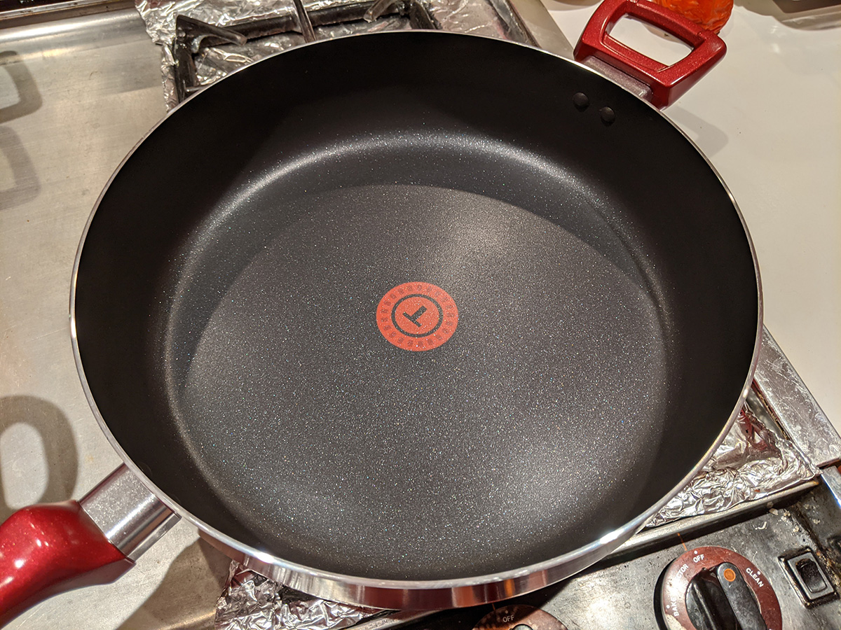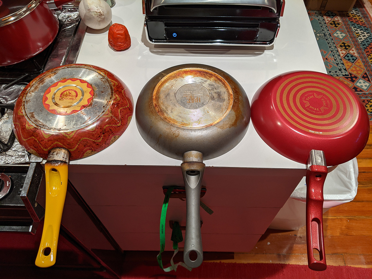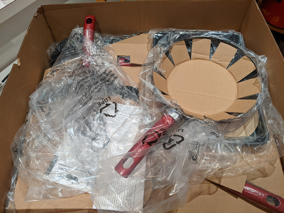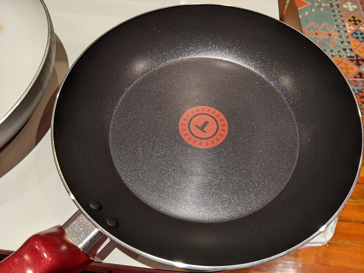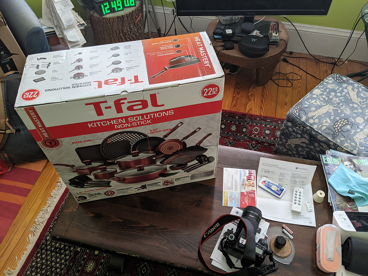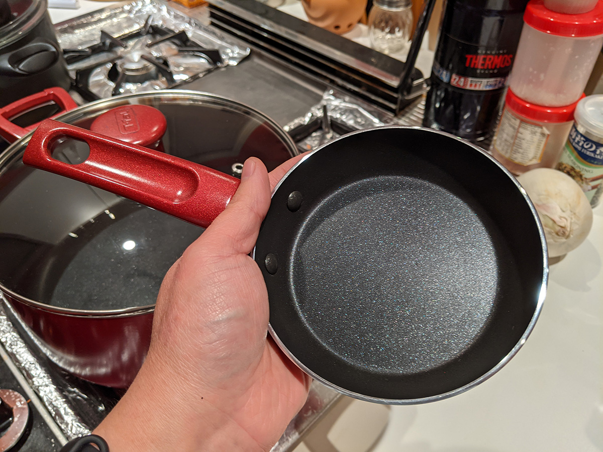 the t-fal cookware set included a tiny egg pan, which almost seems like a novelty item because it's designed to cook a single egg (it's called the "one egg wonder"). i think the 8" frying pan would be better for maling eggs. the lid from the 5qt dutch oven doesn't fully fit on the 9.5" t-fal frying pan; that's because the frying pan is too sloped on the sides, which means a smaller cook volume. i'll probably continue to use my old 9.5" ceramic frying pan. the 5qt "jumbo cooker" has a larger radius but it's not as tall as my 6qt chef pan. because it's so wide, it takes up two cooktops. i think i'll still continue to use my 6qt chef pan, until i can find something better. there's also a pizza pan. i already have a pizza pan, but this one is peppered with little holes, i guess all the better to crisp up the crusts, i'm not familiar with this style of pan. it also came with plastic kitchen tools, but i already have wooden ones so i won't use these. likewise the set of measuring spoons, i have my own. there's a 10.25" square griddle, not sure i'd ever use that as well, unless i like to get oil splatter all over the stove. finally, a 12.5 x 9" baking tray. so out of all these things these are the ones i'll actually use: 5qt dutch oven, 2qt saucepan, 1qt sauce pan, 5qt jumbo cooker (when i'm not using my 6qt chef pan), 8" frying pan, and pizza pan.