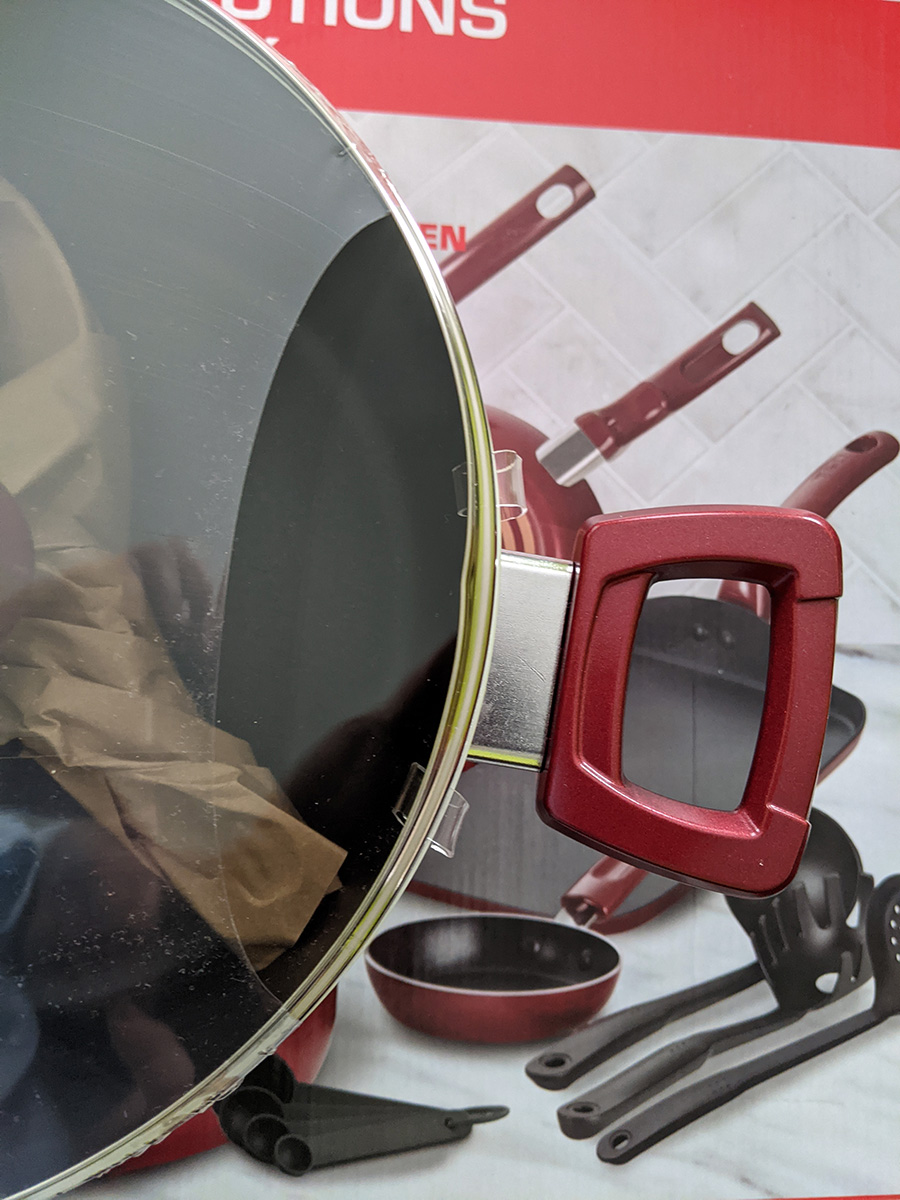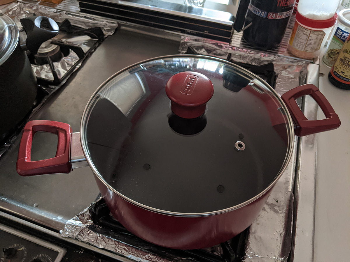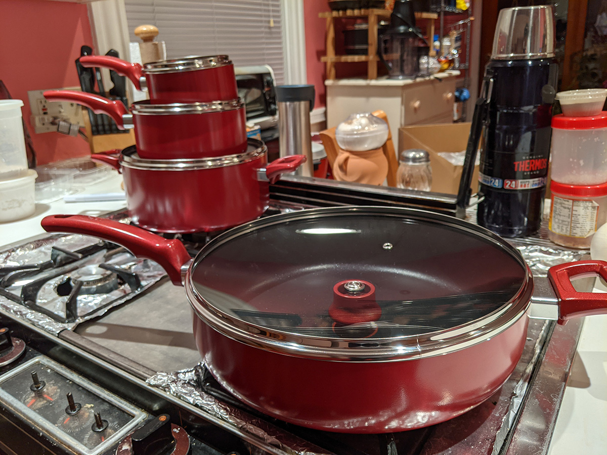 this buys me some time as i can slowly piece together my dream team cookware set: 1qt sauce pan (best size for instant noodles), 2qt sauce pan (for reheating leftovers), 5qt dutch oven (for soups), 6qt wok-style chef pan (the workhorse), 9.5" frying pan (that uses the same lid as the 5qt dutch oven), and a smaller sized frying pan that uses the 2qt lid. the lids have to be glass so i can see inside, and venting would be nice but not required. as for material, i'm partially to the stoneware that's all the rage these days with asian cooks (stoneware is the new ceramic).