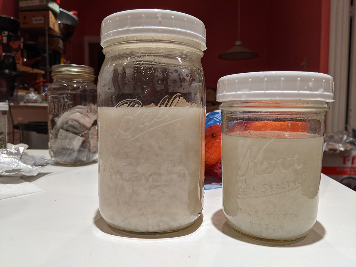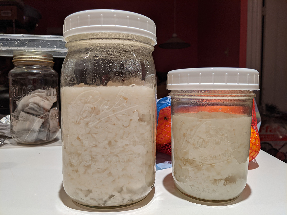 earlier i sanitized some glass jars by cooking them in the microwave (a new way i read about) and boiled their plastic lids and silicone rings. i scooped the jiu niang into two jars. 4 hours later i came back to check, the rice had started to floating to the top. another 4 hours later the separation is even more noticeable. i tried the jiu niang again, it's even sweeter now than before. i also noticed some condensation inside the jars; the fermentation must be producing a little bit of heat.