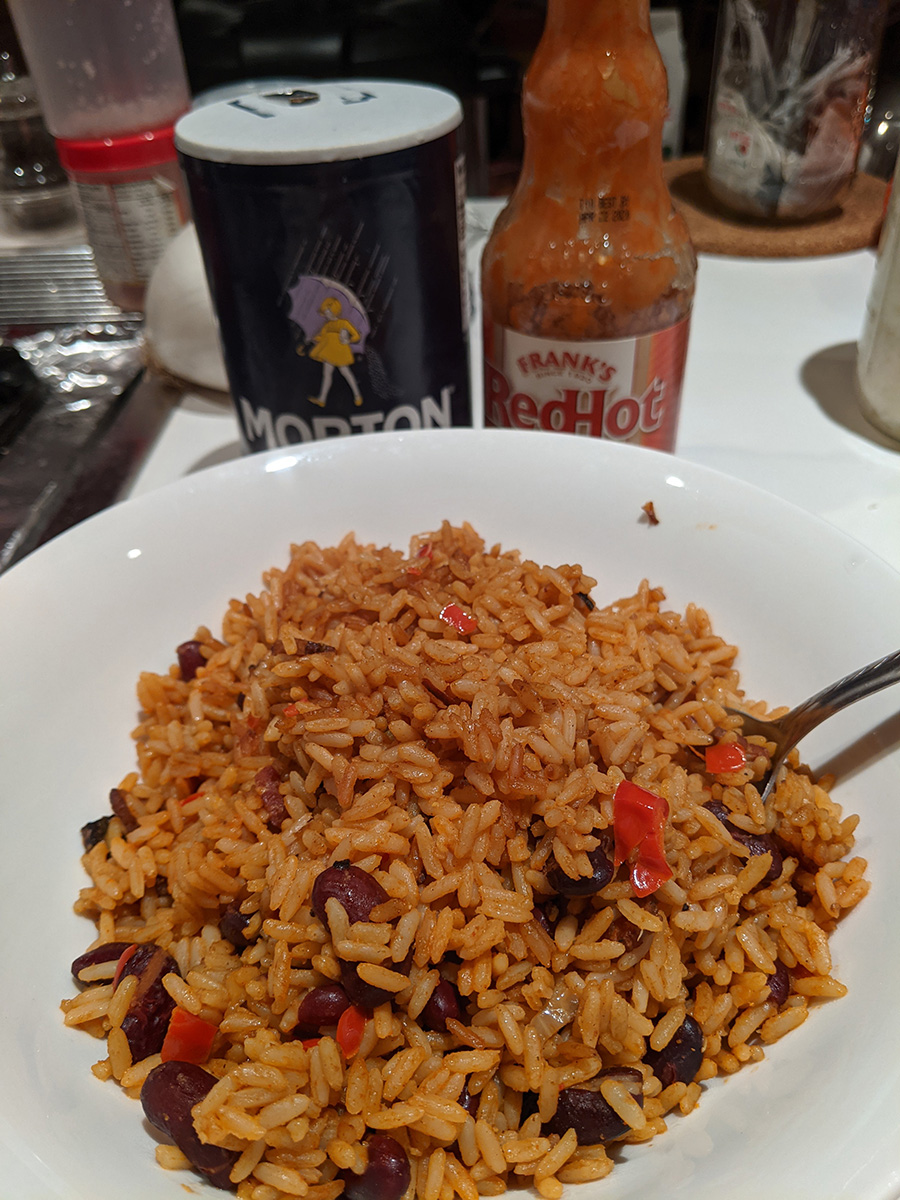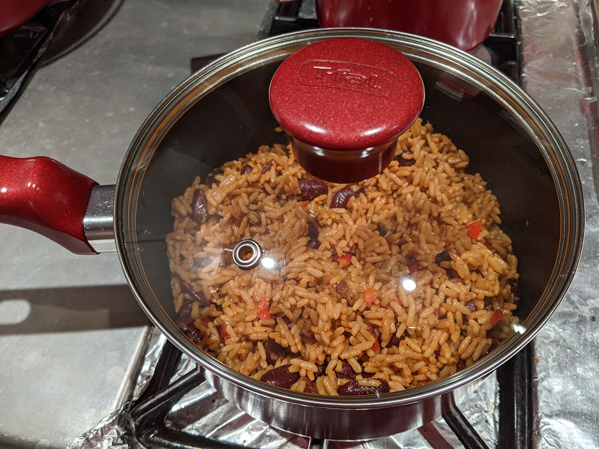 i finally had bruce's rice and beans for dinner. based on his recommendation, i added some salt and hot sauce to make it taste better. i used my t-fal pot for the very first time for cooking (i used it earlier to boil some water to sanitize some lids). brand new non-stick cookware works great, no scorching, food slides around easily. ask me again how they are after a year or two though. originally i was just going to eat half (trying to lose weight after all), but the half portion seemed so measly, i ended up eating the whole container of rice and beans.