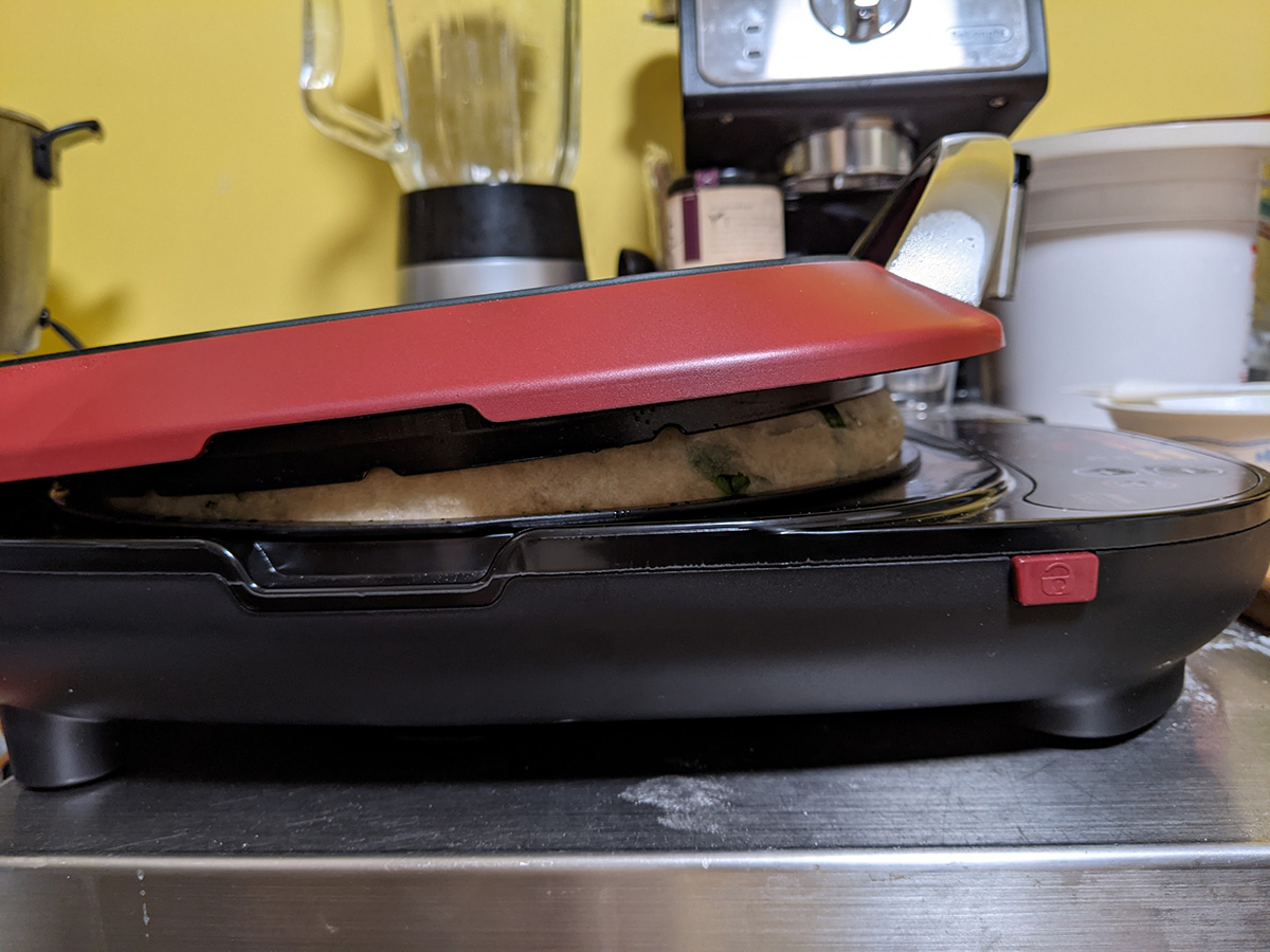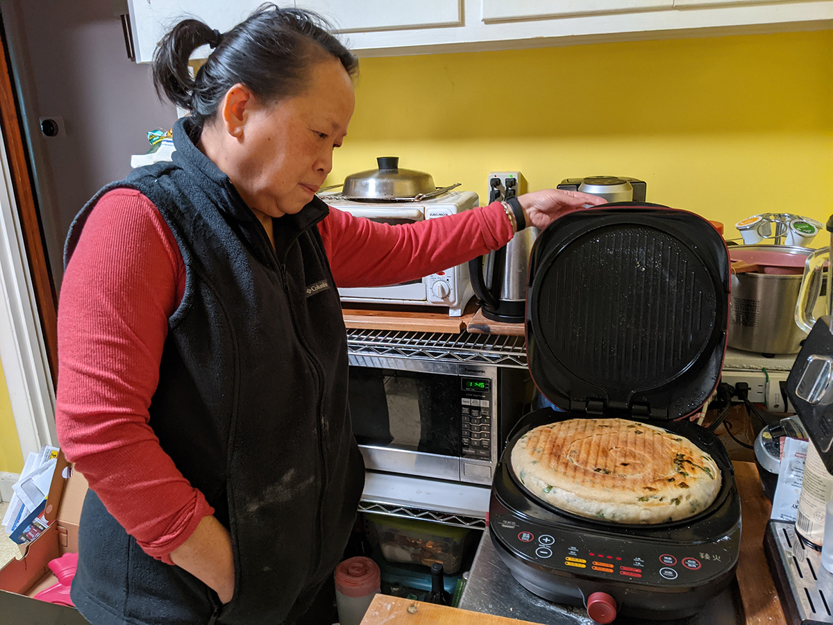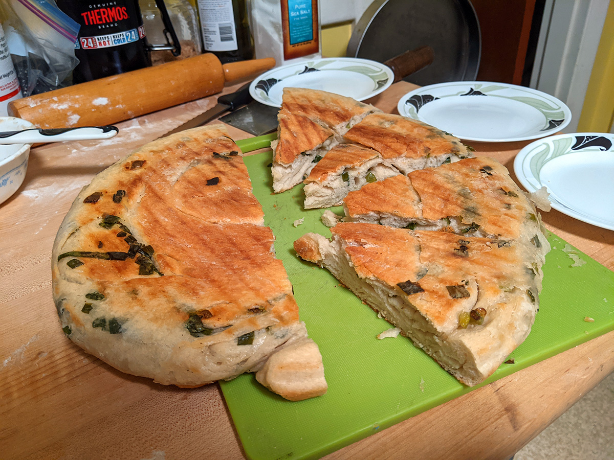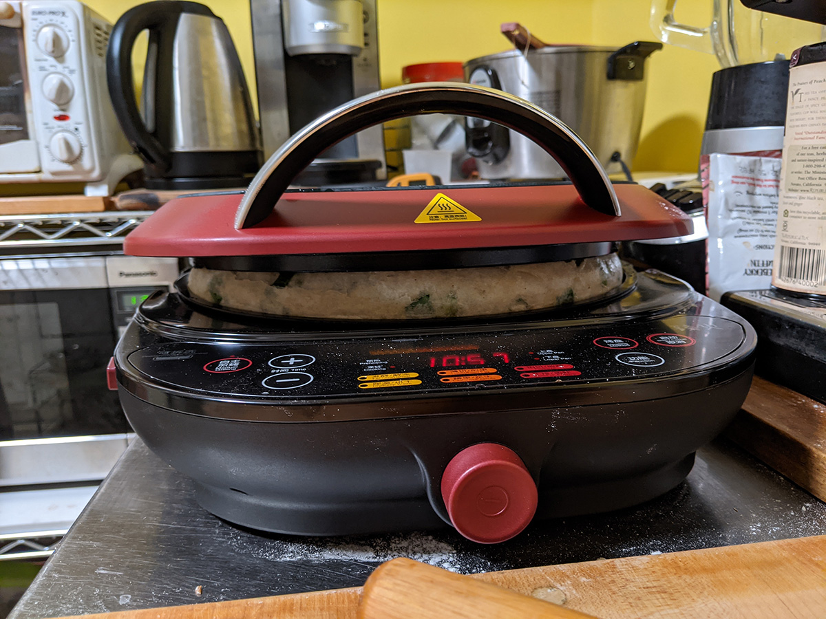 my parents also took another stab at making scallion bed with the electric baking pan. they learned from their mistakes yesterday: more heat, more chopped scallions, more salt. they also had some pepper into the dough. the dough was too much and parts of it was expanding out of the baking pan. the final bread looked like a big pizza. we chopped it up into slices and it was the most delicious bread i've had in a long time, especially fresh from the baking pan as it was still warm. i had two pieces but i could've easily eaten the whole thing, it was that good. my father has made this in the past, but it involved turning it repeatedly in the pan to cook it on both sides. since the baking pan is heated on the top and bottom, we don't have that problem anymore. the only thing that would improve the baking pan is if the top lid had more of a hinge to allow for bigger items; with it's current design, it's not ideal for making thick flat breads.