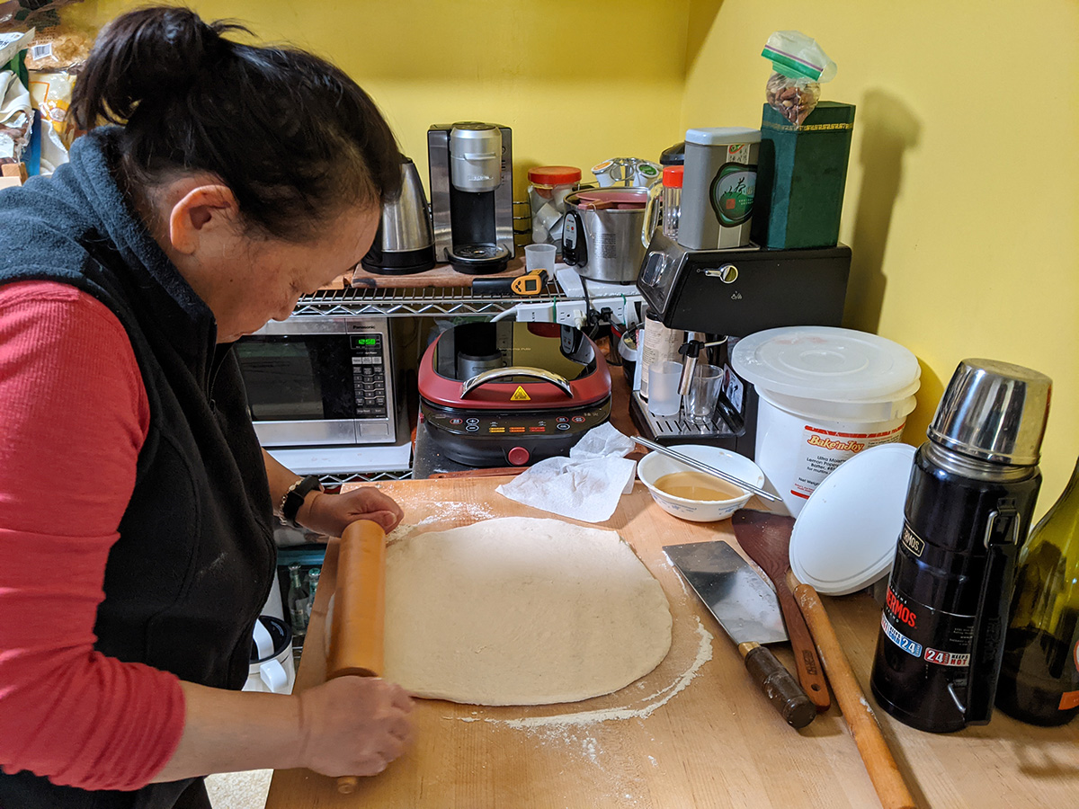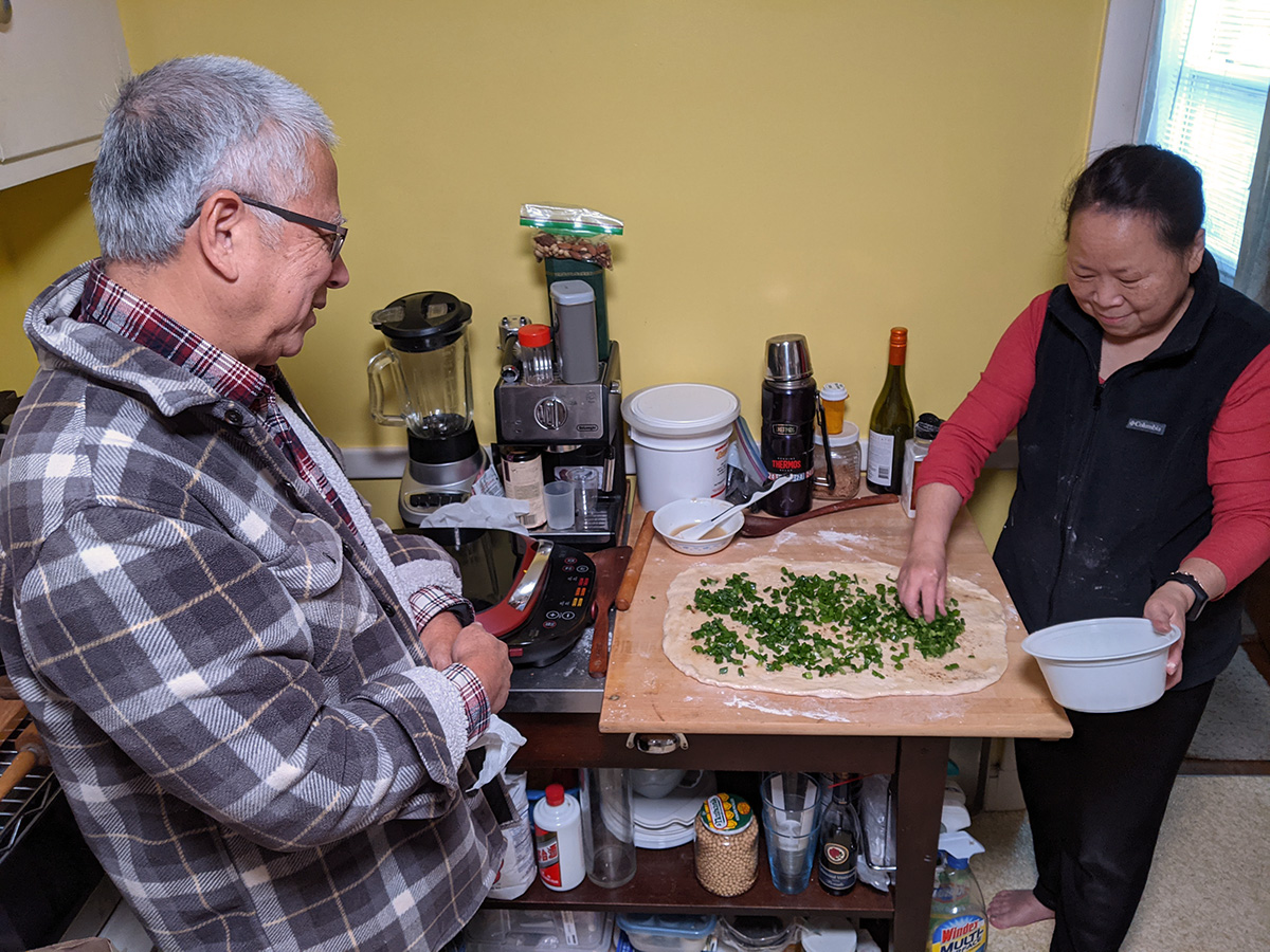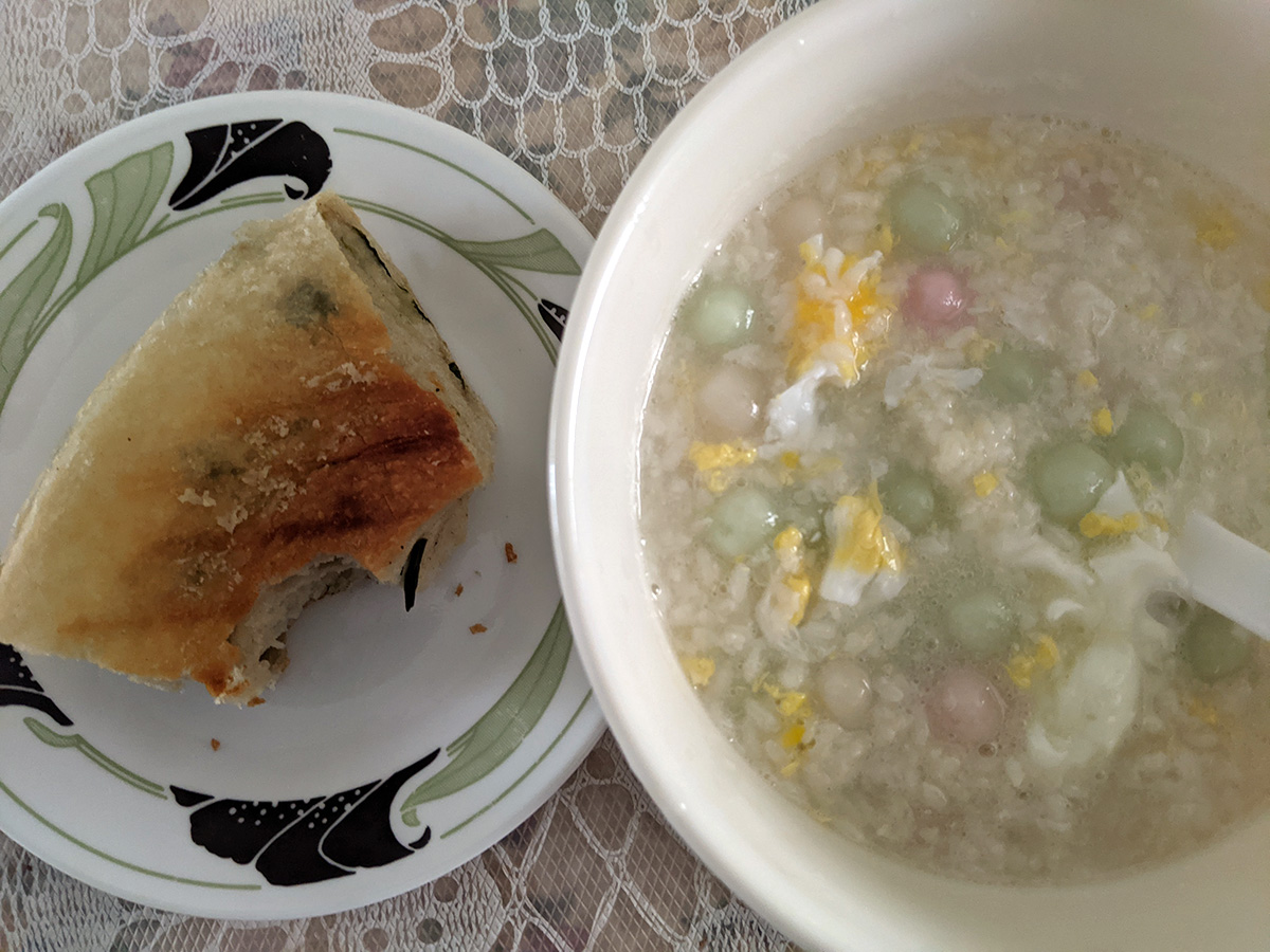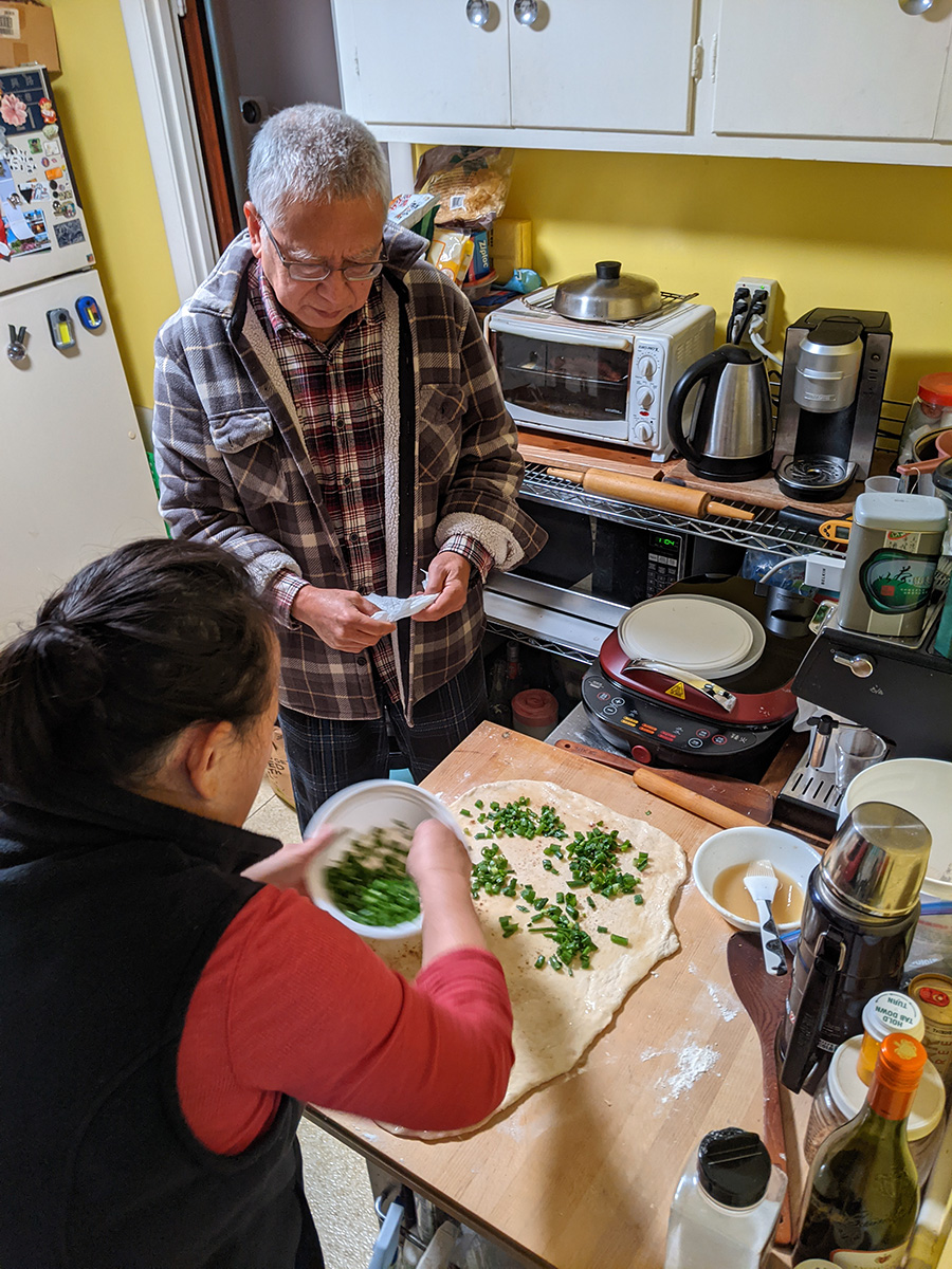 my parents also took another stab at making scallion bed with the electric baking pan. they learned from their mistakes yesterday: more heat, more chopped scallions, more salt. they also had some pepper into the dough. the dough was too much and parts of it was expanding out of the baking pan. the final bread looked like a big pizza. we chopped it up into slices and it was the most delicious bread i've had in a long time, especially fresh from the baking pan as it was still warm. i had two pieces but i could've easily eaten the whole thing, it was that good. my father has made this in the past, but it involved turning it repeatedly in the pan to cook it on both sides. since the baking pan is heated on the top and bottom, we don't have that problem anymore. the only thing that would improve the baking pan is if the top lid had more of a hinge to allow for bigger items; with it's current design, it's not ideal for making thick flat breads.