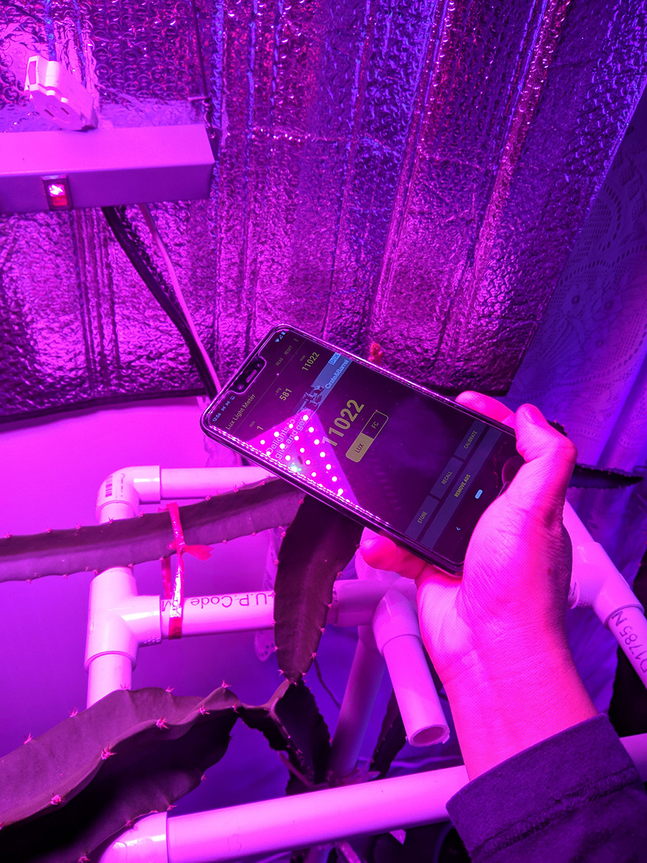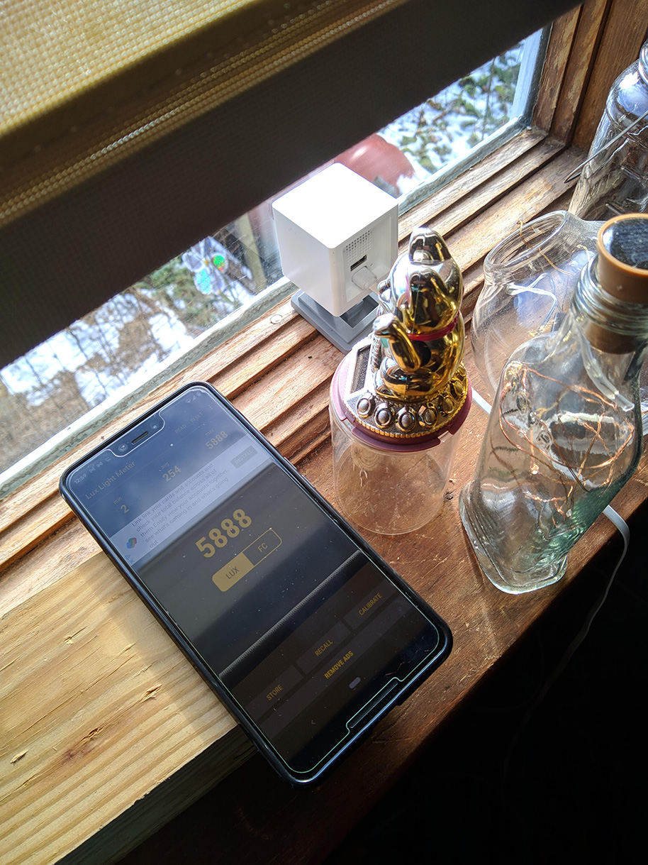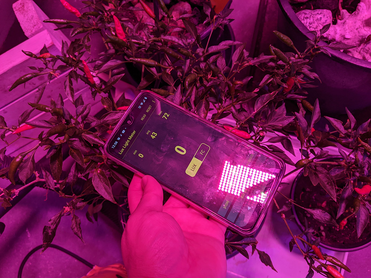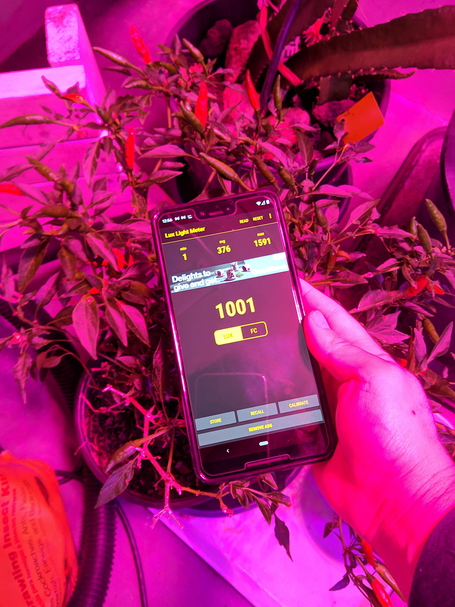 i remember i installed a light meter app on my phone and took some measurements. the values are given in lux, not sure how they relate to lumens (one lux is one lumen per square meter), nor how accurate the values are, but at least i can gauge the light intensity from different areas in the grow room. i went to borrow my father's phone because i wanted to take some photos. went i installed the app on his phone (moto G7 pro), it didn't seem to work so i ended up using my pixel phone to do the reading and the moto phone to take photos instead (later i found out there was oil over the motor G7 light sensor, that's why it wasn't reading properly). directly under a led light source i can get lux readings upwards of 11K. lux below 2500 is considered low light, upwards of 10K medium, and higher than 10K high.