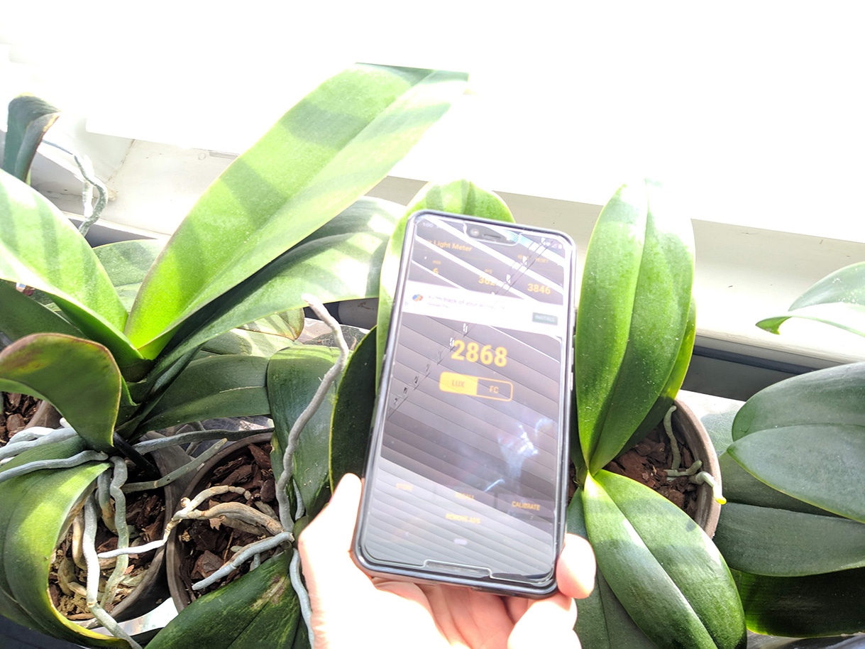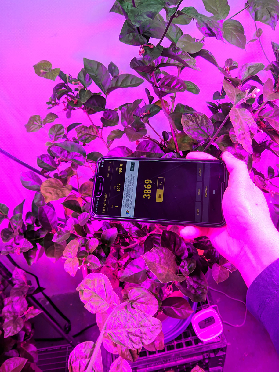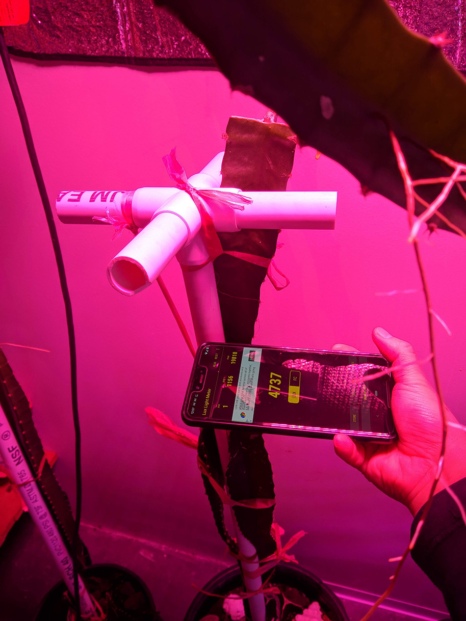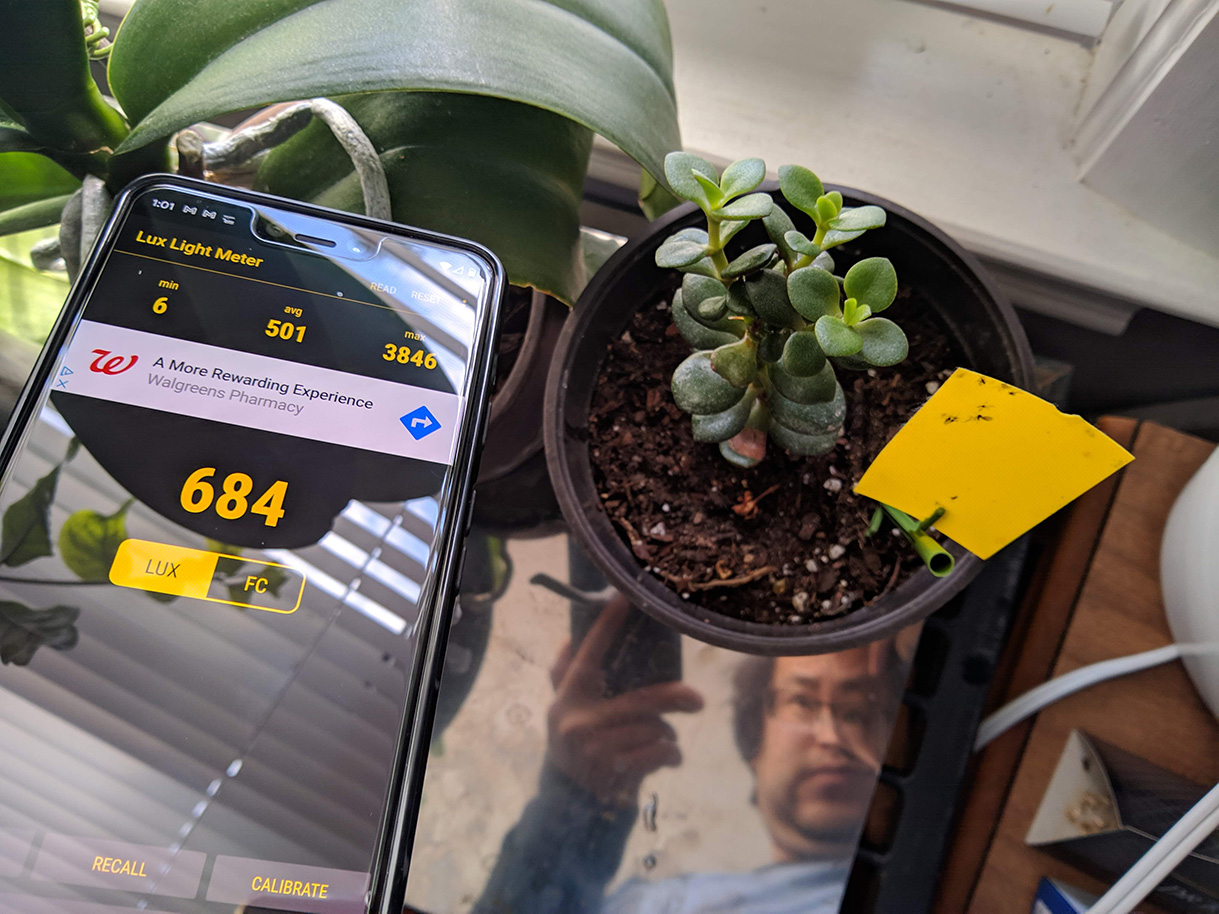 i remember i installed a light meter app on my phone and took some measurements. the values are given in lux, not sure how they relate to lumens (one lux is one lumen per square meter), nor how accurate the values are, but at least i can gauge the light intensity from different areas in the grow room. i went to borrow my father's phone because i wanted to take some photos. went i installed the app on his phone (moto G7 pro), it didn't seem to work so i ended up using my pixel phone to do the reading and the moto phone to take photos instead (later i found out there was oil over the motor G7 light sensor, that's why it wasn't reading properly). directly under a led light source i can get lux readings upwards of 11K. lux below 2500 is considered low light, upwards of 10K medium, and higher than 10K high.