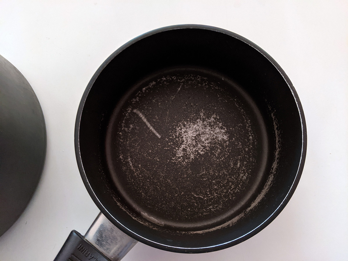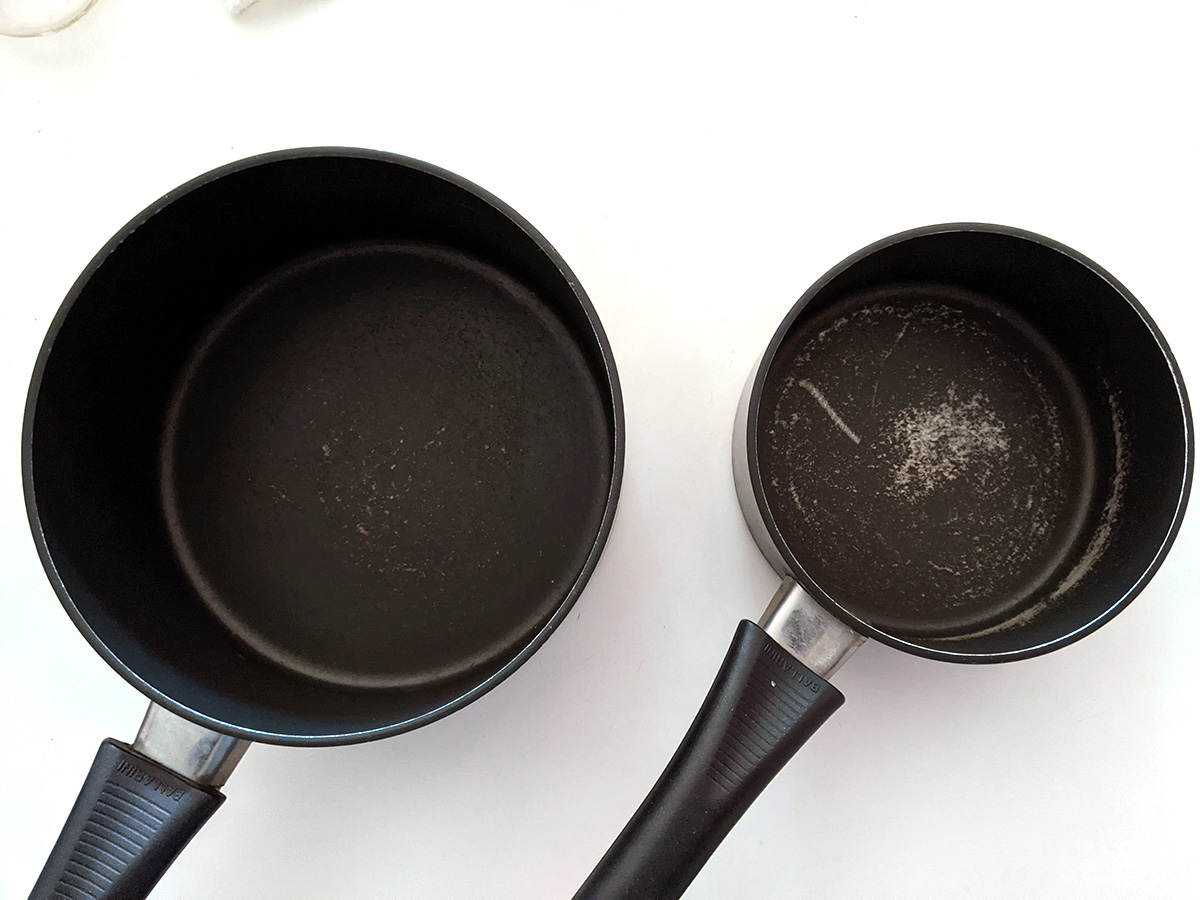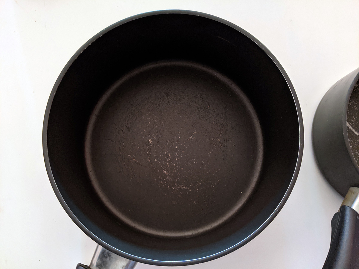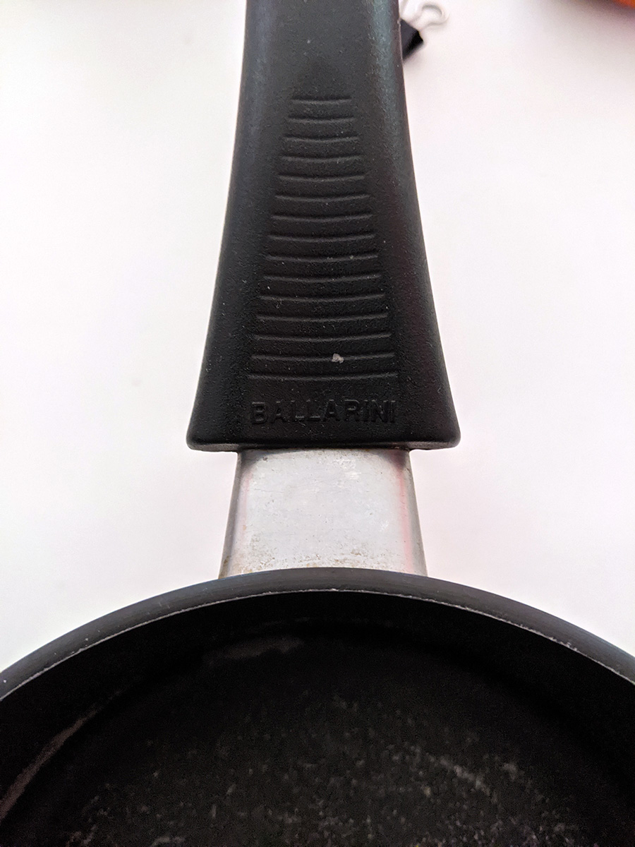 i couldn't bare to throw them out last week, but i'm finally tossing out my 1qt and 2qt ballarini pots. these have served me well for almost 2 decades, but they're too scratched up to safely use anymore. i have my new t-fal set, and although i don't think my new set are the same quality as the ballarini, i simply couldn't continue using my old worn-out pots anymore. i took some final photos before putting them in the trash. i did however save my 5qt dutch oven. that also has scratches, but not as bad, and i may use it for non-food projects like make soap.