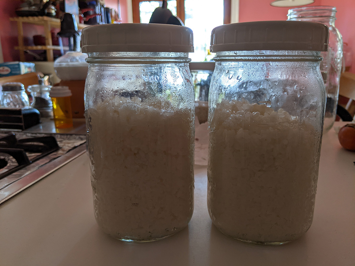 after fermenting in room temperature overnight, i checked the status of my v4 jiu niang this morning. there was hardly any liquids. my father called to tell me to put the jiu niang someplace warm. during the winter there is hardly any place in my house that can be considered warm. i've already wrapped up in the jars in a towel, but i decided to put the jiu niang in a box and move them to the top of the fridge, where temperature there occasionally reaches 70°F (while the rest of my house is 60°F during the daytime). i'm not very confident that slow fermenting will produce good jiu niang. if anything, slow fermenting runs the risk of other bad bacteria taking ahold of the cooked glutinous rice.