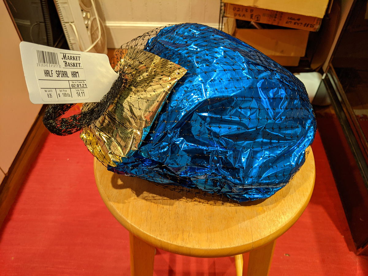 i picked up a christmas ham at market basket. their circular said there was a sale on carando spiral ham at $2.49/lbs, but they also carried market basket brand ham for just $1.69, which is the one that we like. i picked up the ham today because i figured the rest of the week i won't be able to get to MB once the snow begins to fall.