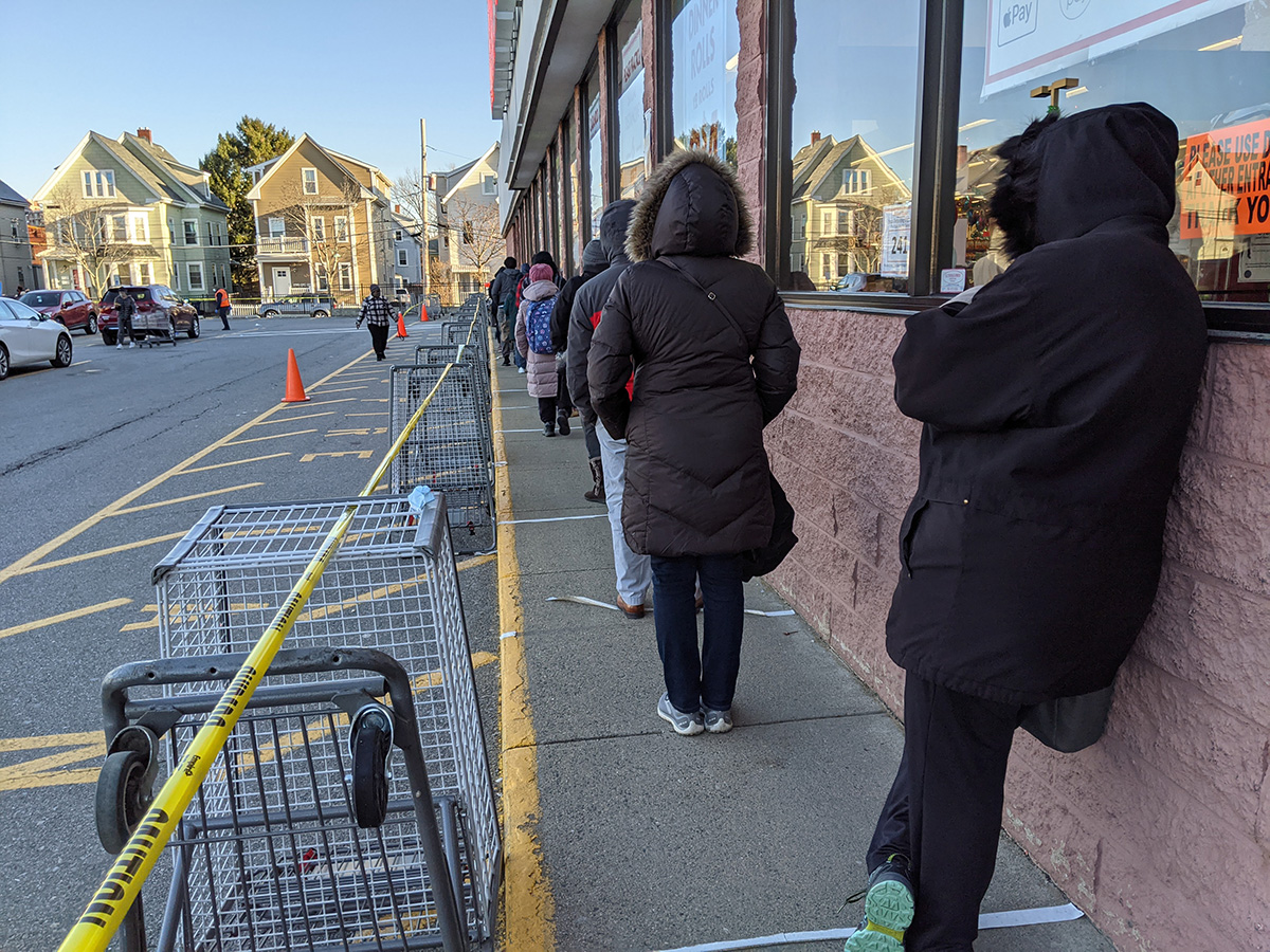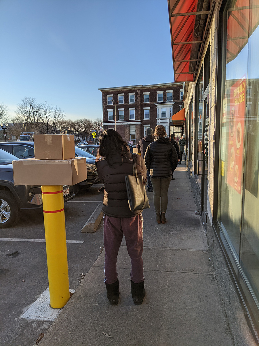 after returning home, i got on my bike and went to market basket. even though my weather station said it was 38°F, it was definitely much colder because there were ice puddles. i was a bit underdressed, and while i was riding there, i thought, "wouldn't it suck if i had to wait in line to get inside?" sure enough that's what exactly happened. i wasn't angry because it's the right thing to do as market basket is normally crazy before snowstorms and the holidays, so this was just preemptive crowd control. but i only had a light jacket and there were 20 people ahead of me in line while we waited in the shadows. i bumped into my 2nd uncle - i probably see him more than anyone else in my family besides my 2nd aunt - who was there to return some cans before getting in line himself. i heard him reciting bible verses in english to no one in particular behind me in line.