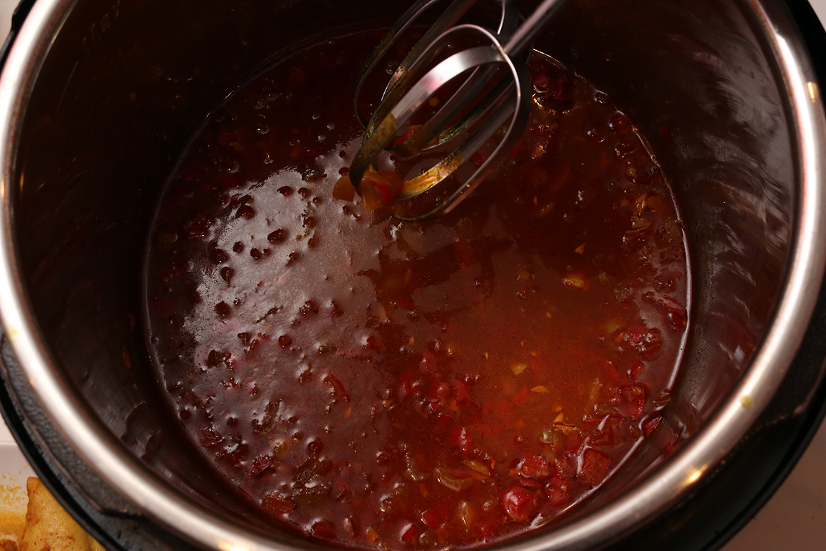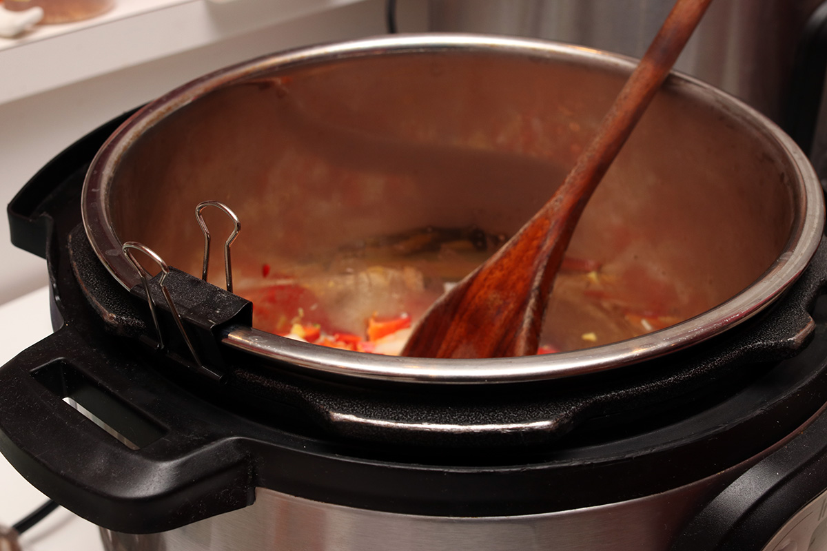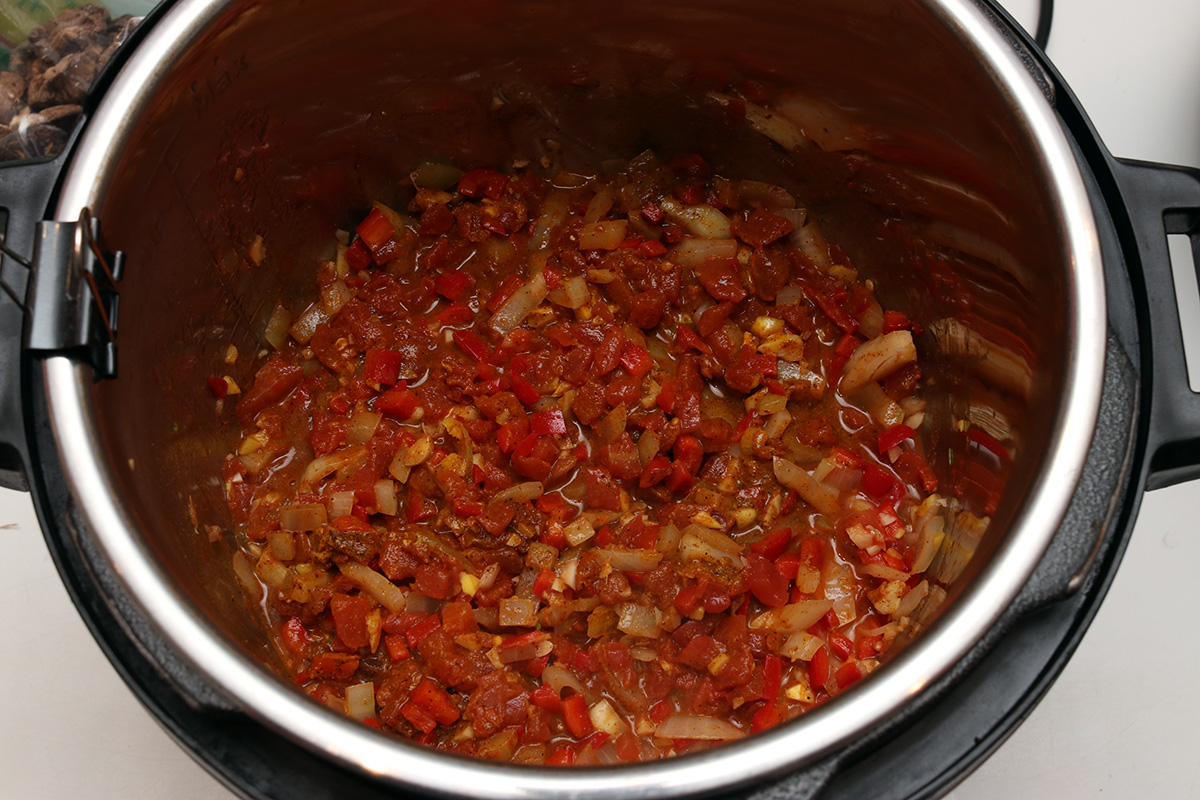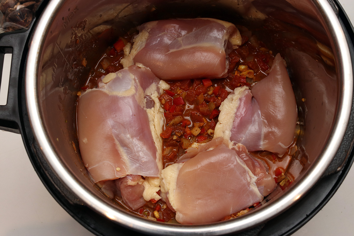 urvashi's butter chicken doesn't call for onions but i added it anyway. she also doesn't sautée her vegetables but i did just to release some of the flavors. i used a binder clip to hold the inner pot in place so it wouldn't move around when i stirred, a tip i learned online. i used almost 1.5 lbs. of boneless skinless chicken thighs, but it didn't seem like enough, and i could've easily added the other half. when it finished pressure cooking, i removed the chicken and used my hand mixer to blend the remaining ingredients into a sauce. the recipe calls for an immersion blender which i don't have. using a hand mixer meant there was some splattering and the sauce would still be chunky. while i mixed, i added the half & half (recipe called for heavy cream), butter, and another teaspoon of garam masala.