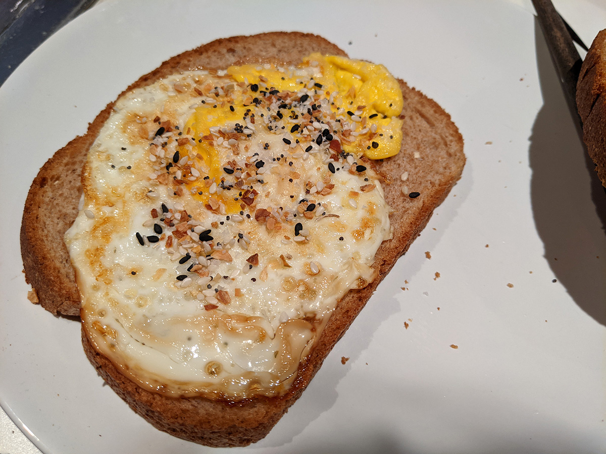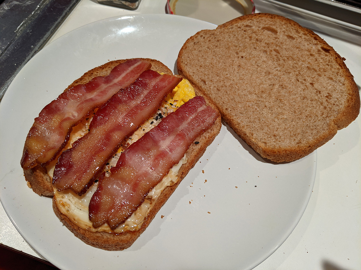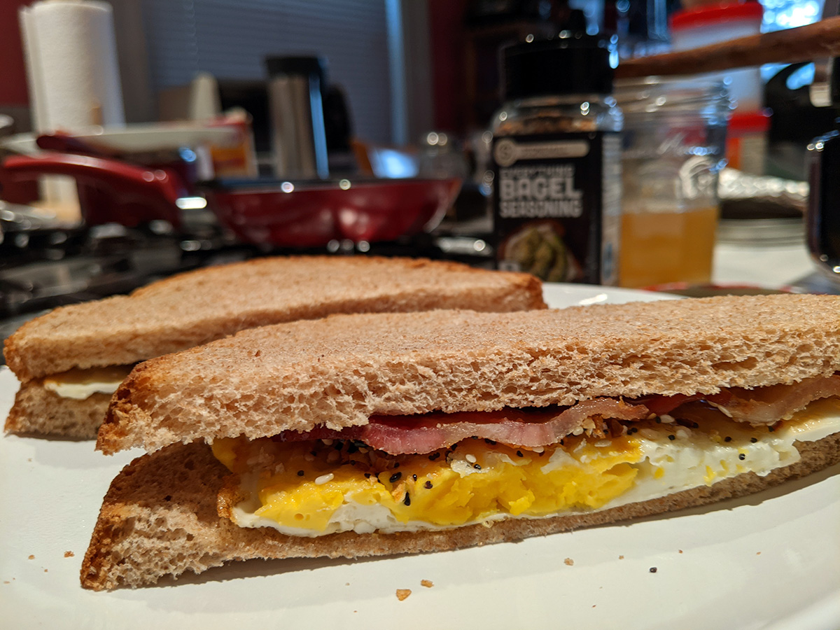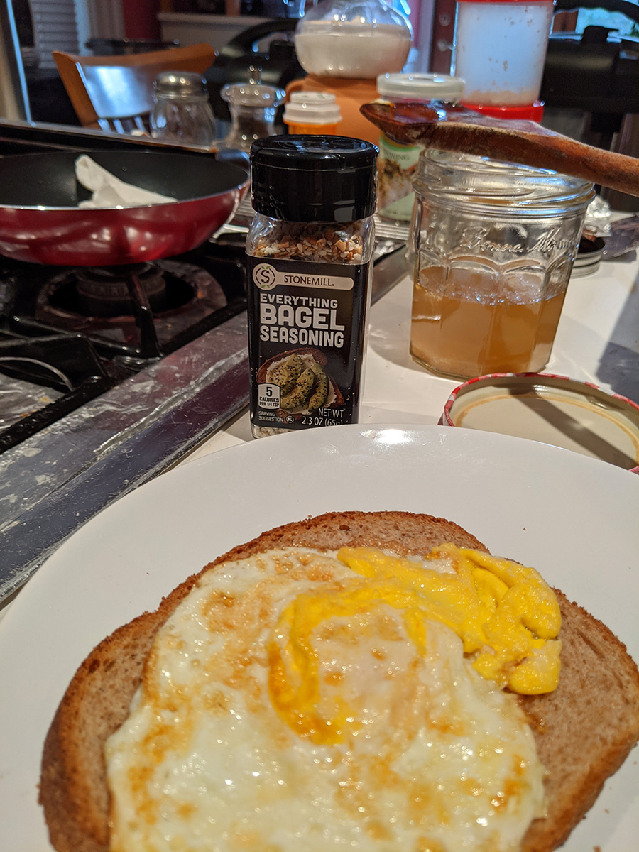 when i returned home by 12:45pm, i decided i would cook my package of bacon outside on my smokeless foreman grill. i cooked them in two batches as i watched the delicious bacon smoke billow away into the sky from inside the house. once they were done, i made a bacon & egg sandwich. the sandwich was flat but delicious based solely on the addition of aldi's everything bagel spices i got a while back and was finally trying it now. i thought it was just some sesame and poppy seeds, but there are also sea salt and fried garlic and other deliciousness. i think the sandwich would be even more delicious if i add some avocado, but the one i bought on tuesday still isn't ripe enough to eat yet. i saved the bacon grease and actually cooked the egg in some of it.