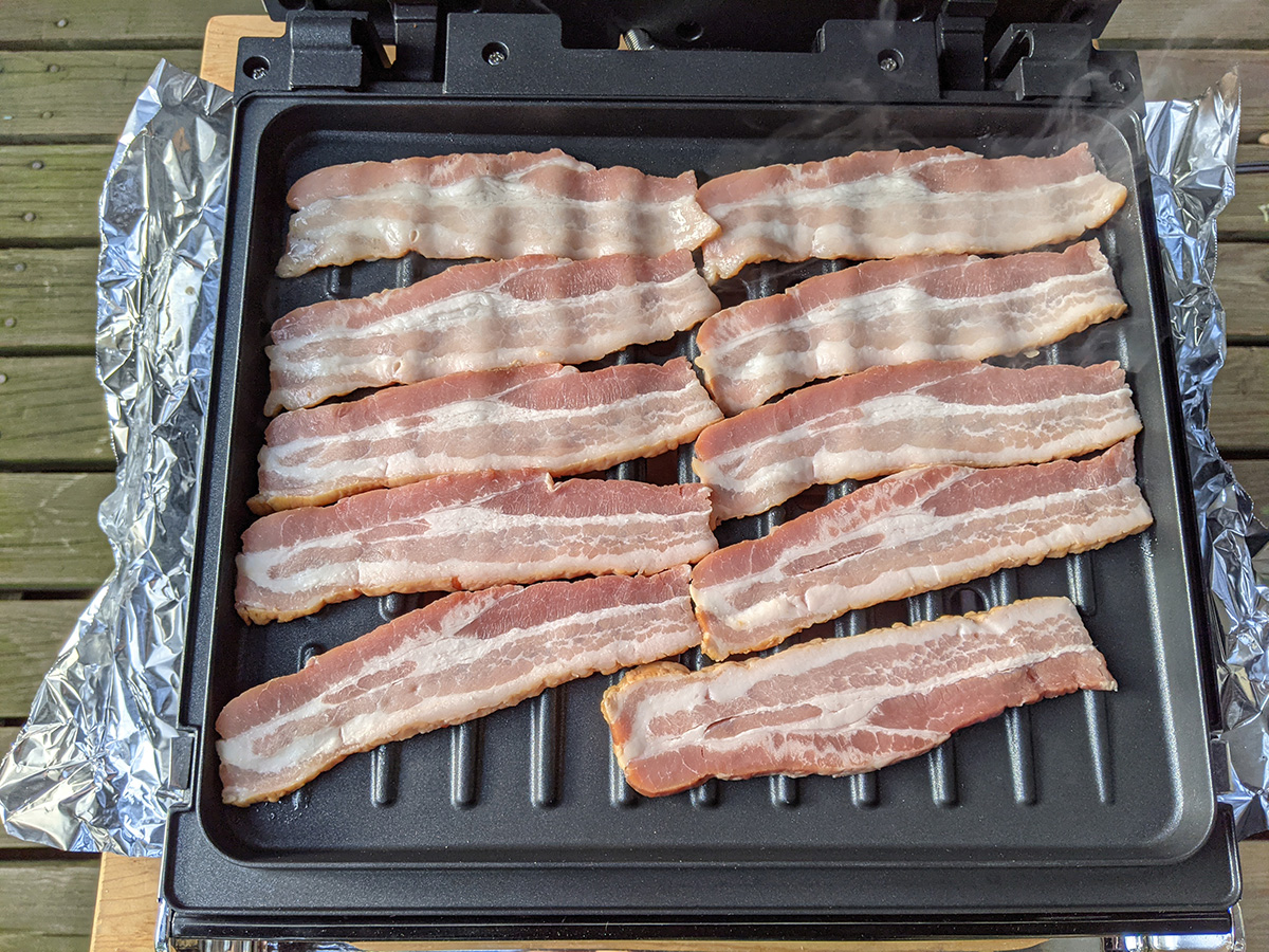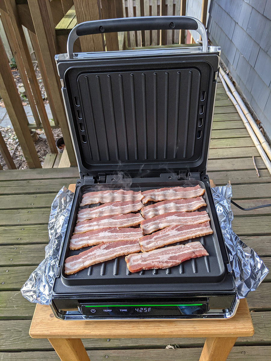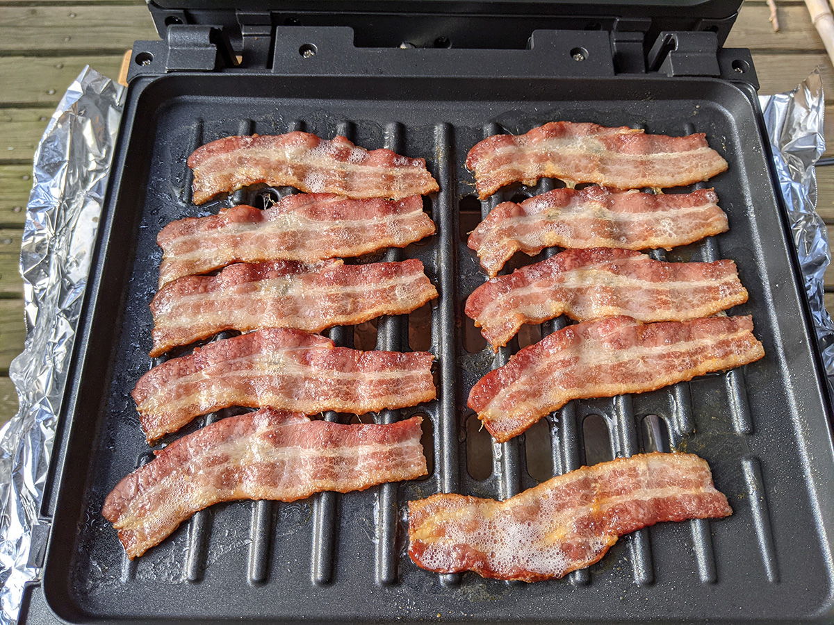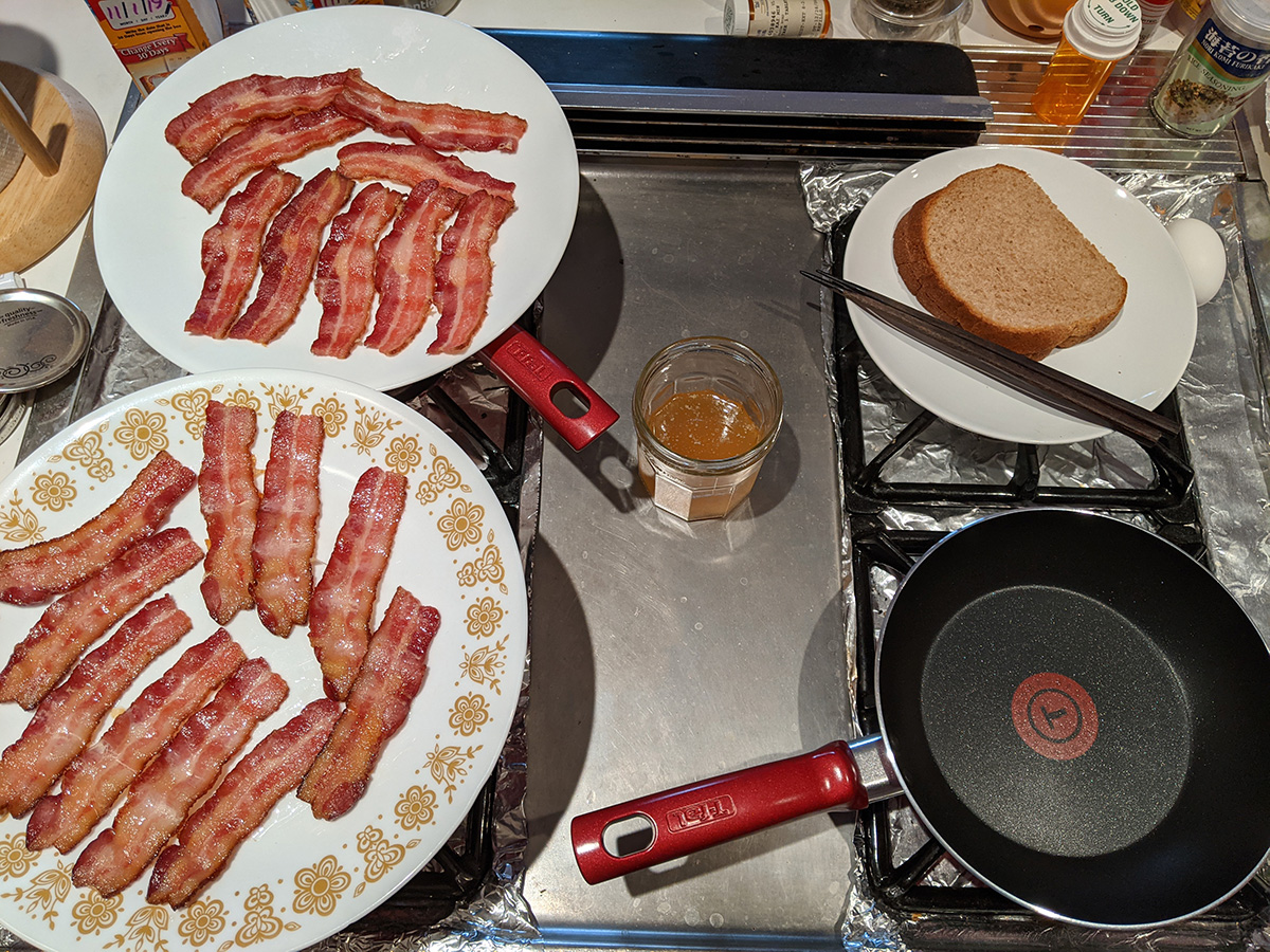 when i returned home by 12:45pm, i decided i would cook my package of bacon outside on my smokeless foreman grill. i cooked them in two batches as i watched the delicious bacon smoke billow away into the sky from inside the house. once they were done, i made a bacon & egg sandwich. the sandwich was flat but delicious based solely on the addition of aldi's everything bagel spices i got a while back and was finally trying it now. i thought it was just some sesame and poppy seeds, but there are also sea salt and fried garlic and other deliciousness. i think the sandwich would be even more delicious if i add some avocado, but the one i bought on tuesday still isn't ripe enough to eat yet. i saved the bacon grease and actually cooked the egg in some of it.