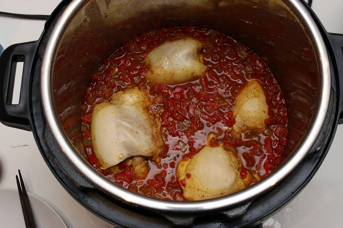 | cook 1 cup basmati rice in rice cooker. sautée vegetable ingredients with butter in instant pot on high temperature. add can of diced tomatoes and remaining dry spices. layer chicken on top and cook on high pressure 10 minutes. wait 10 more minutes before releasing pressure. remove thighs. stir in half & half, butter, garam masala with handmixer. add back cut up chicken. served over basmati rice with chopped cilantro. | |