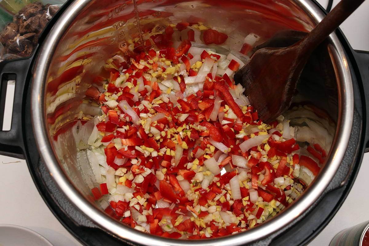 7-8 garlic cloves, chopped 1/2 sweet onion, chopped 2 tsp ginger, minced 1 red bell pepper, chopped 1 tbsp salted butter