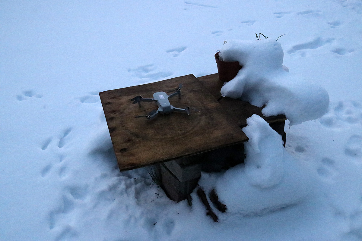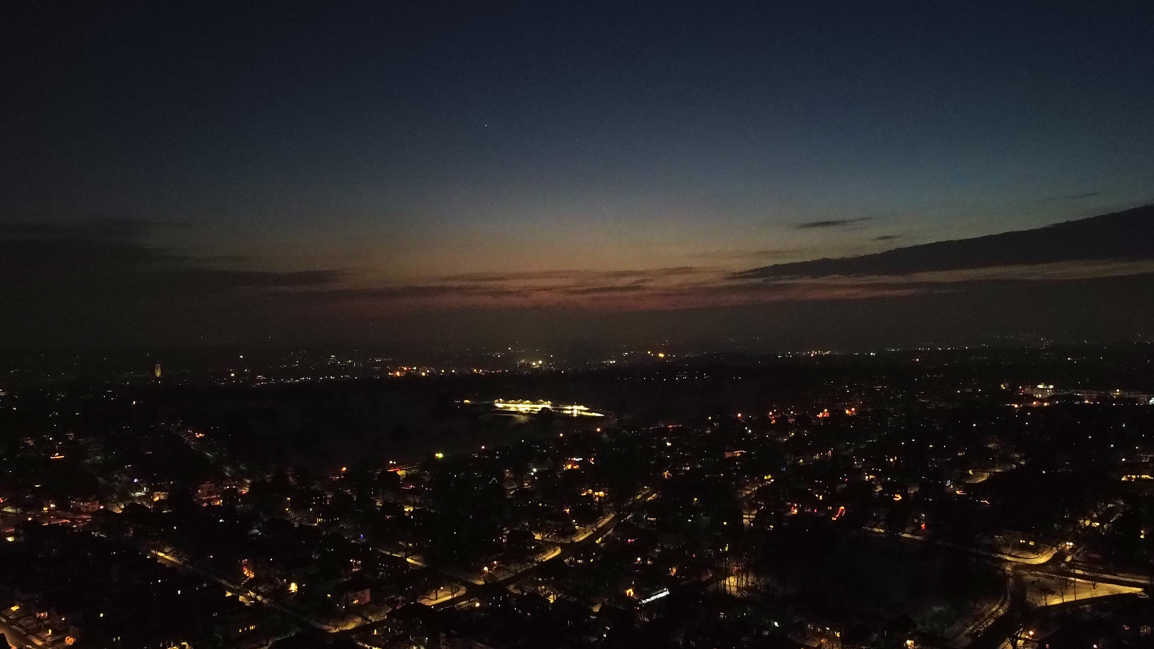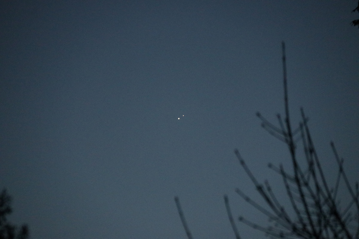only then did we spot the conjunction on the horizon, we could see it from the backyard easily (no drone required). using my telephoto lens i could resolve the single shiny star as two "stars" and the same could be seen through the binoculars. i sent up the drone again (this time with a fresh battery) but it still wasn't able to see the conjunction. only when i put it in video mode it the star finally show up, something to do with the exposure setting. i took a few photos using the manual setting on the drone, where i basically couldn't only change the ISO, shutter speed, and exposure compensation. only then did i bring down the drone, landing it carefully in the dark (i didn't want to catch it with my hand being that i could barely see the drone).