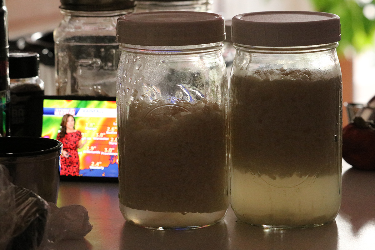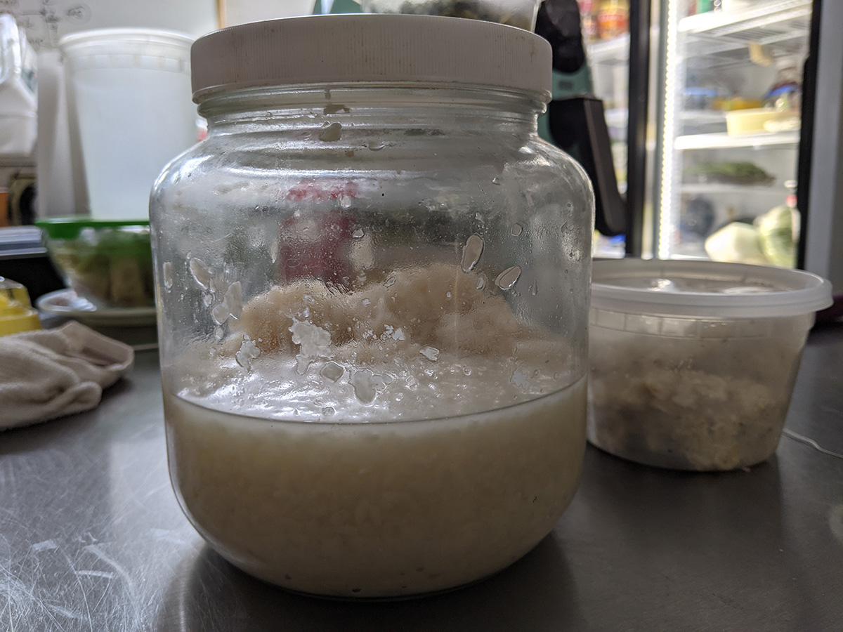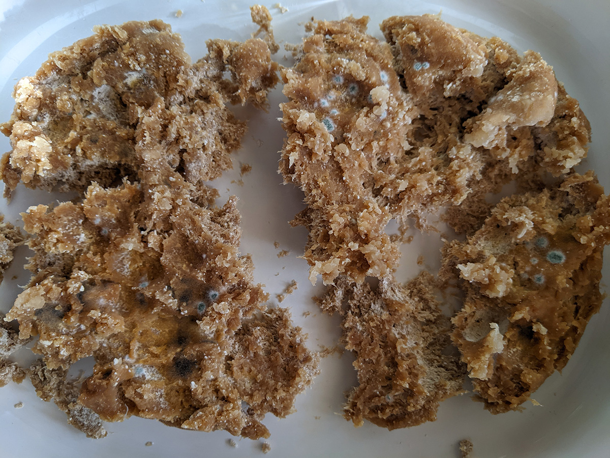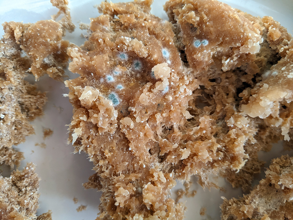 my father had a container of dried up leftover glutinous rice that he was going to try and turn into starter culture. unfortunately leaving it out in the open attracts other bacteria and it's gotten moldy and can no longer be used for jiu niang fermentation.