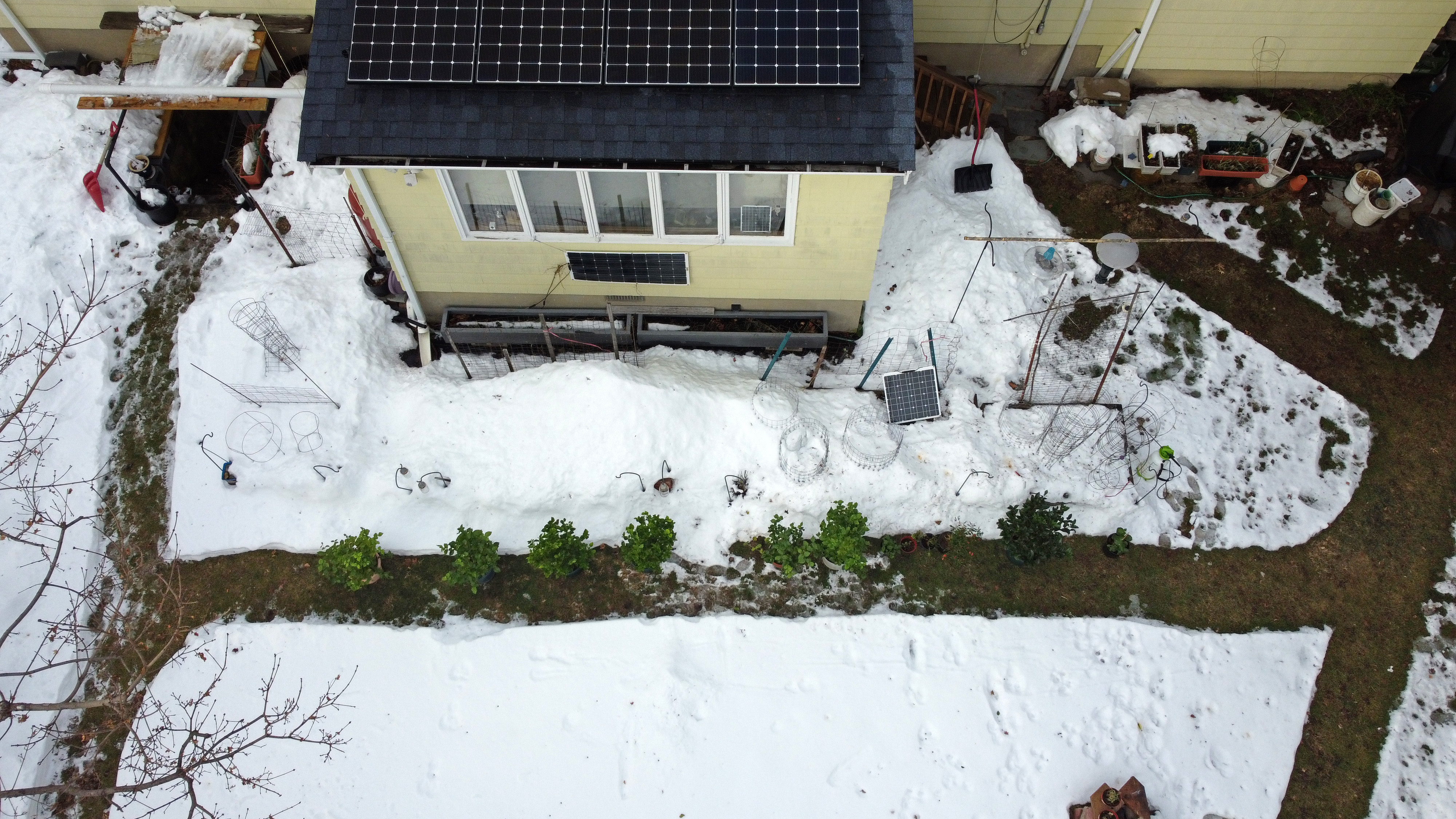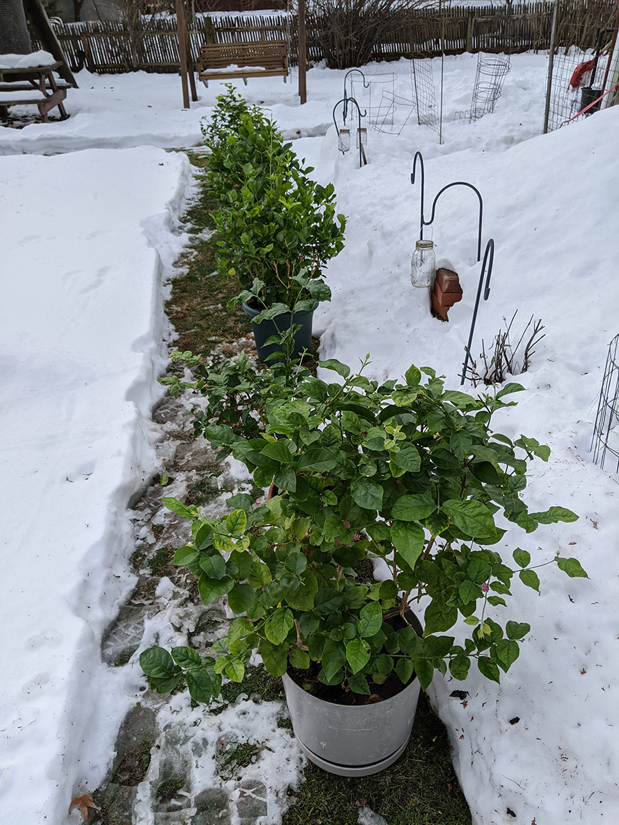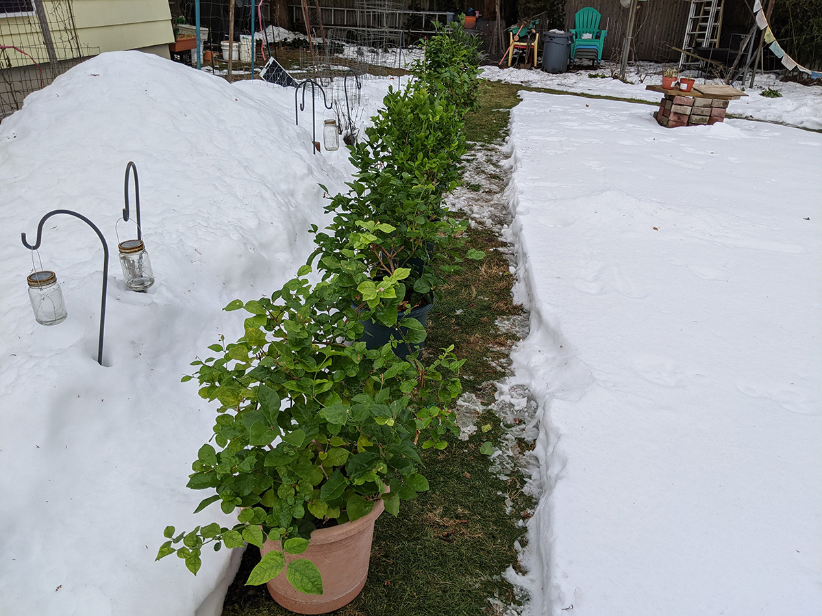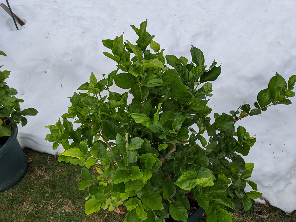 whenever i have the chance i like to fly the drone, and today was no exception, i quickly set it up in the backyard and had it airborne so i could take some photos and videos of all the plants in the snow, not something you see everyday. only then did i mix up a quart solution of neem oil extract and gave the plants a good dousing. of these plants, only the jasmine in the terracotta pot and the small potted jasmine in the black plastic container had mealybugs, the rest were bug free, not even aphids.