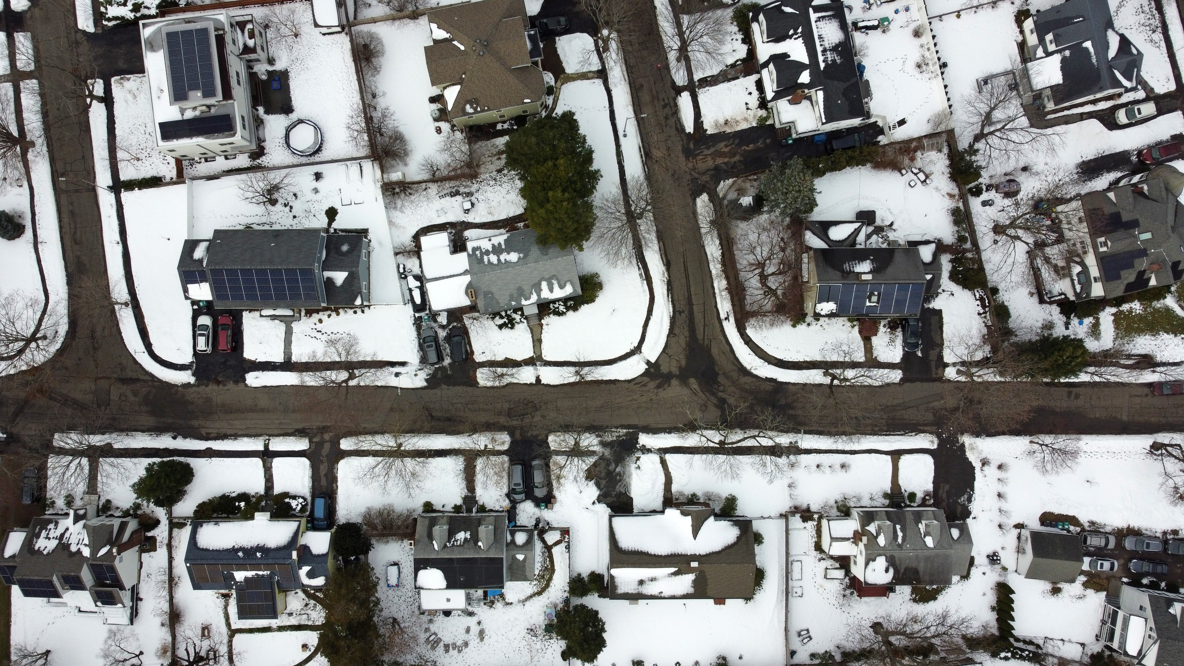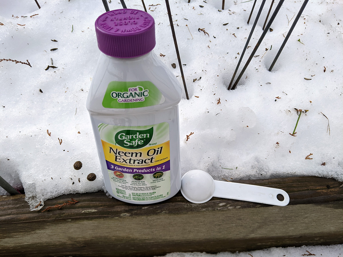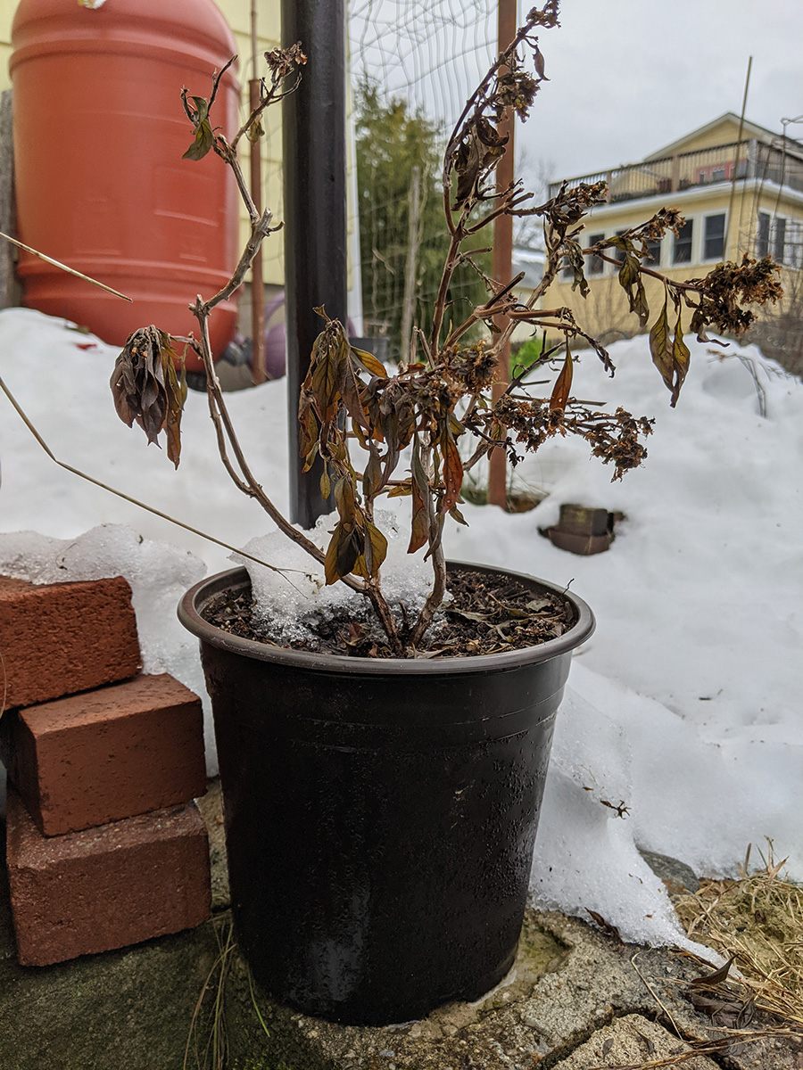 whenever i have the chance i like to fly the drone, and today was no exception, i quickly set it up in the backyard and had it airborne so i could take some photos and videos of all the plants in the snow, not something you see everyday. only then did i mix up a quart solution of neem oil extract and gave the plants a good dousing. of these plants, only the jasmine in the terracotta pot and the small potted jasmine in the black plastic container had mealybugs, the rest were bug free, not even aphids.